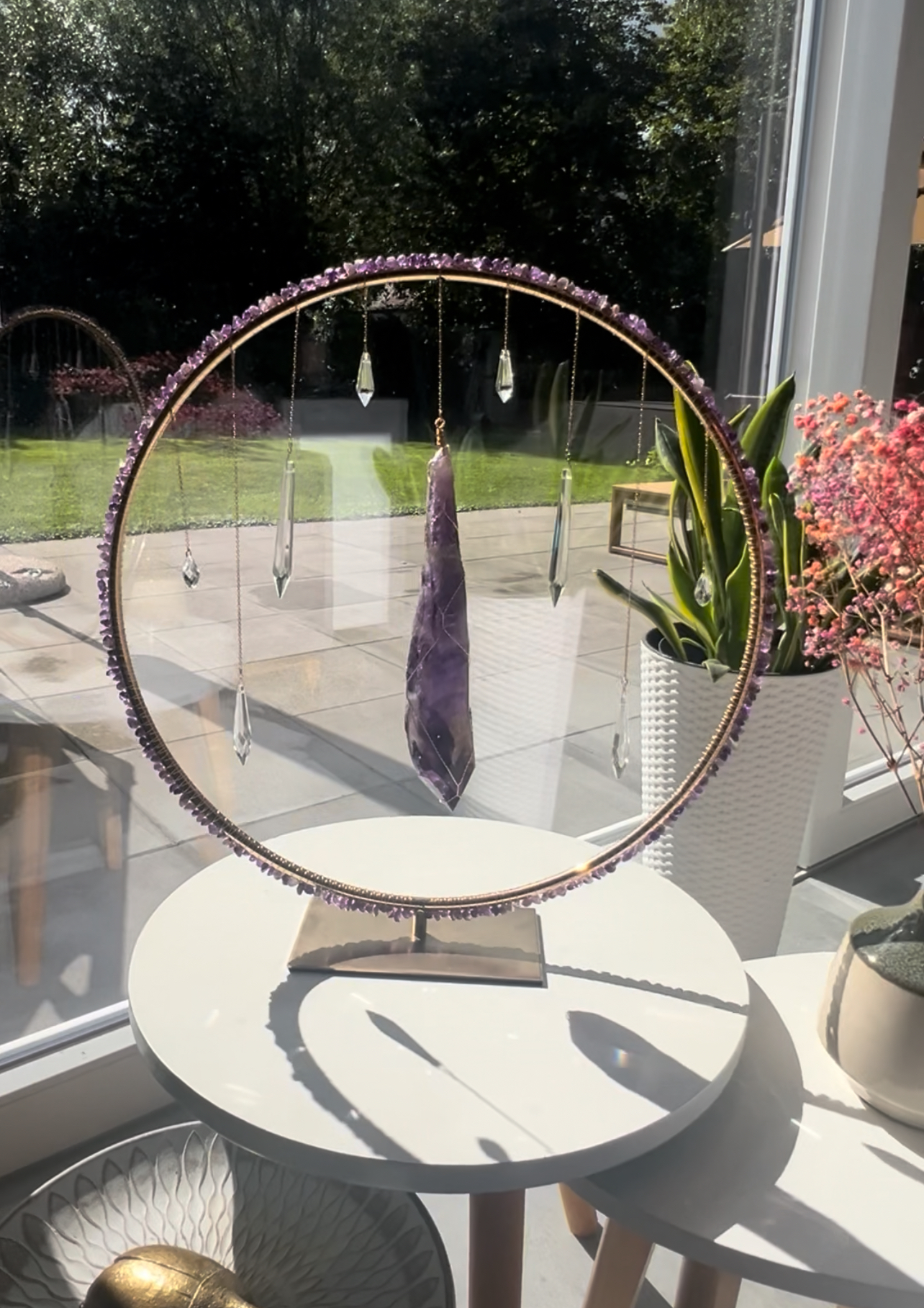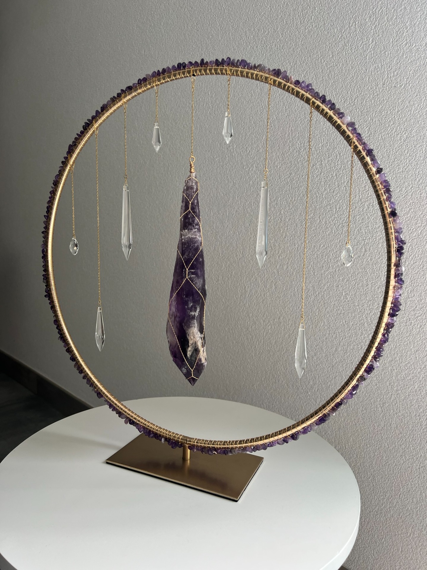 L'arche, ornée d'un cercle d'éclats d'améthyste naturelle, capte la lumière et diffuse des reflets violets empreints de sérénité et de mystère.