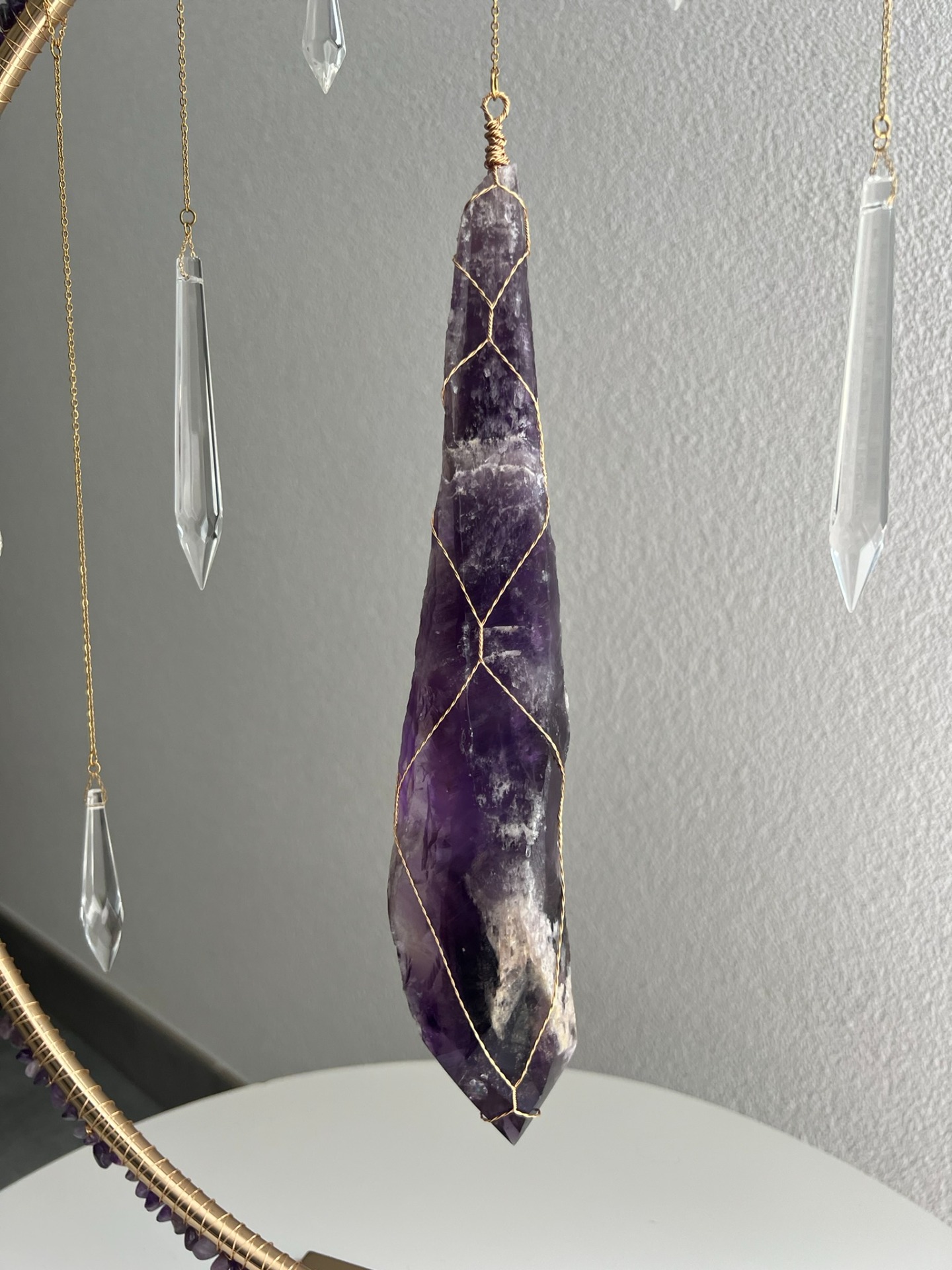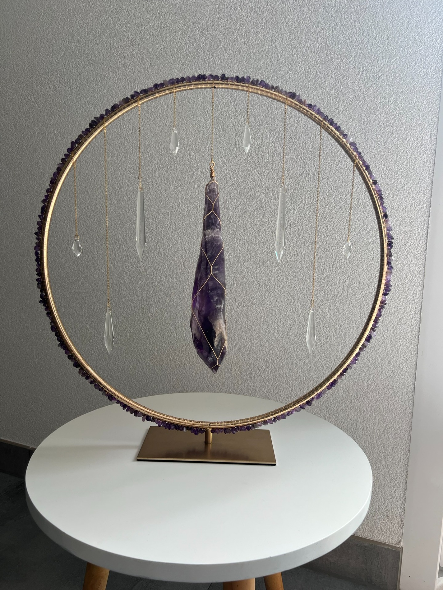 Cette majestueuse création met en valeur une impressionnante améthyste brute en forme de dent de dragon (env. 500 g), suspendue au cœur d'une arche circulaire d'environ 48 cm de diamètre et 50 cm de hauteur (socle inclus).