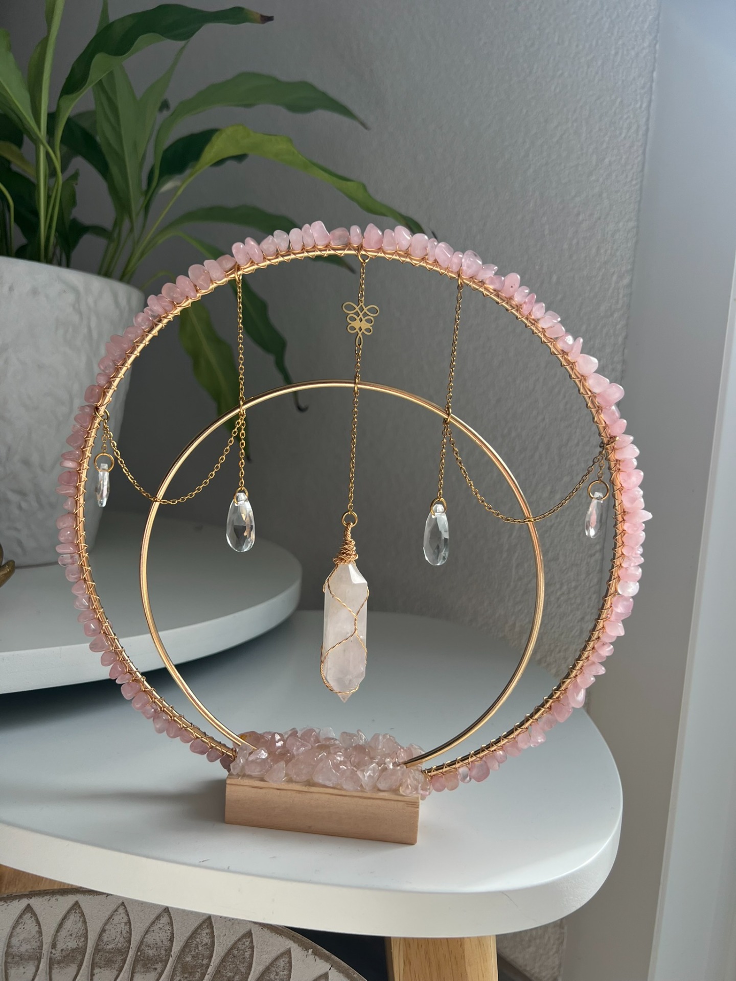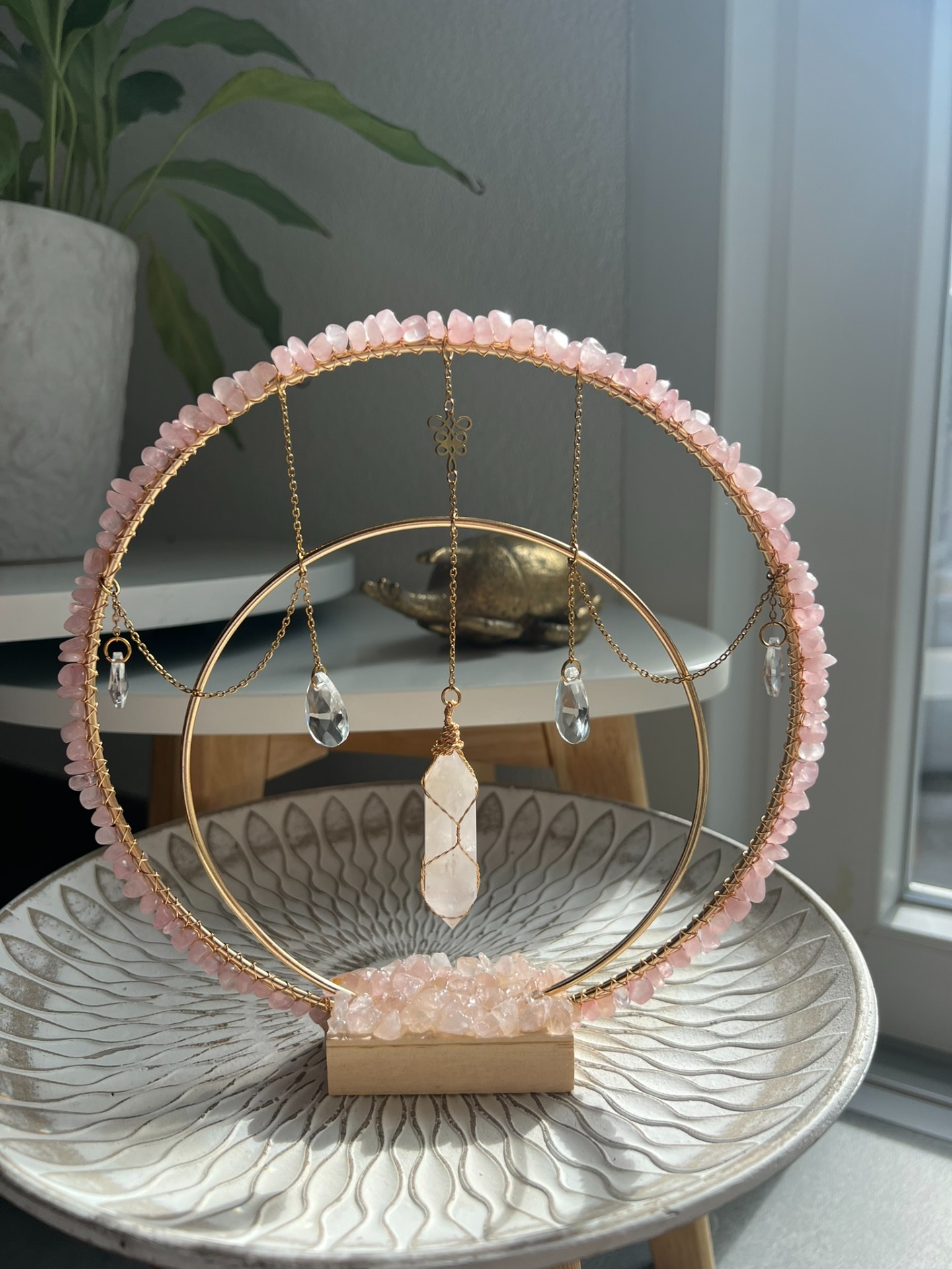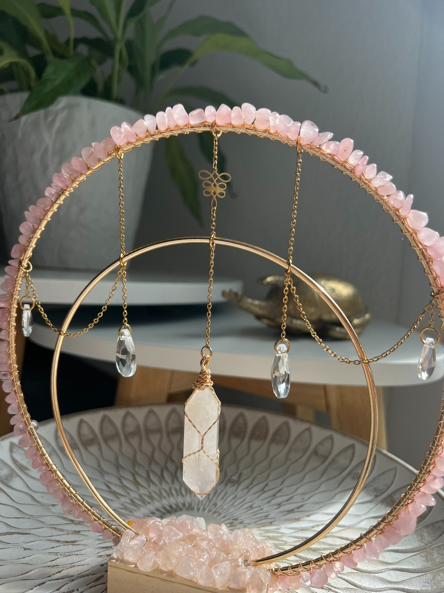 Son cercle doré, orné d'éclats de quartz rose, accueille au centre un cristal taillé et suspendu, capturant les rayons du soleil pour diffuser une lueur apaisante et réconfortante.