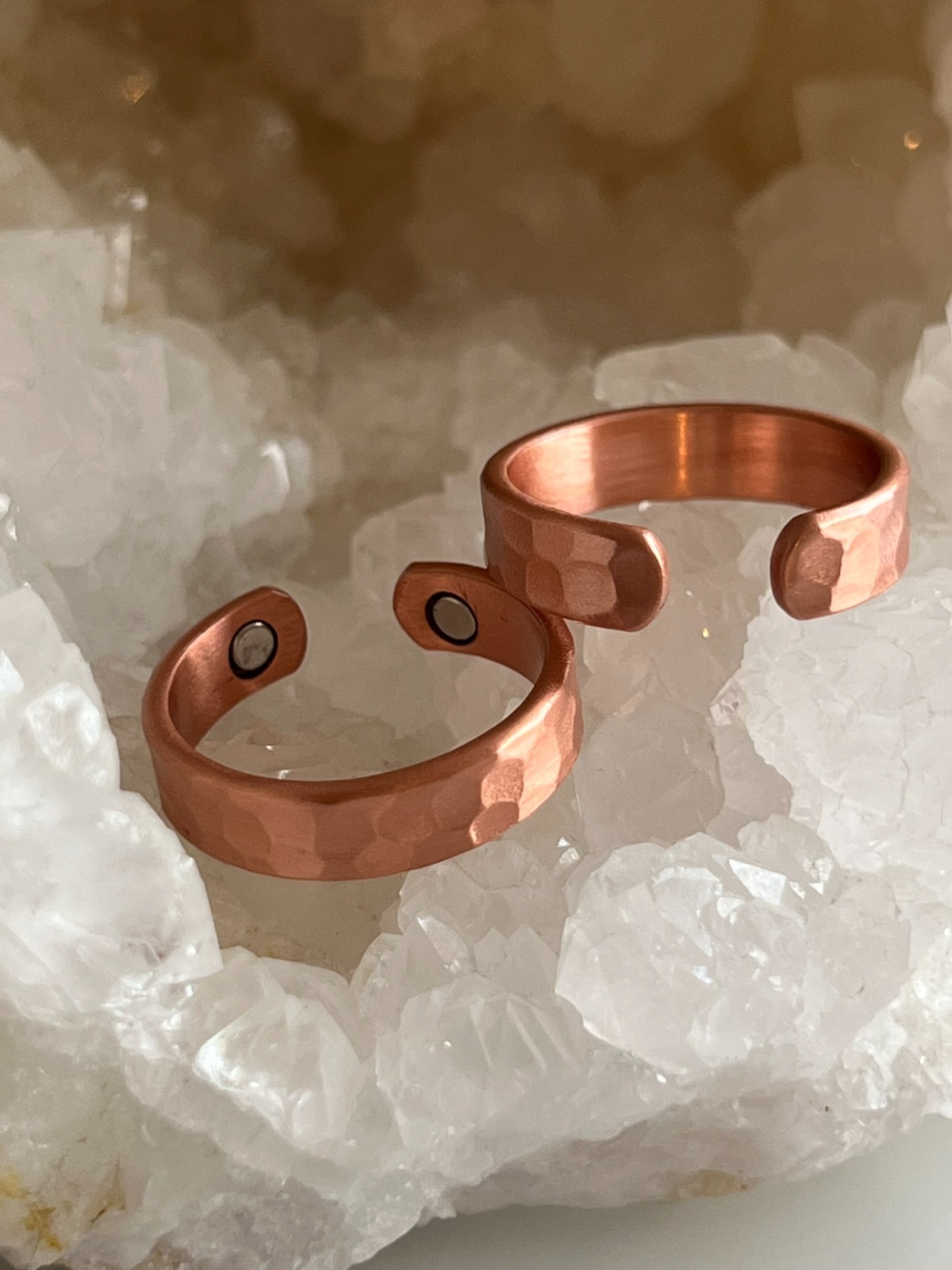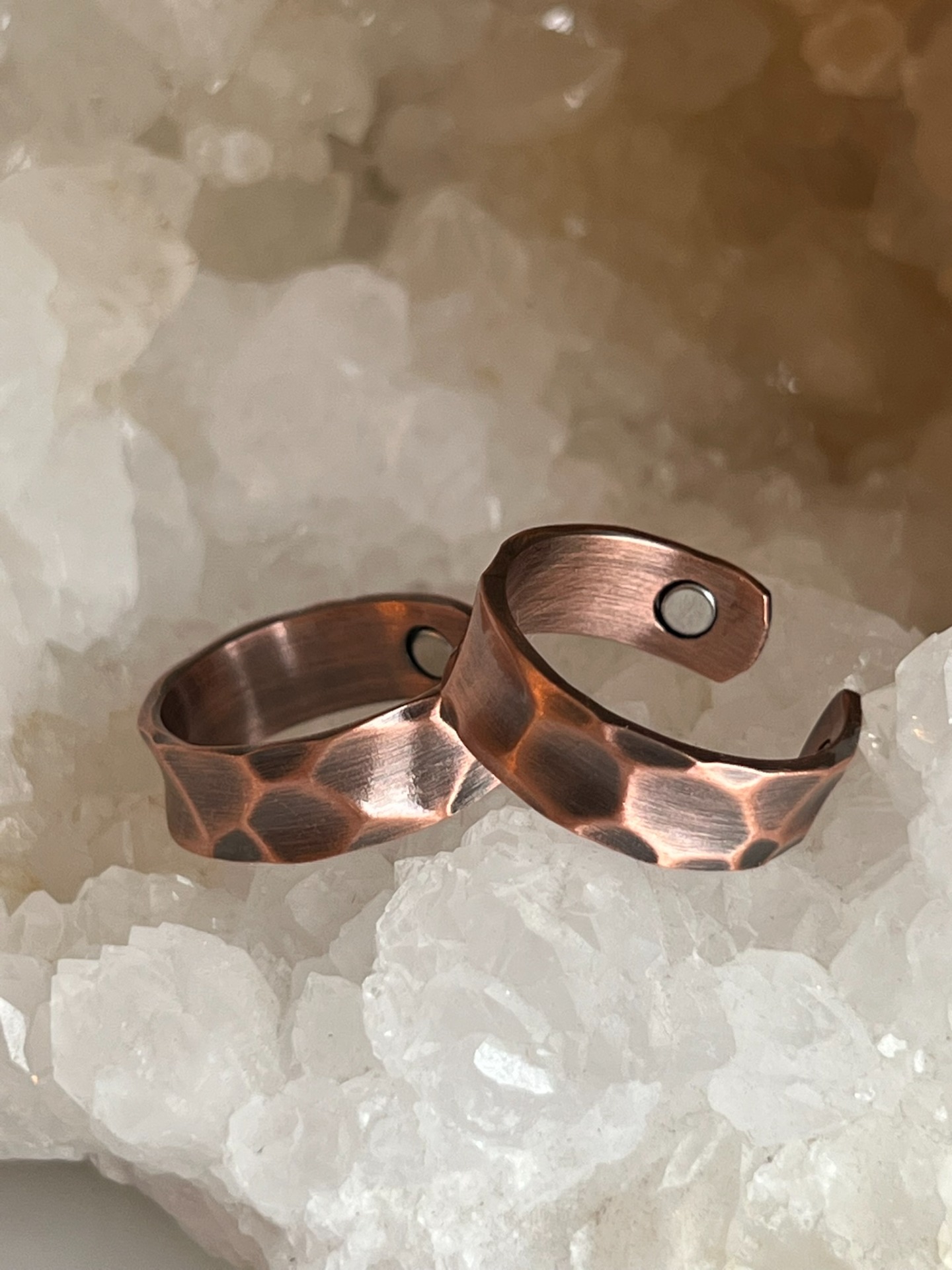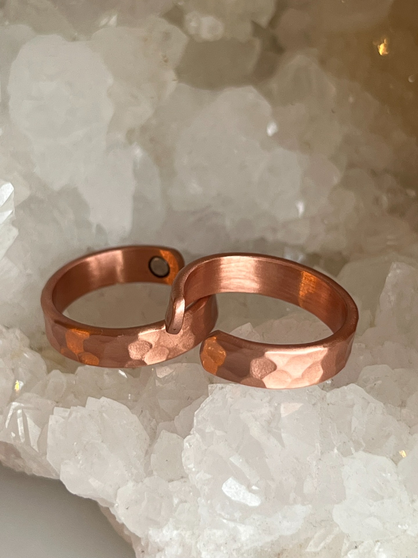 Les bagues en cuivre avec aimants allient simplicité, puissance symbolique et élégance brute. Le cuivre, métal conducteur et vivant, est utilisé depuis des siècles pour accompagner l'équilibre énergétique, tandis que les aimants soutiennent une circulation énergétique subtile et constante.