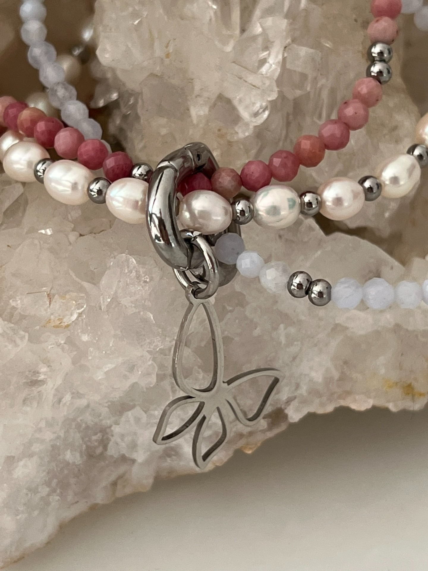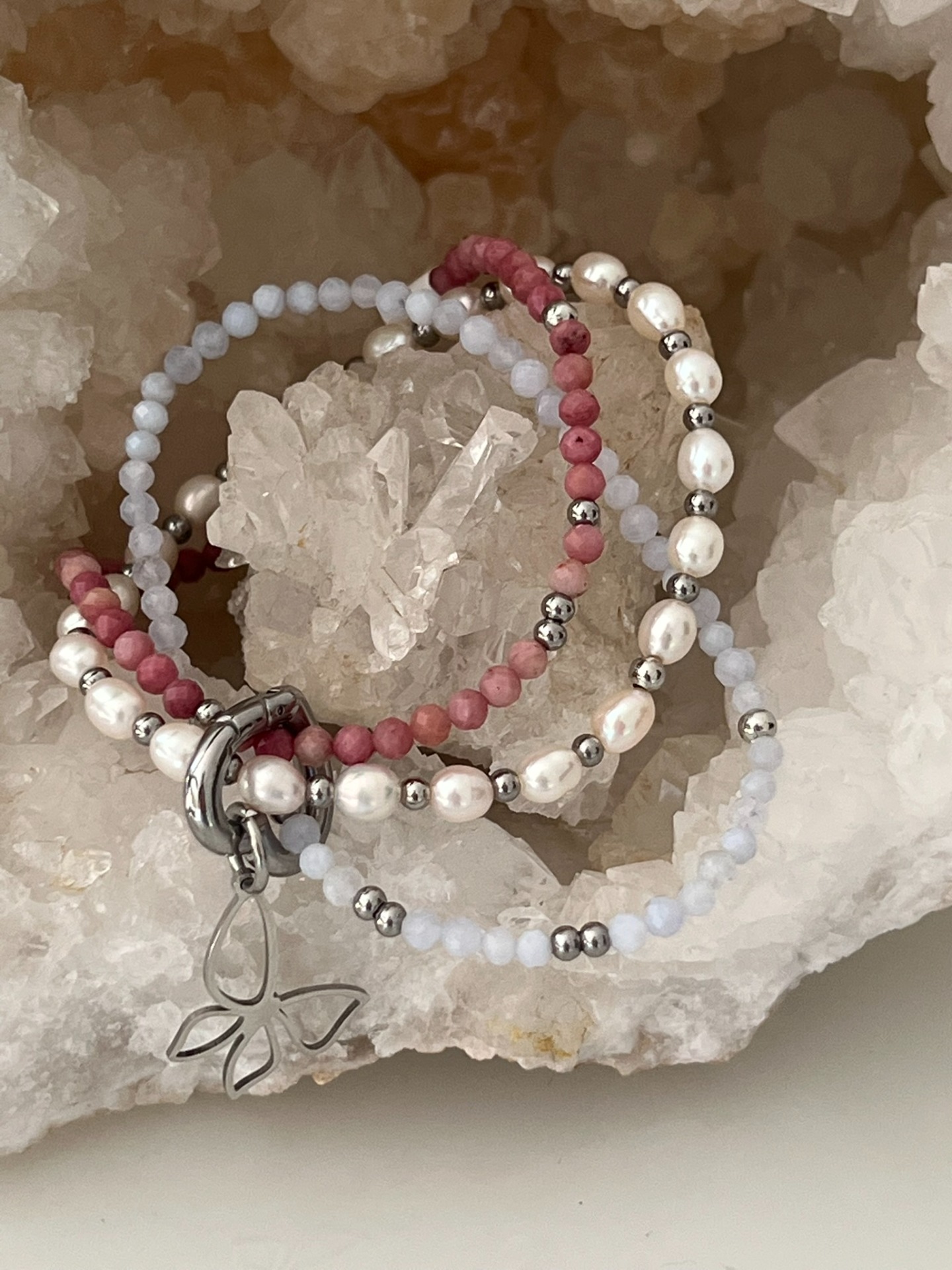 Ce bracelet triple, composé de trois bracelets reliés par un fermoir, associe des énergies douces et rassurantes, idéales pour cultiver le calme intérieur et une expression émotionnelle fluide. L'alliance des perles de culture, de la calcédoine et de la rhodonite rose crée un bijou délicat, à la vibration tendre et enveloppante.