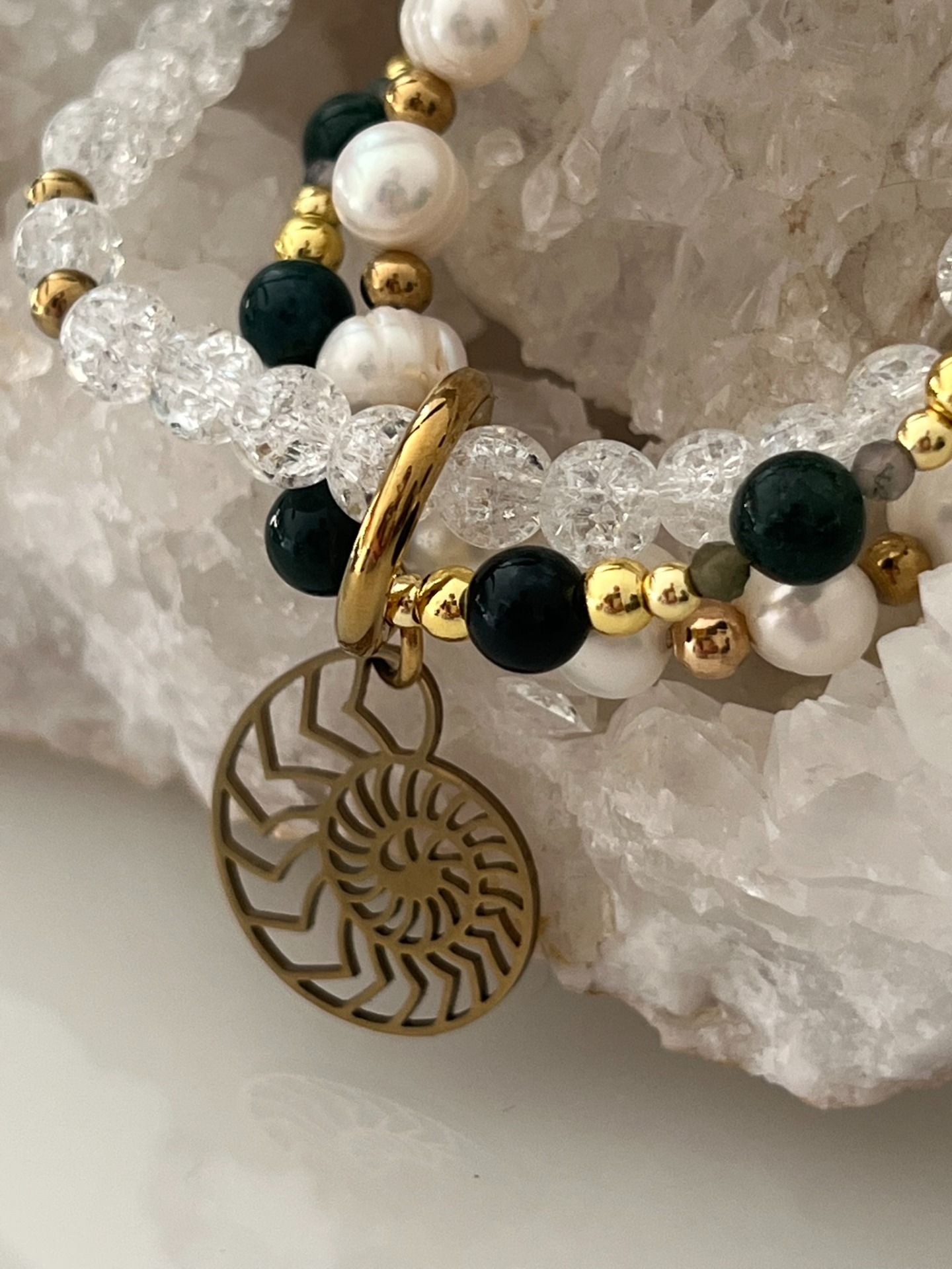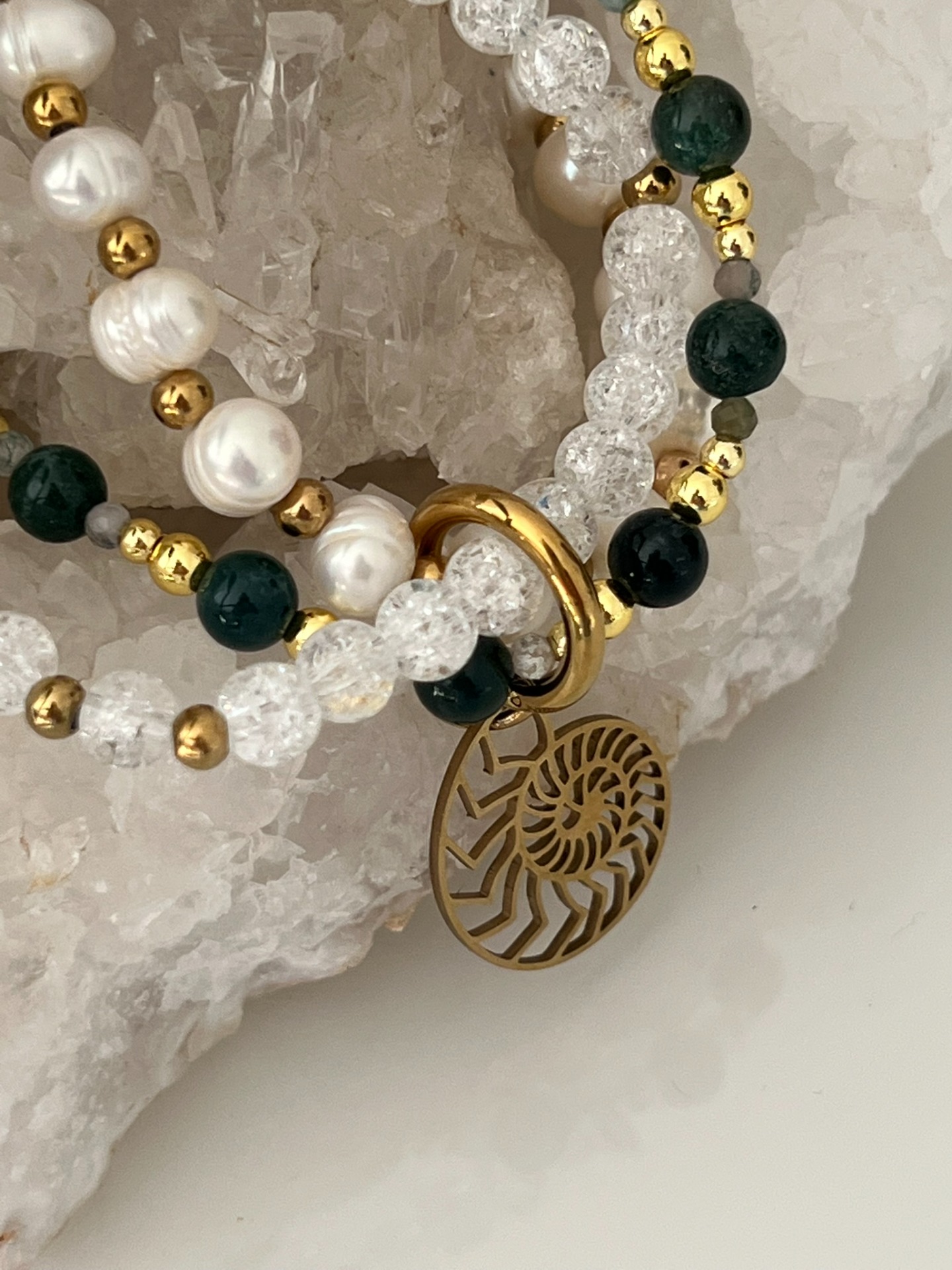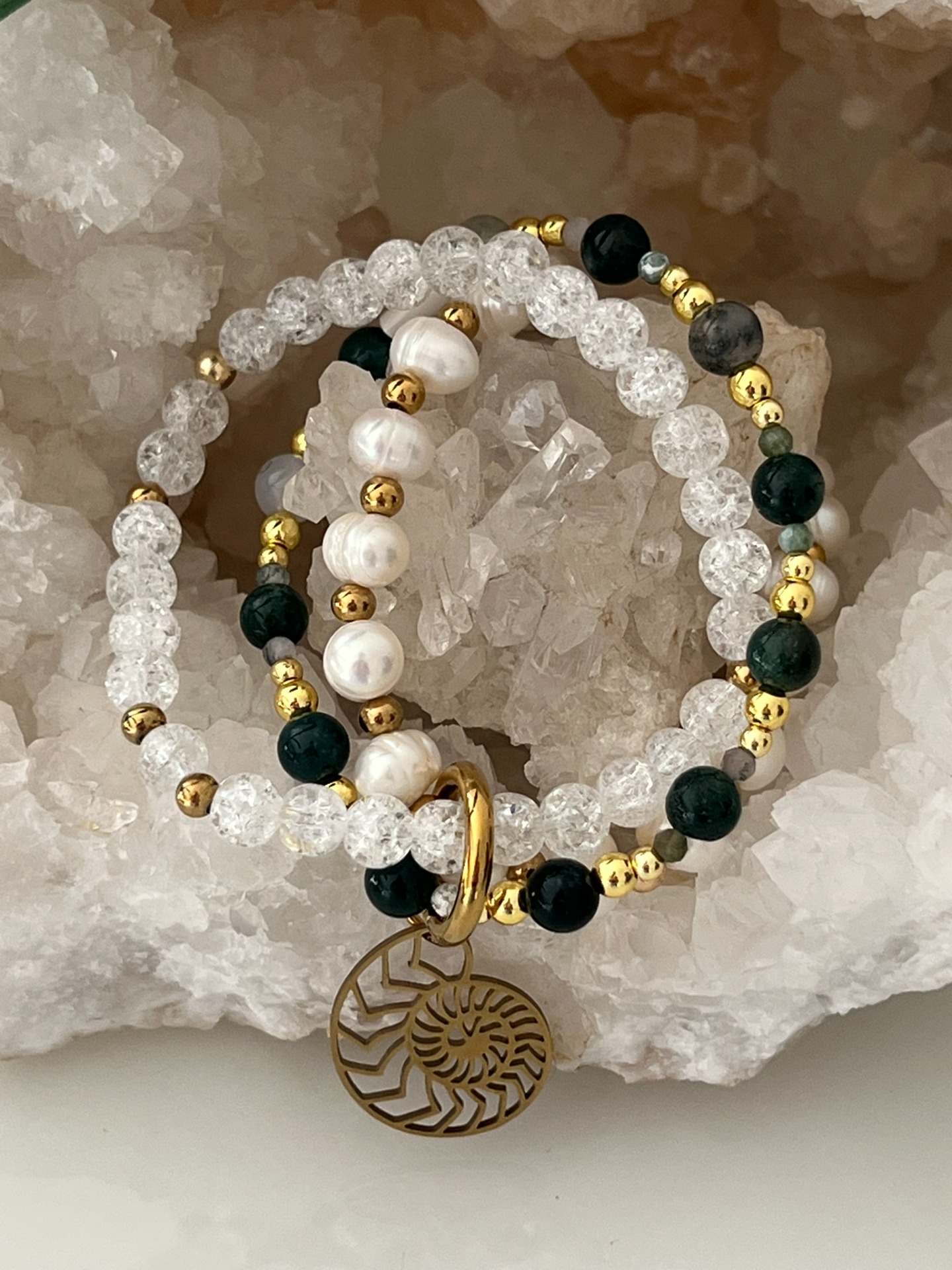 Ce bracelet triple est composé de trois bracelets reliés par un fermoir, formant une pièce à la fois lumineuse, douce et profondément harmonisante. L'association des perles de culture, du cristal de roche et de l'agate mousse crée une énergie de clarté intérieure, de renouveau et de connexion à la nature.