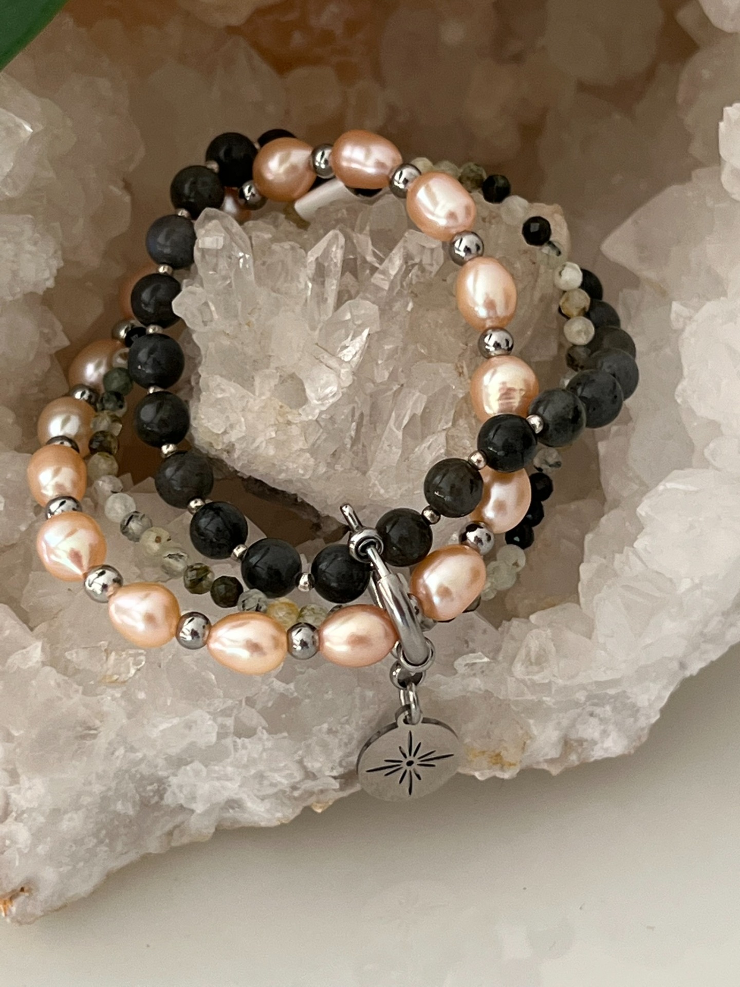 Ce bracelet triple, composé de trois bracelets reliés par un fermoir, associe des énergies de protection douce, d'intuition et d'apaisement intérieur. L'alliance des perles de culture, de la préhnite et de la labradorite crée un bijou à la fois enveloppant et profondément rassurant.