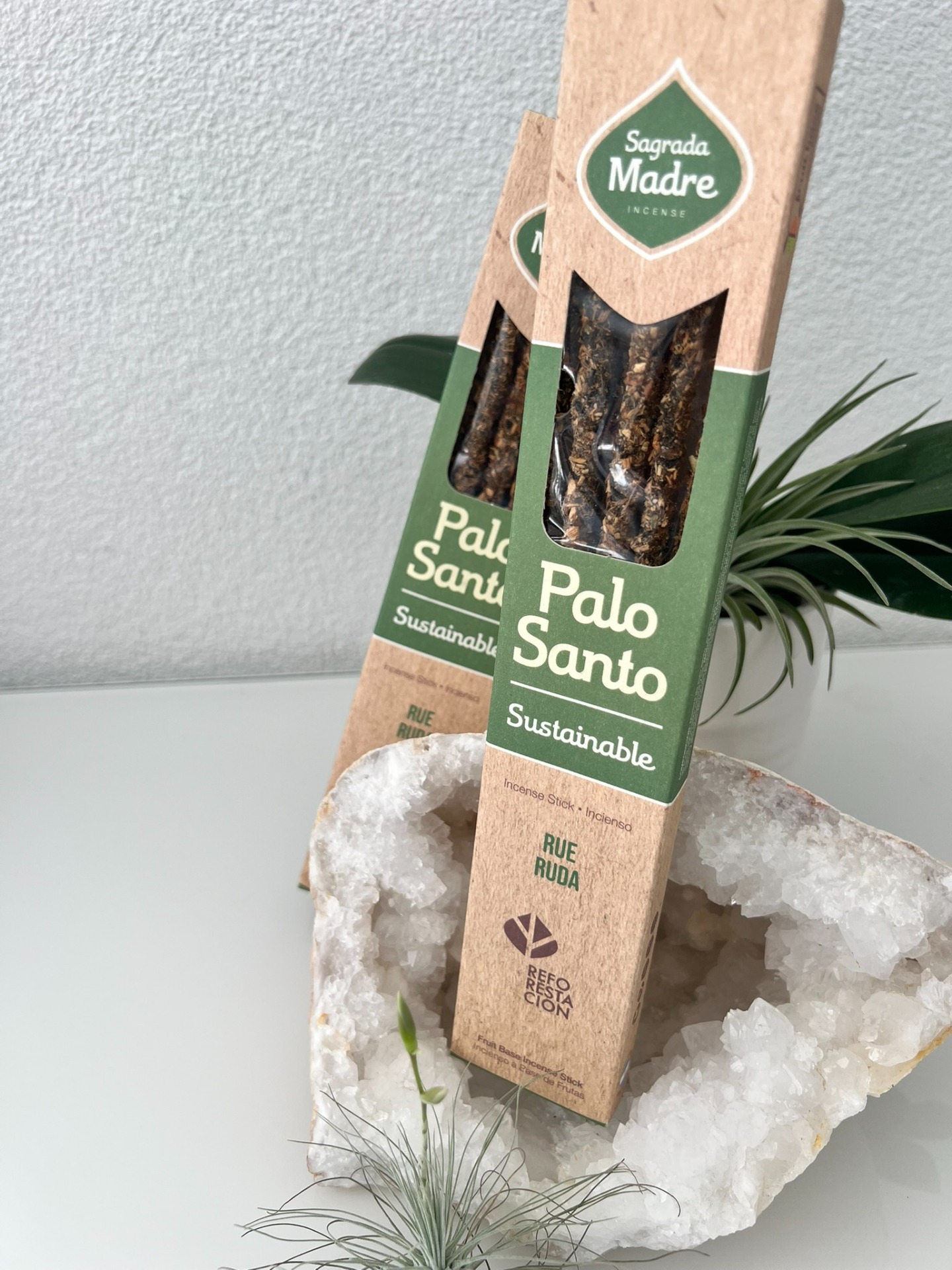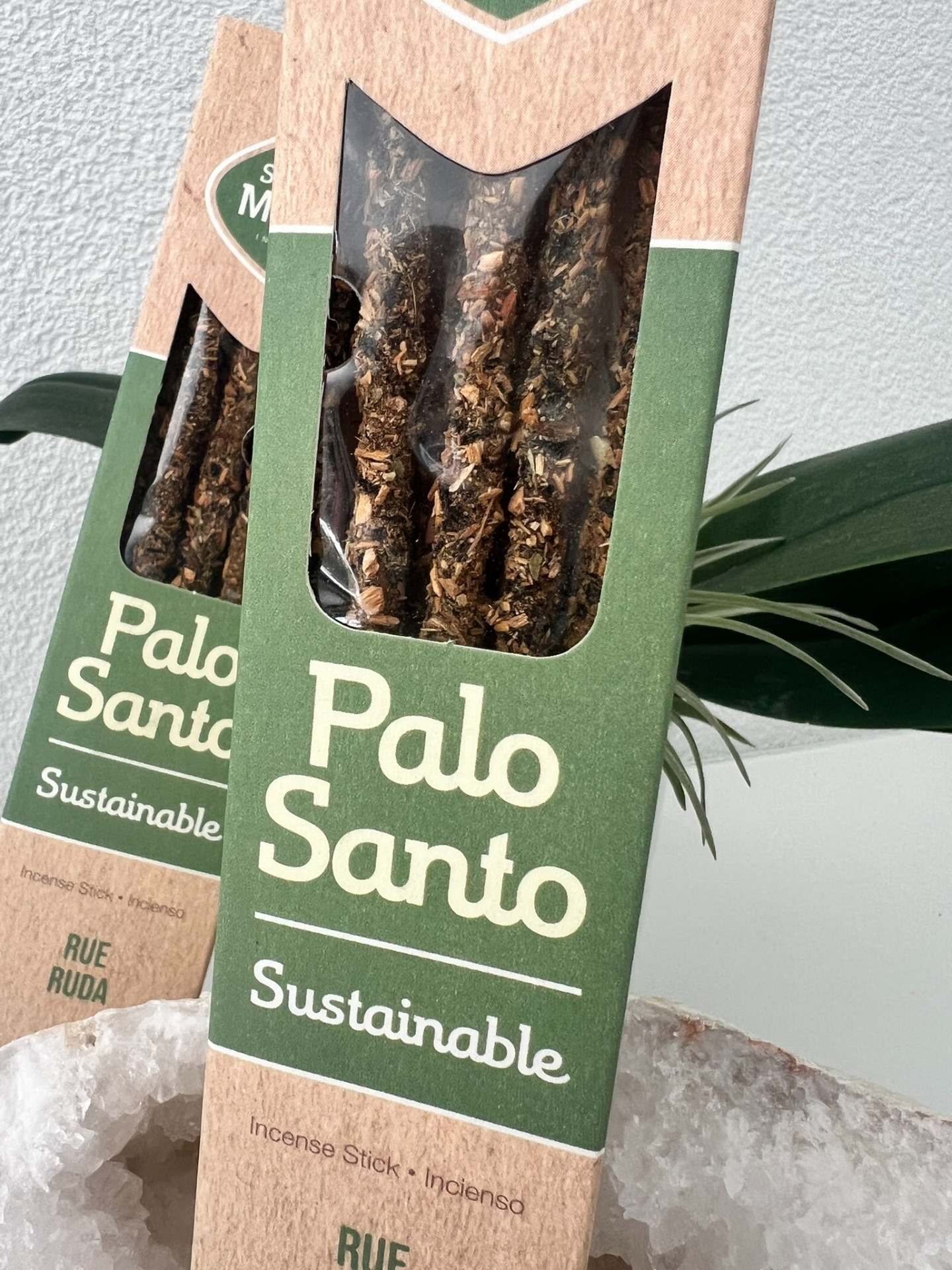 Le palo santo, bois sacré aux propriétés apaisantes et harmonisantes, s'unit à la rue, plante traditionnellement utilisée pour repousser les énergies négatives et le mauvais œil. Ensemble, ils forment une alliance puissante pour nettoyer, protéger et restaurer l'équilibre énergétique.