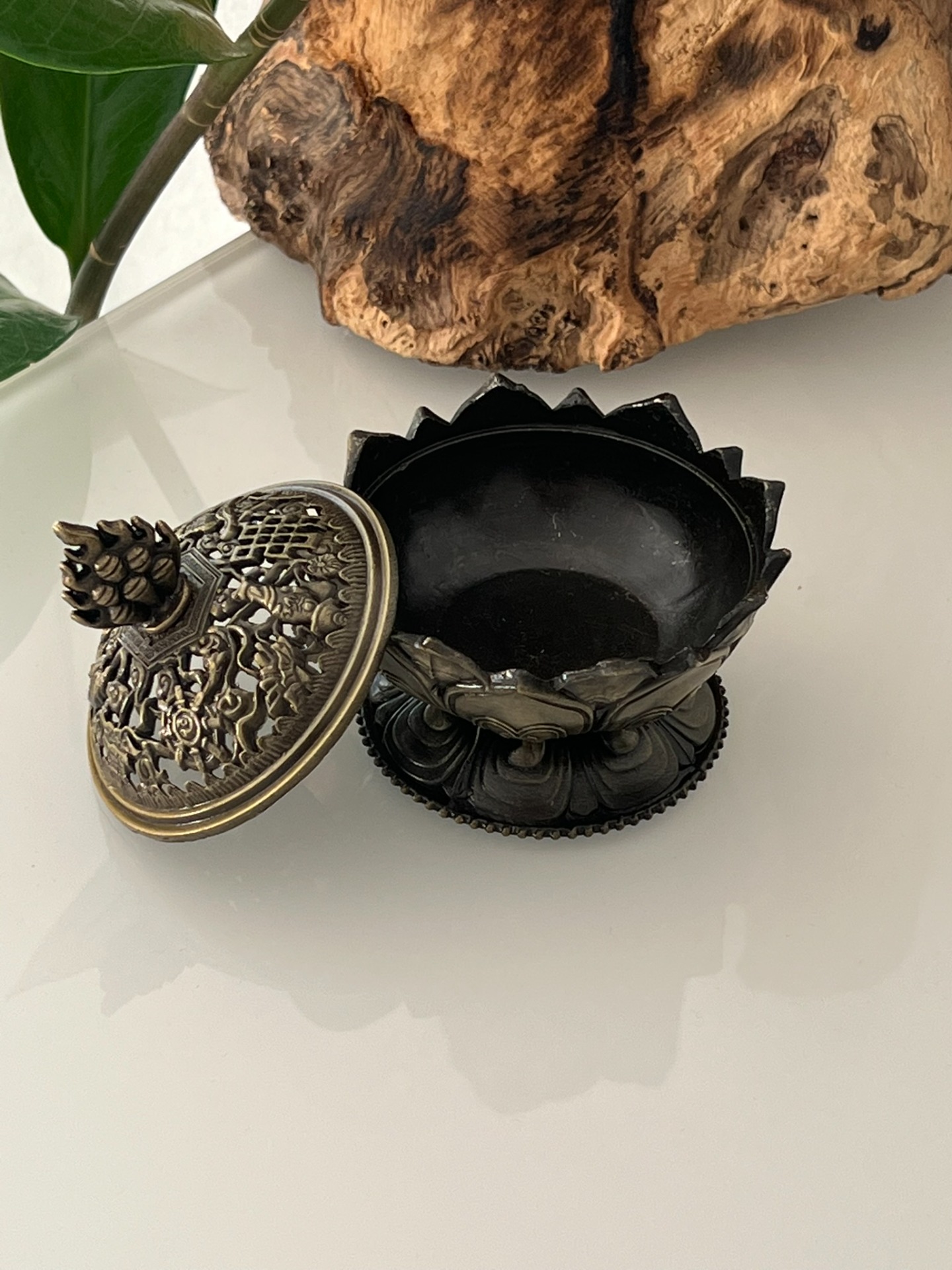 Cet encensoir en métal finition bronze, inspiré de la fleur de lotus, est une véritable invitation à la sérénité et à l'élévation spirituelle. Symbole de pureté, de renaissance et d'harmonie, le lotus accompagne les rituels de purification avec douceur et profondeur.