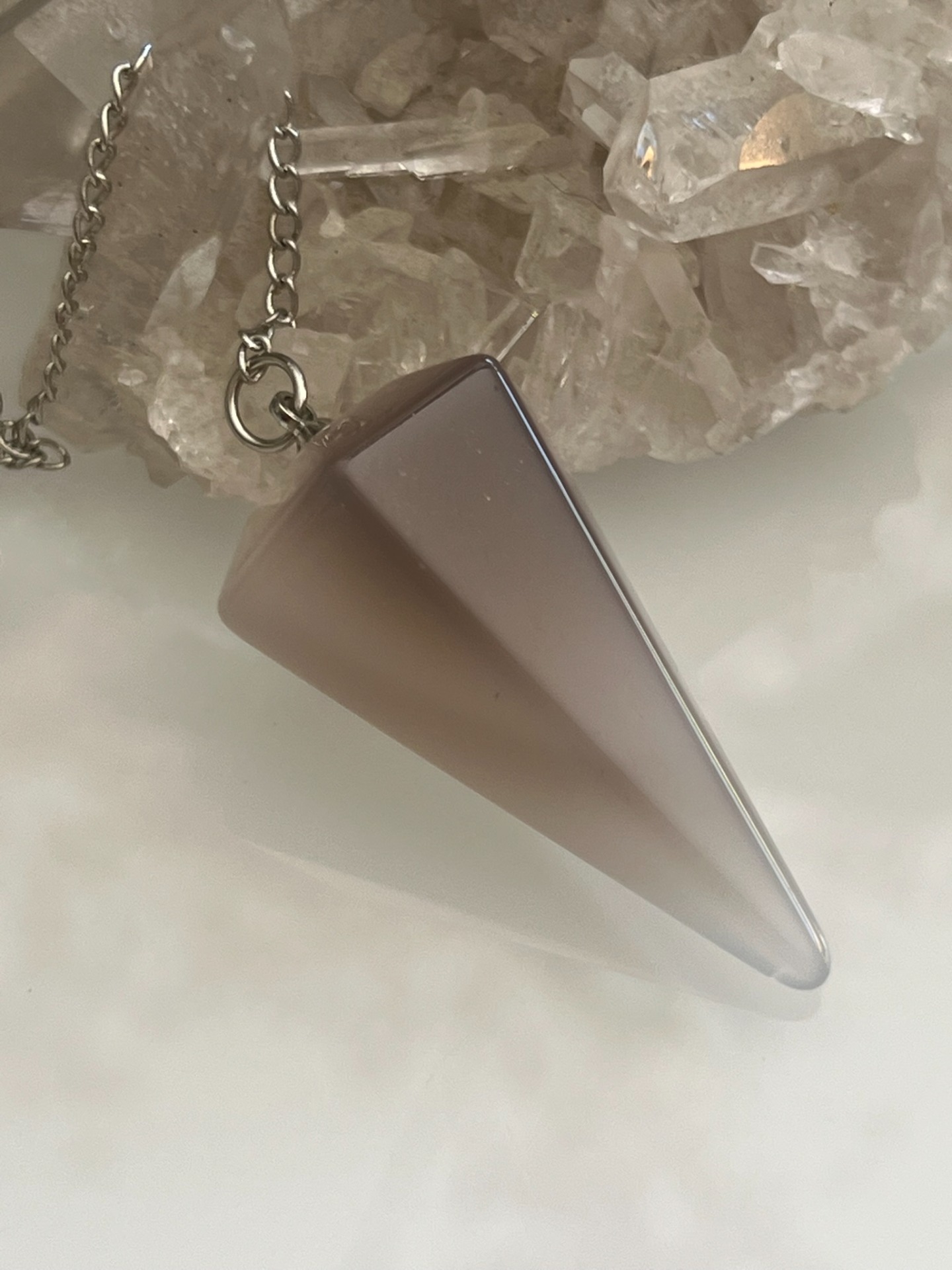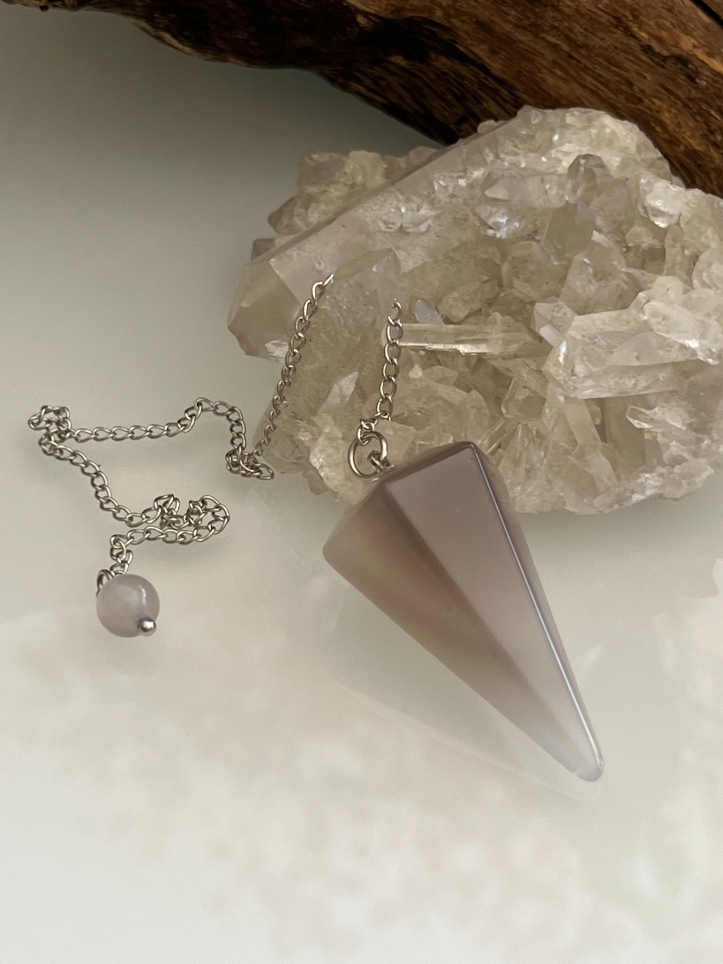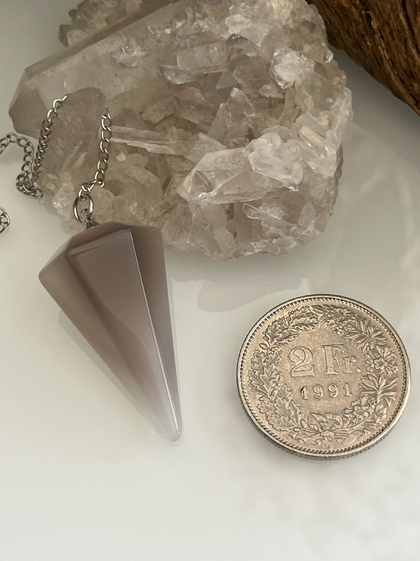 Pendule facetté en pierre naturelle d'Agate Grise, accompagné de sa chaînette en métal argenté et d'une bille assortie.