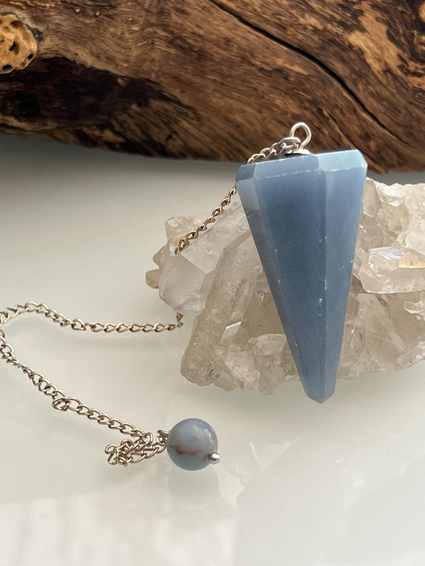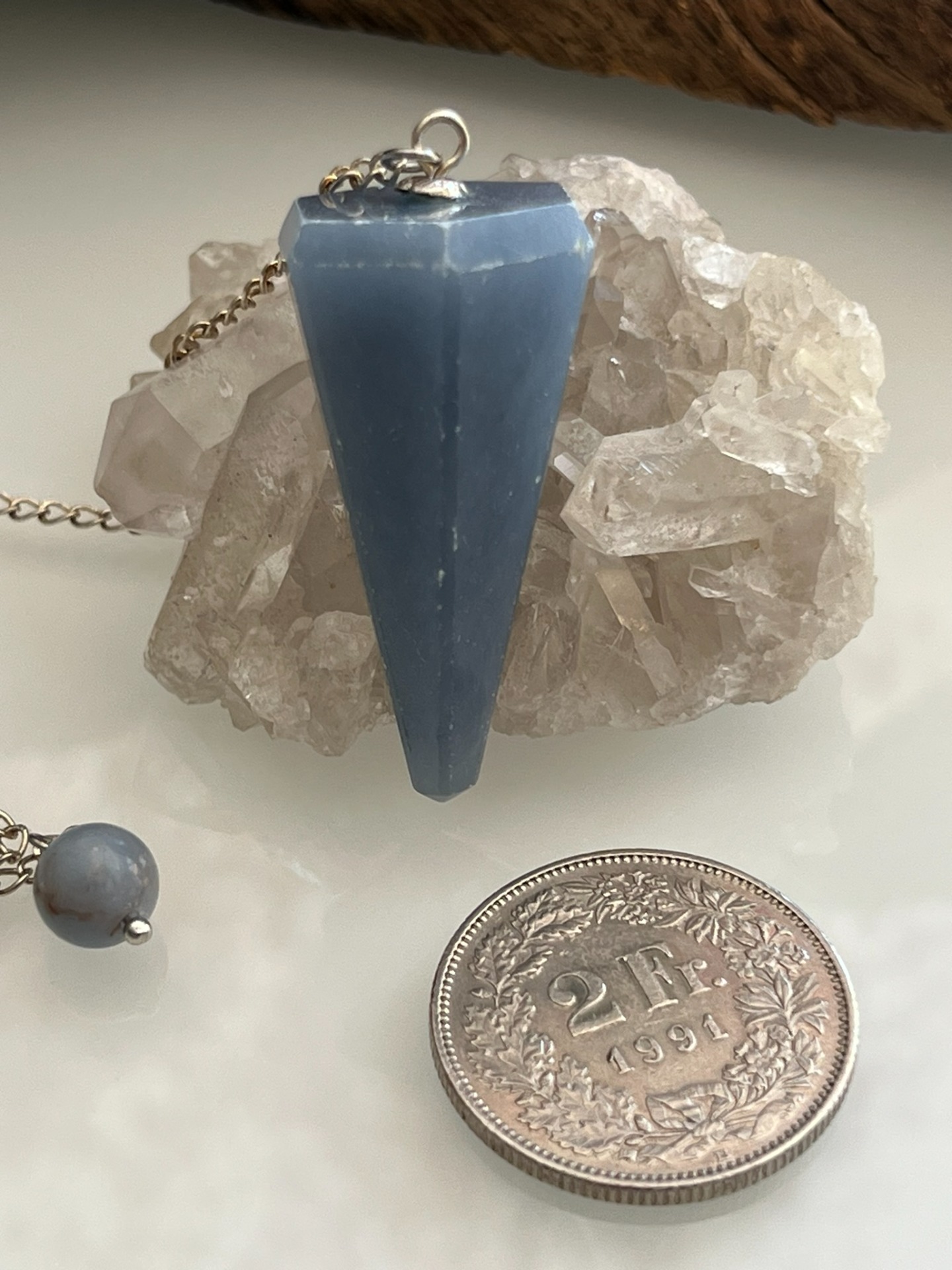 Pendule facetté en pierre naturelle d'Angélite, accompagné de sa chaînette en métal argenté et d'une bille assortie.