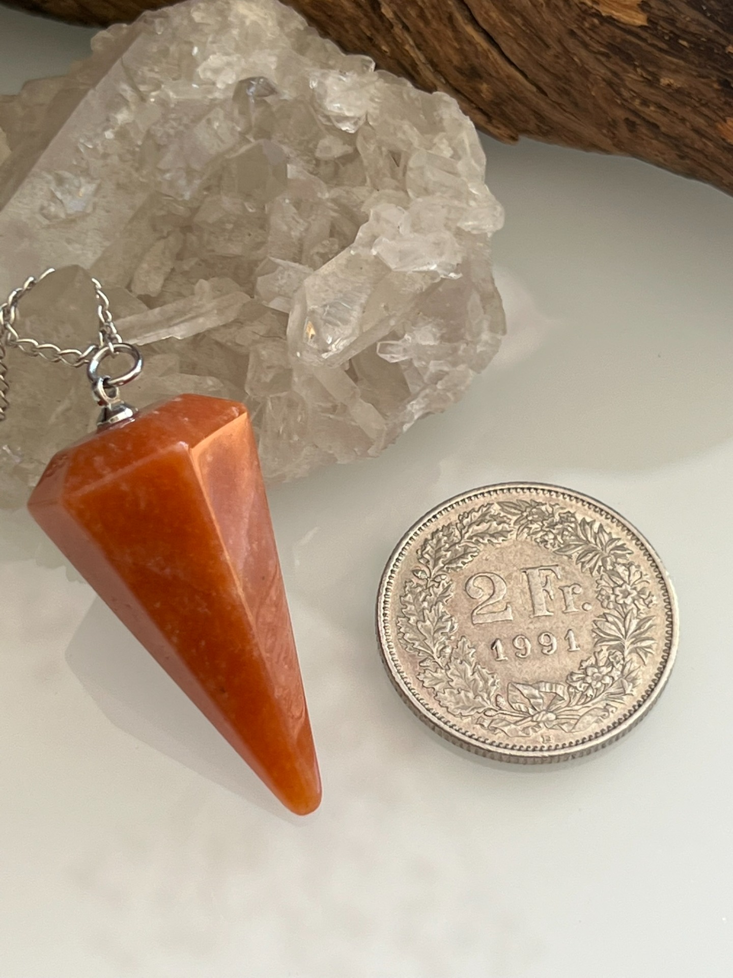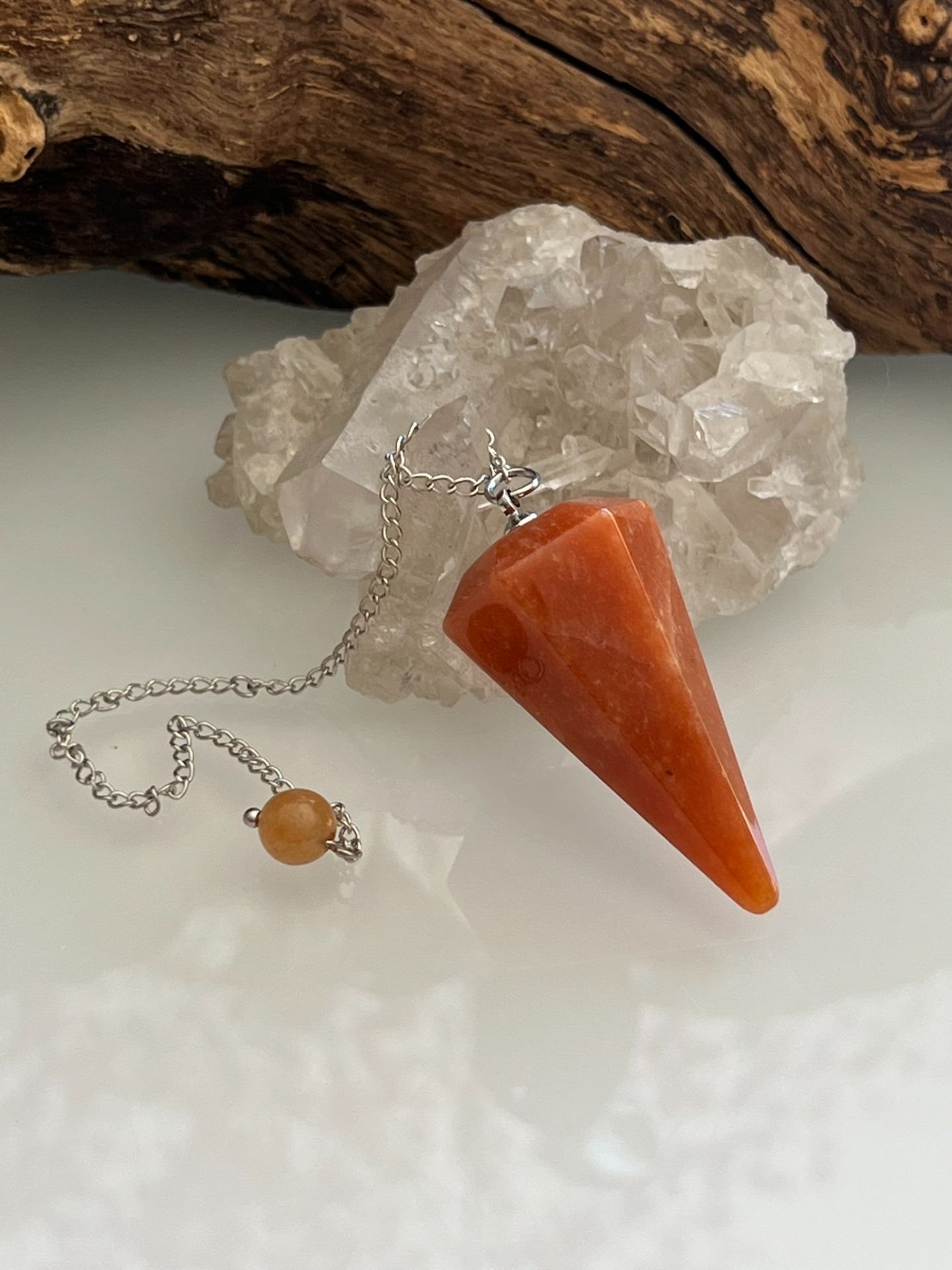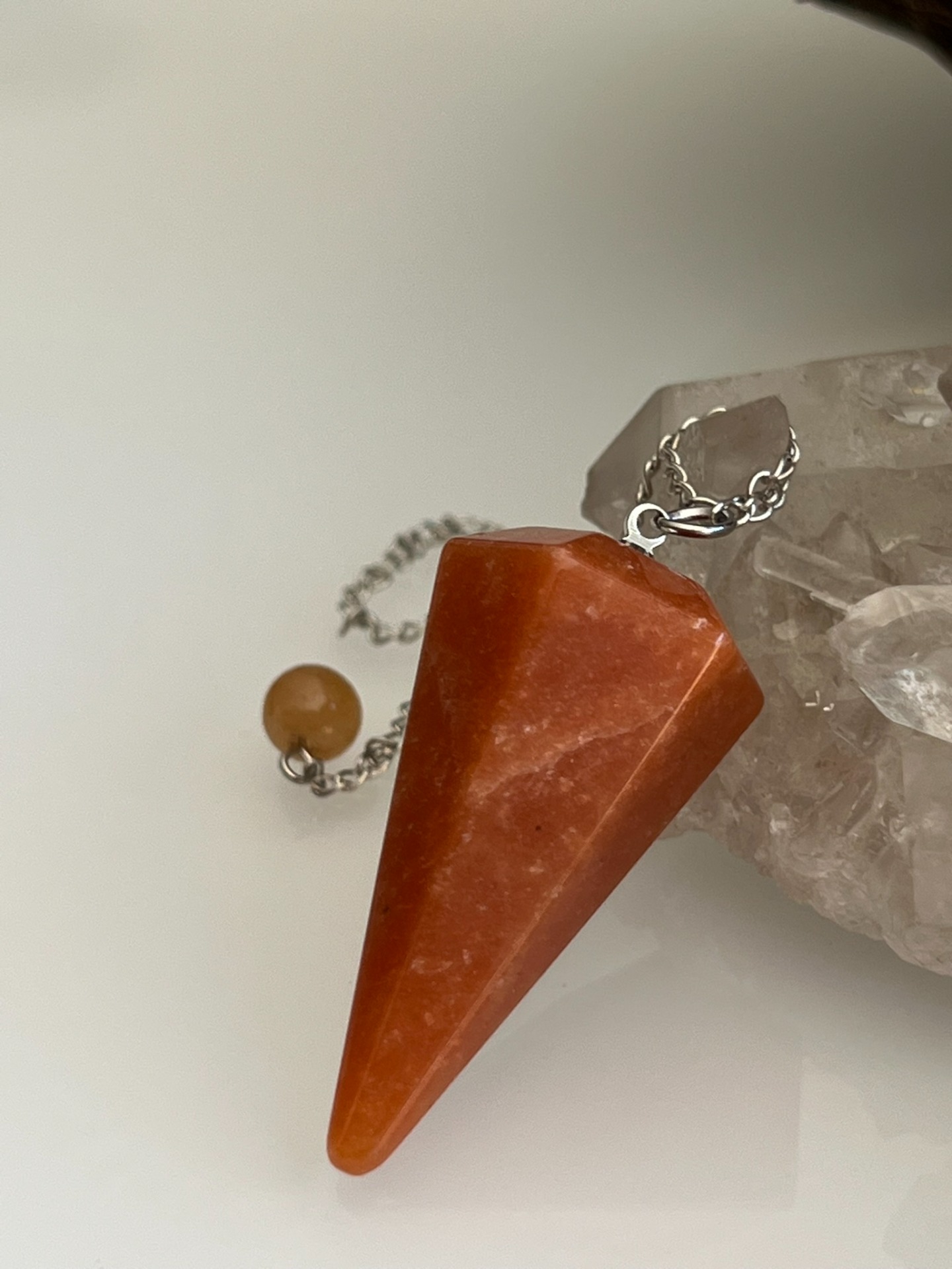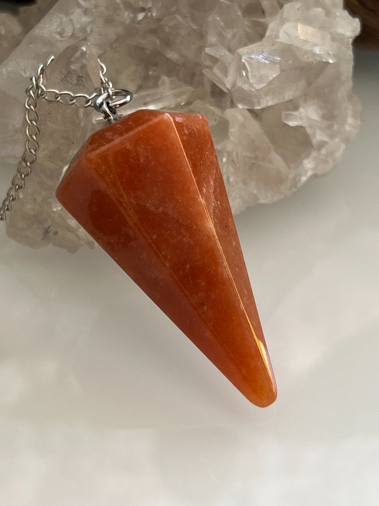 Pendule facetté en pierre naturelle d'Aventurine orange, accompagné de sa chaînette en métal argenté et d'une bille assortie.