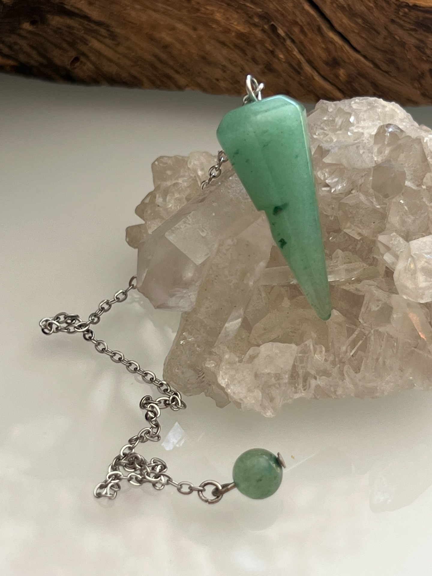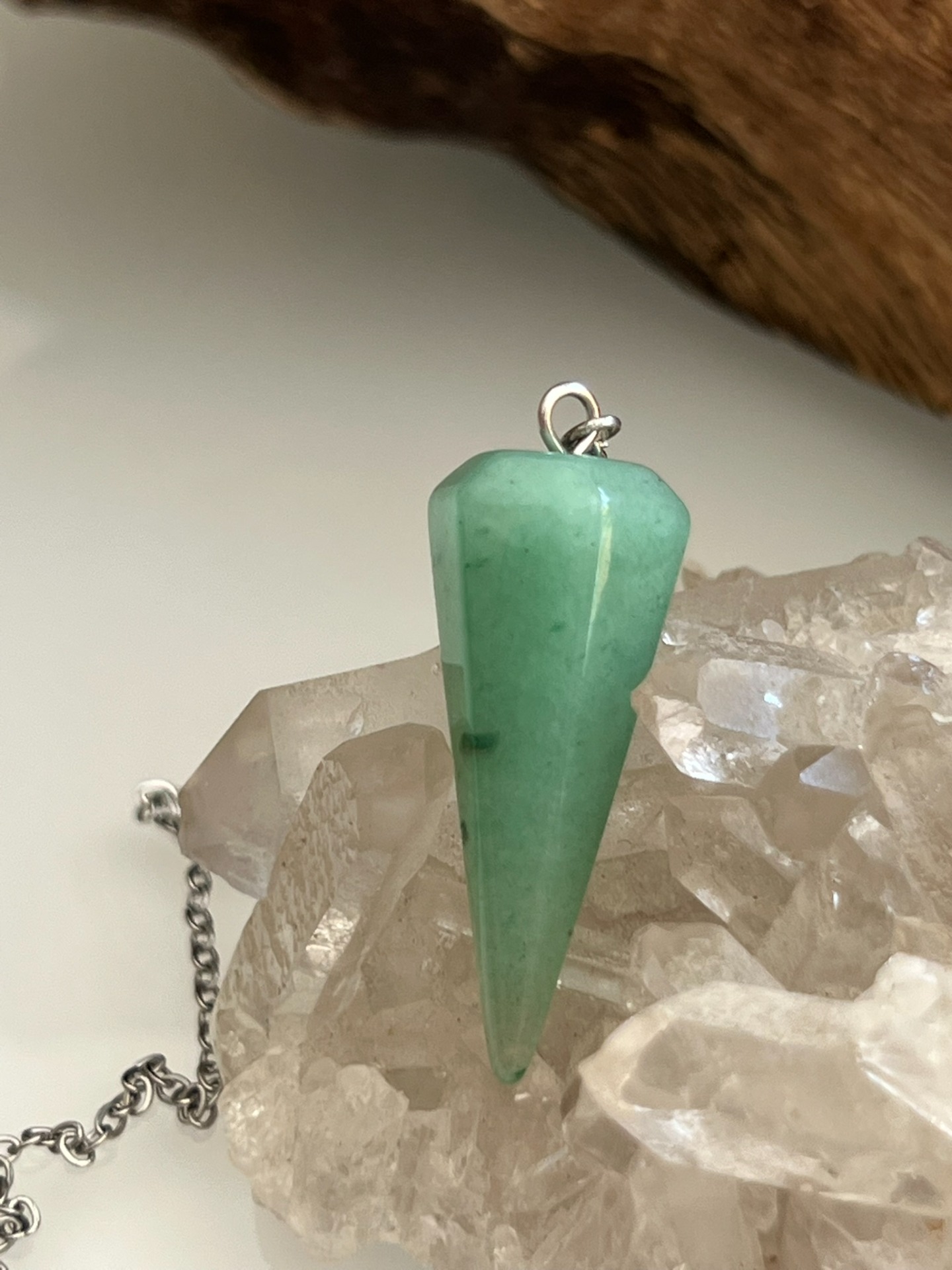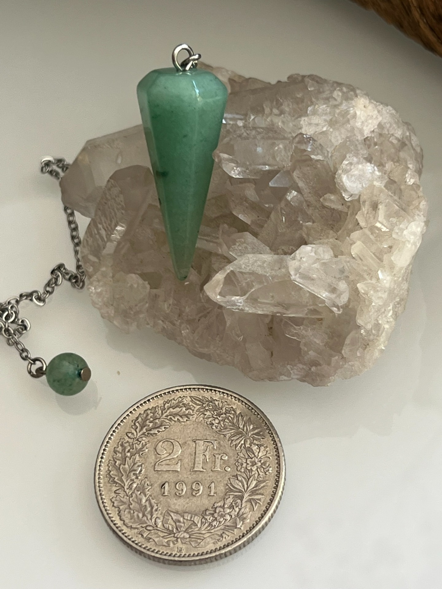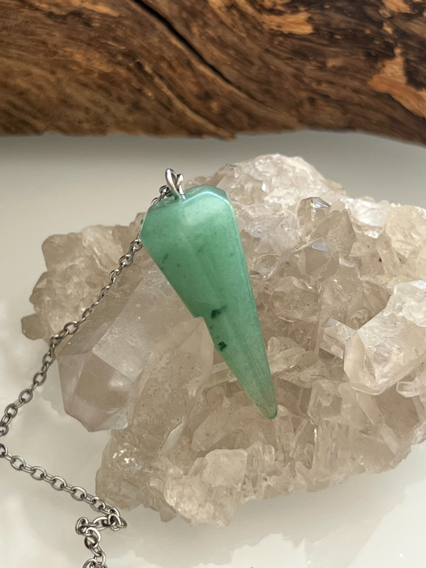 Pendule en pierre naturelle d'Aventurine verte, accompagné de sa chaînette en métal argenté.