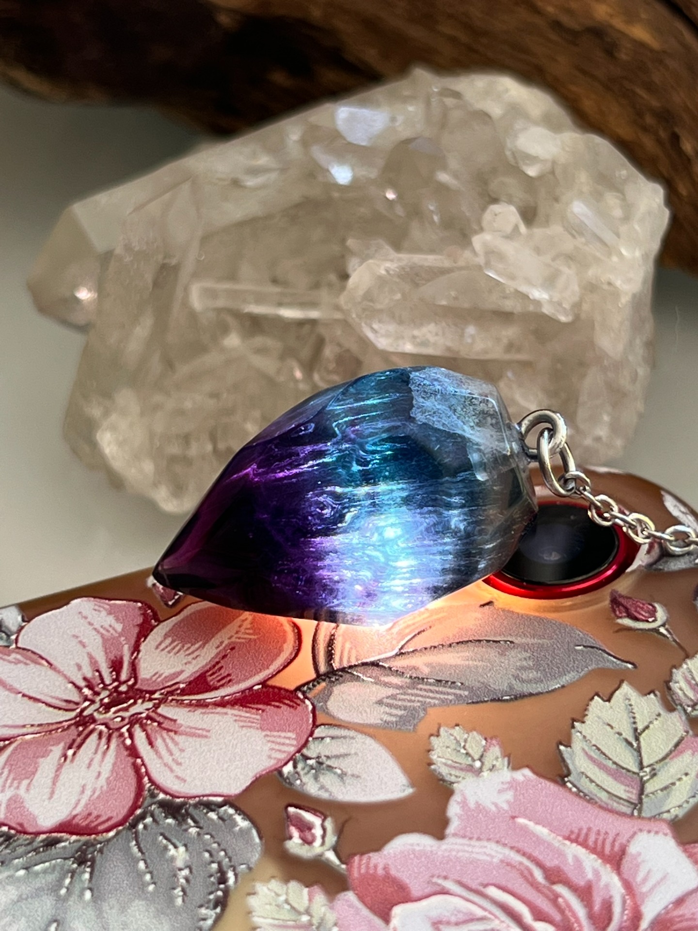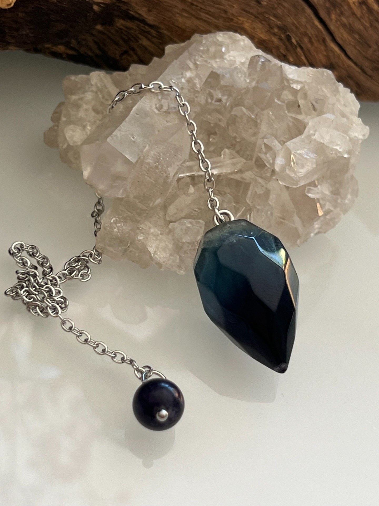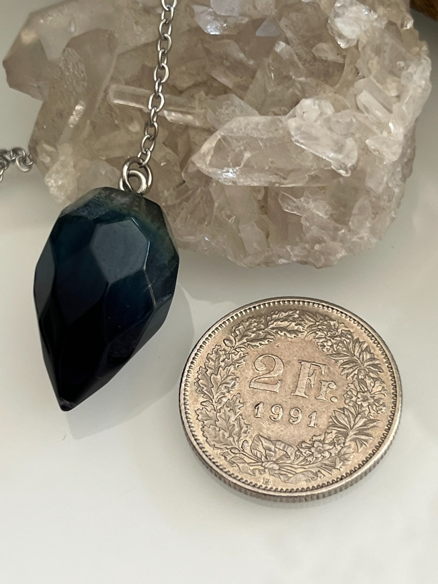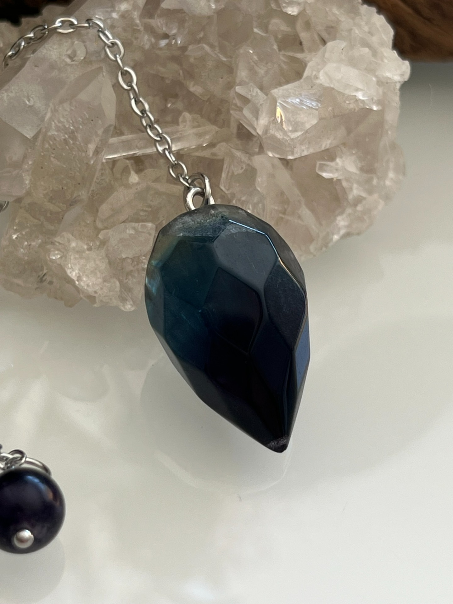 Pendule facetté en pierre naturelle de Fluorite, accompagné de sa chaînette en métal argenté et d'une bille assortie.
