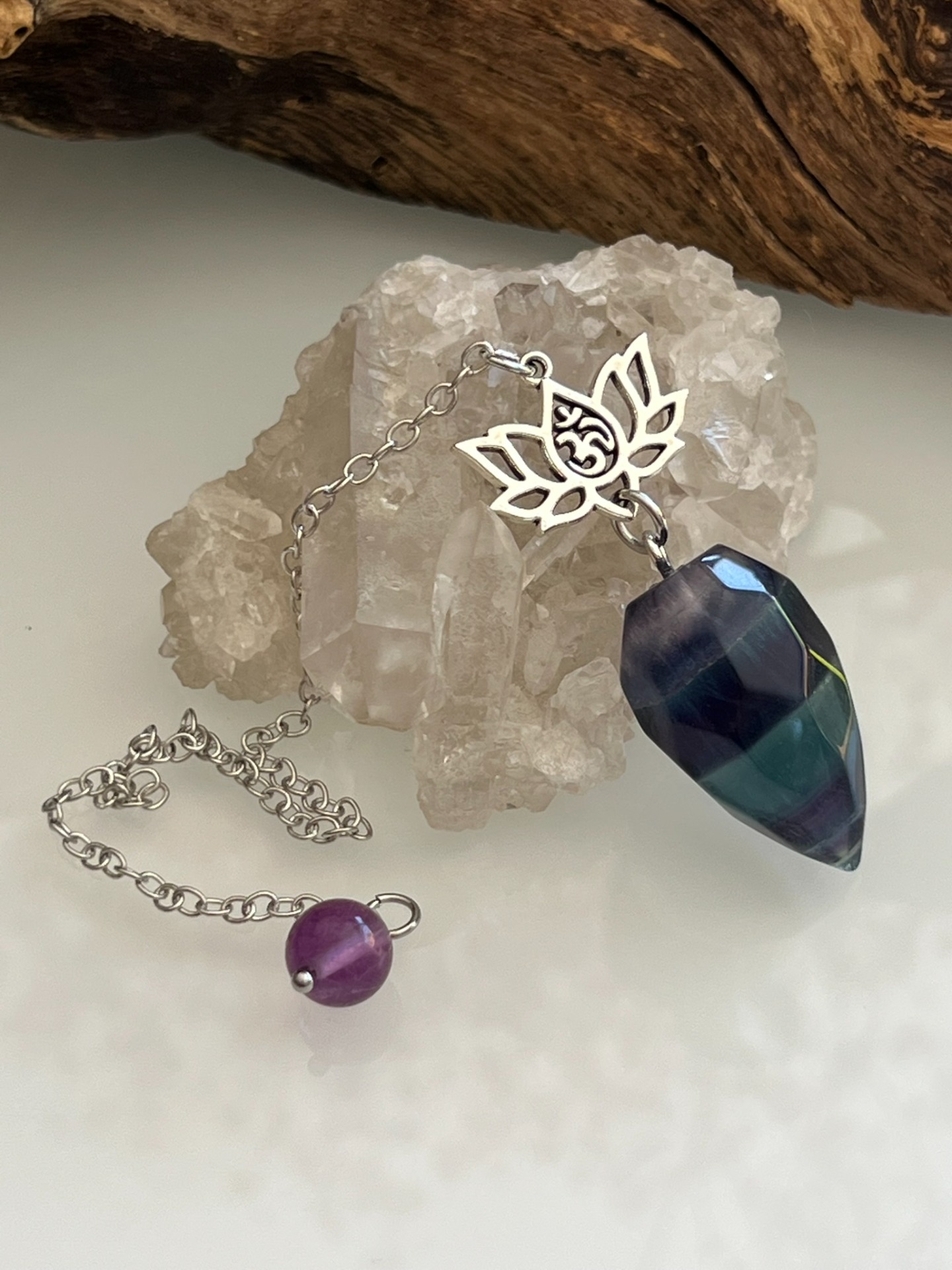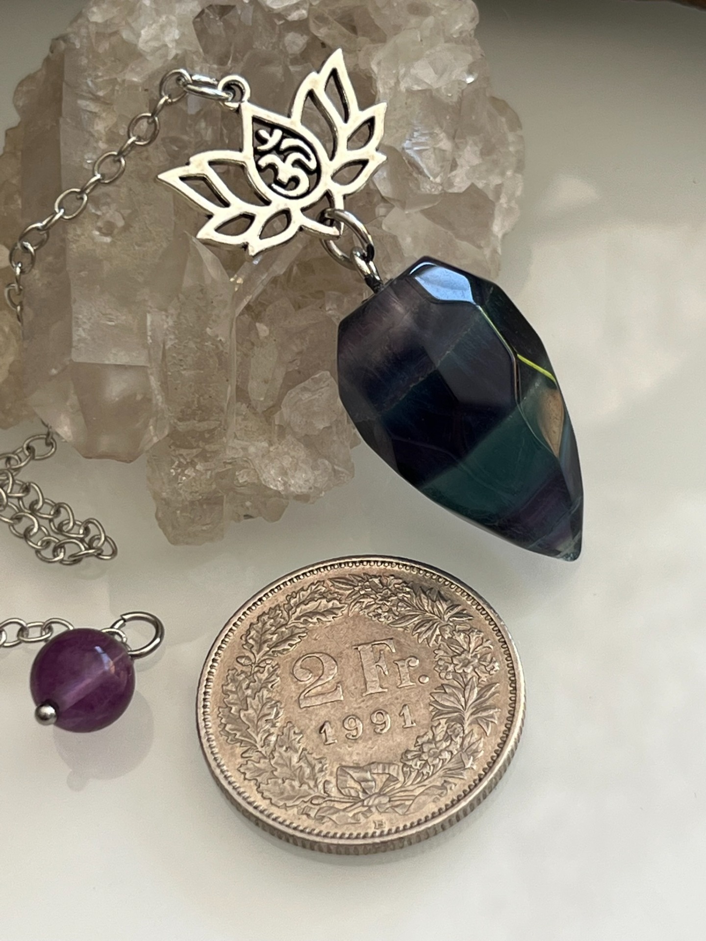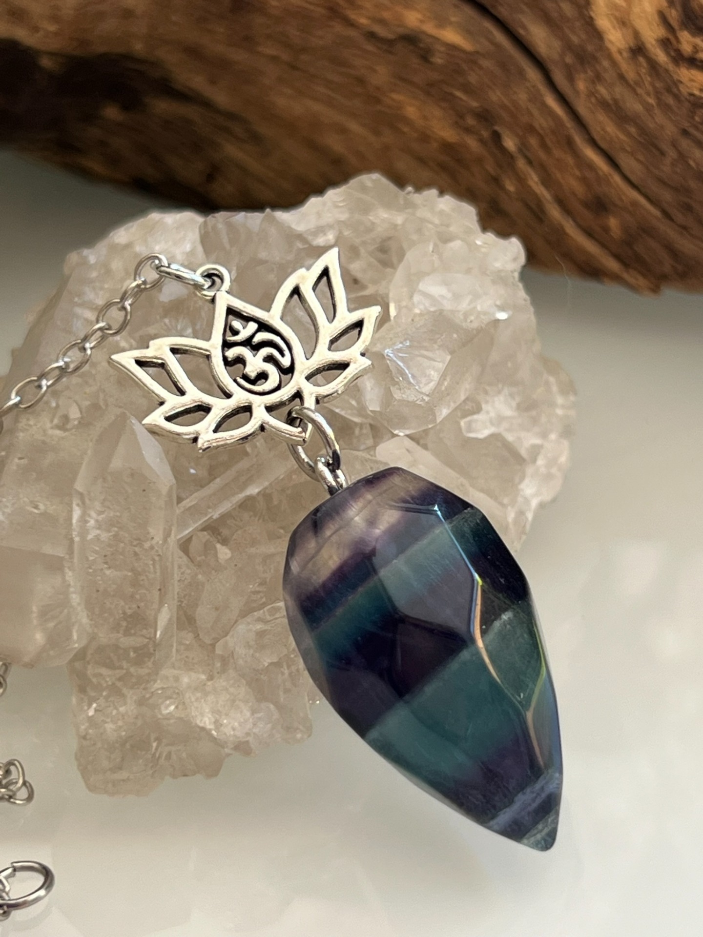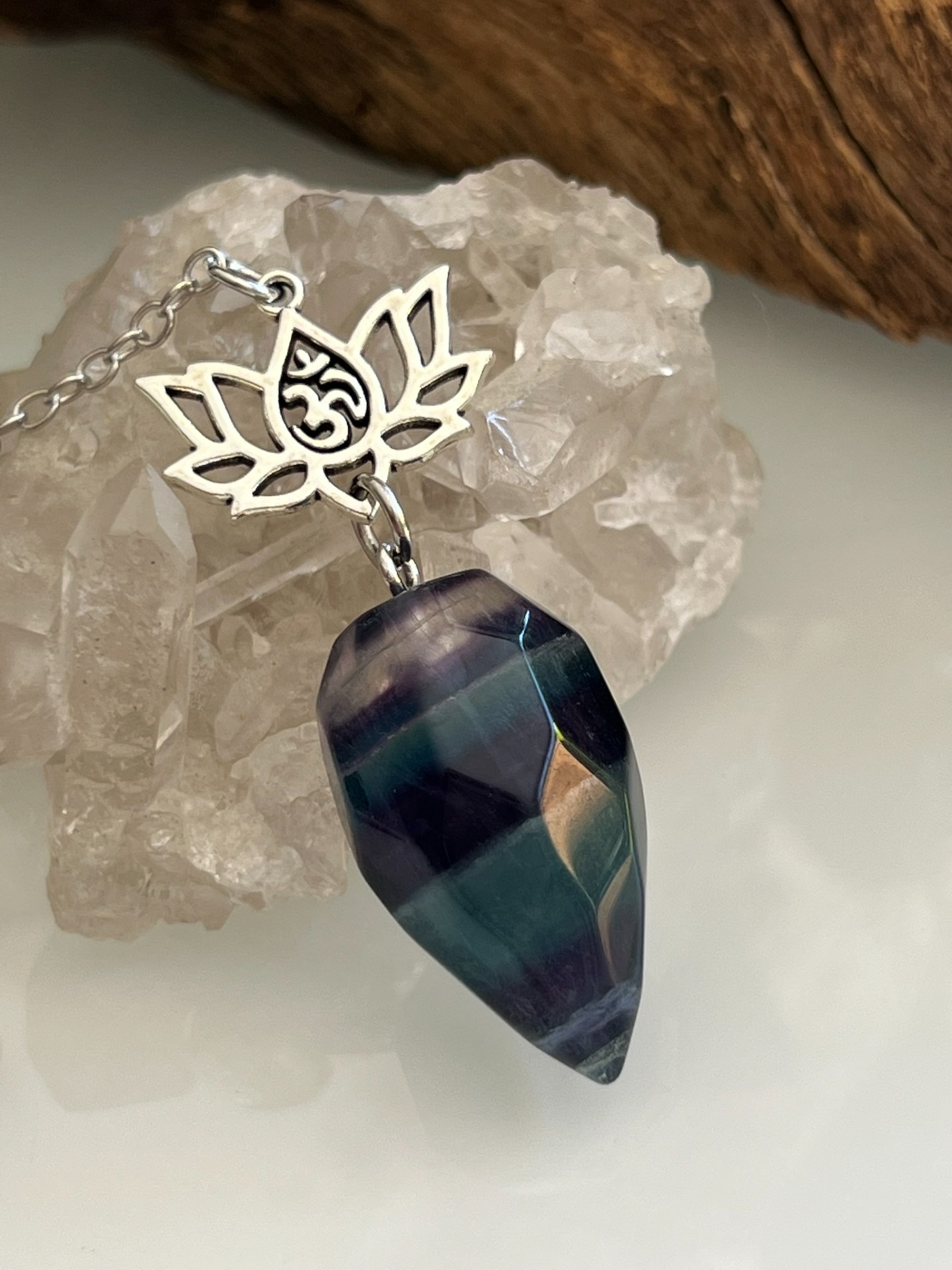 Pendule facetté en pierre naturelle de Fluorite multicolore, orné d'un symbole Lotus avec Om sacré, accompagné de sa chaînette en métal argenté et d'une bille assortie.