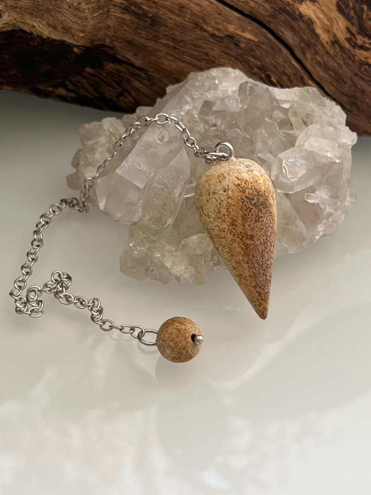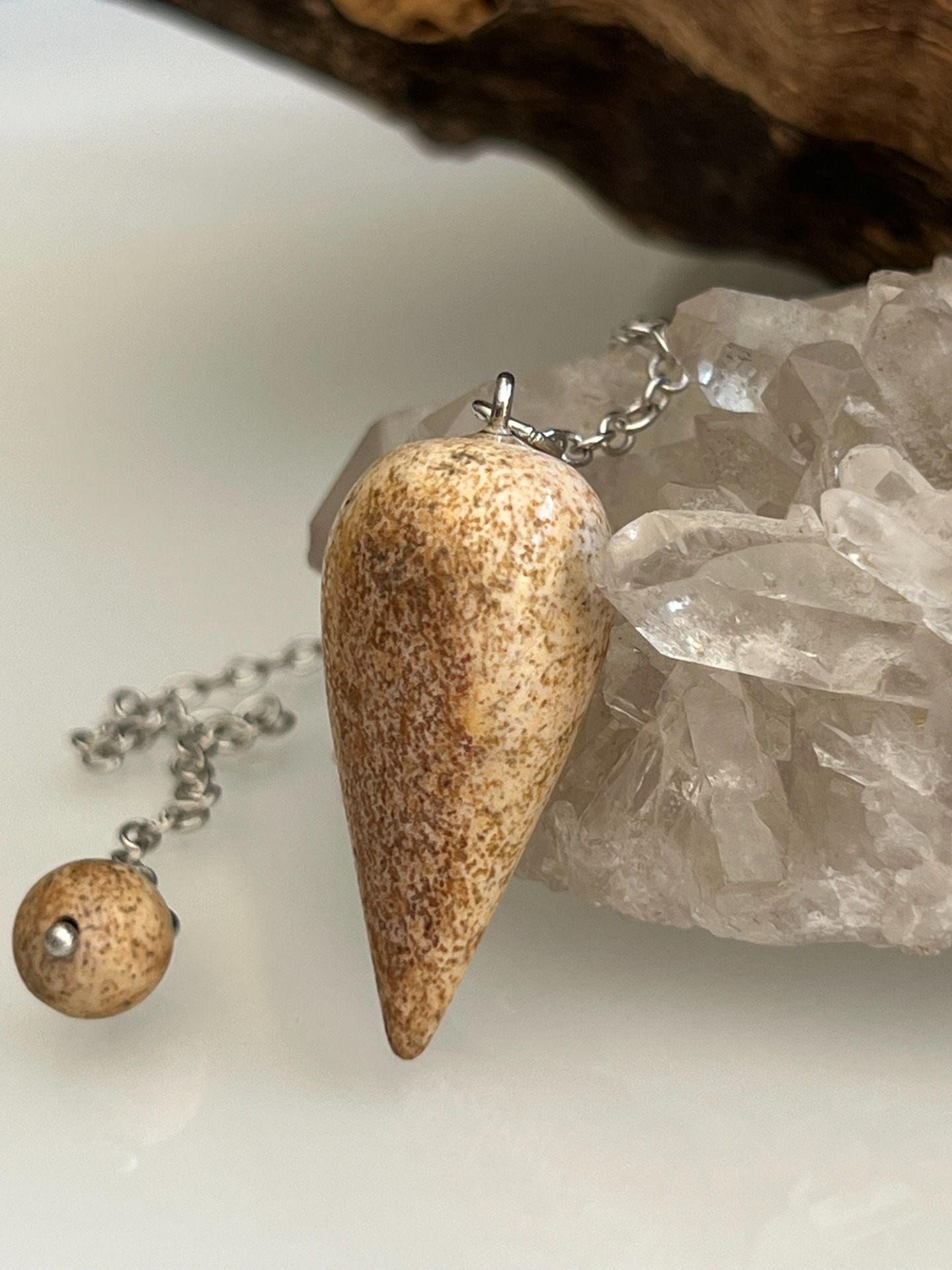 Pendule facetté en pierre naturelle de Jaspe Paysage, accompagné de sa chaînette en métal argenté et d'une bille assortie.