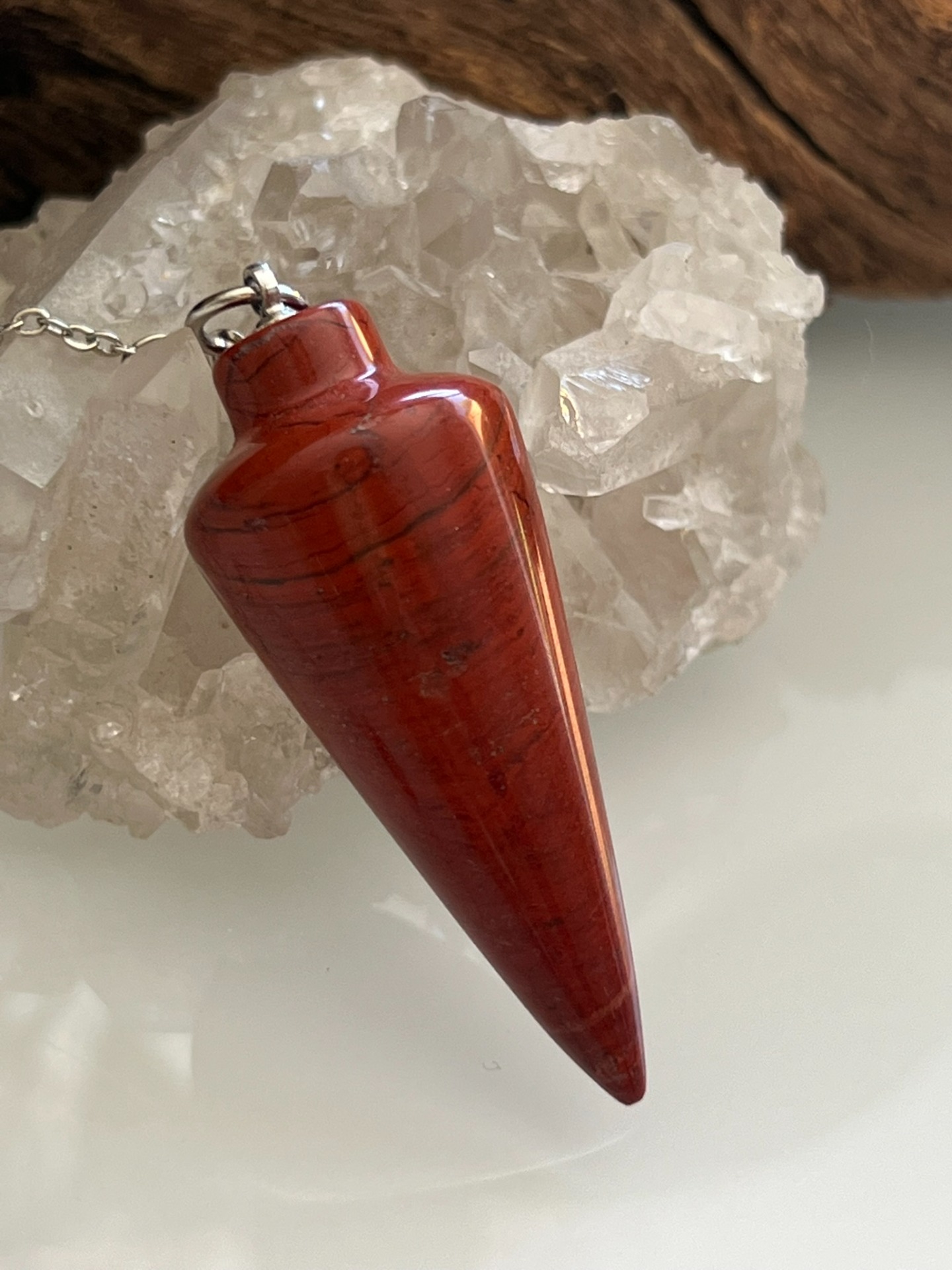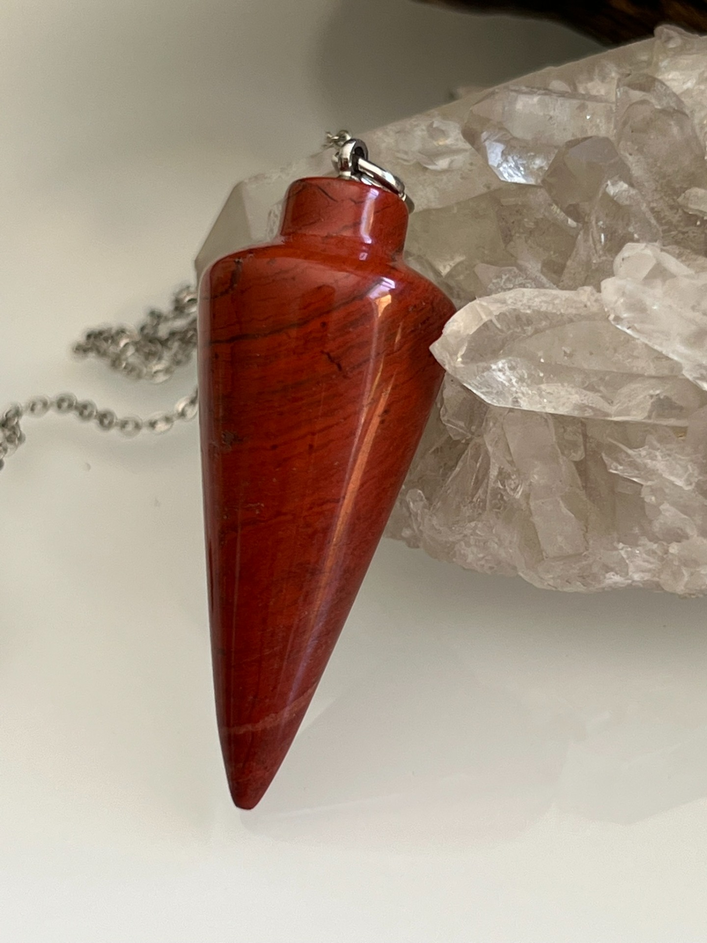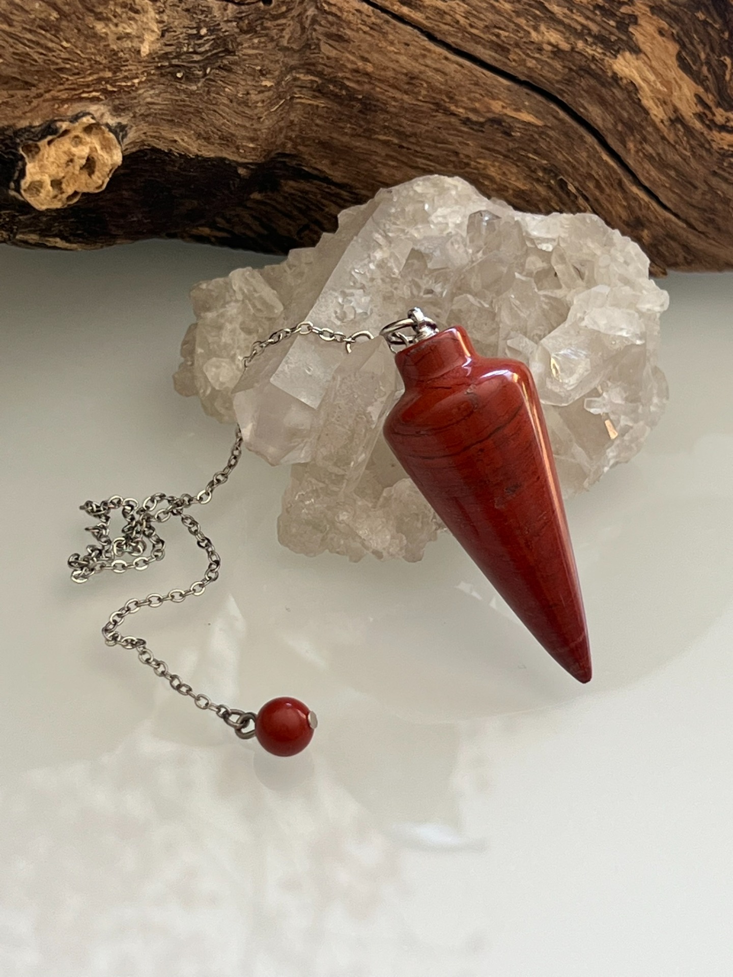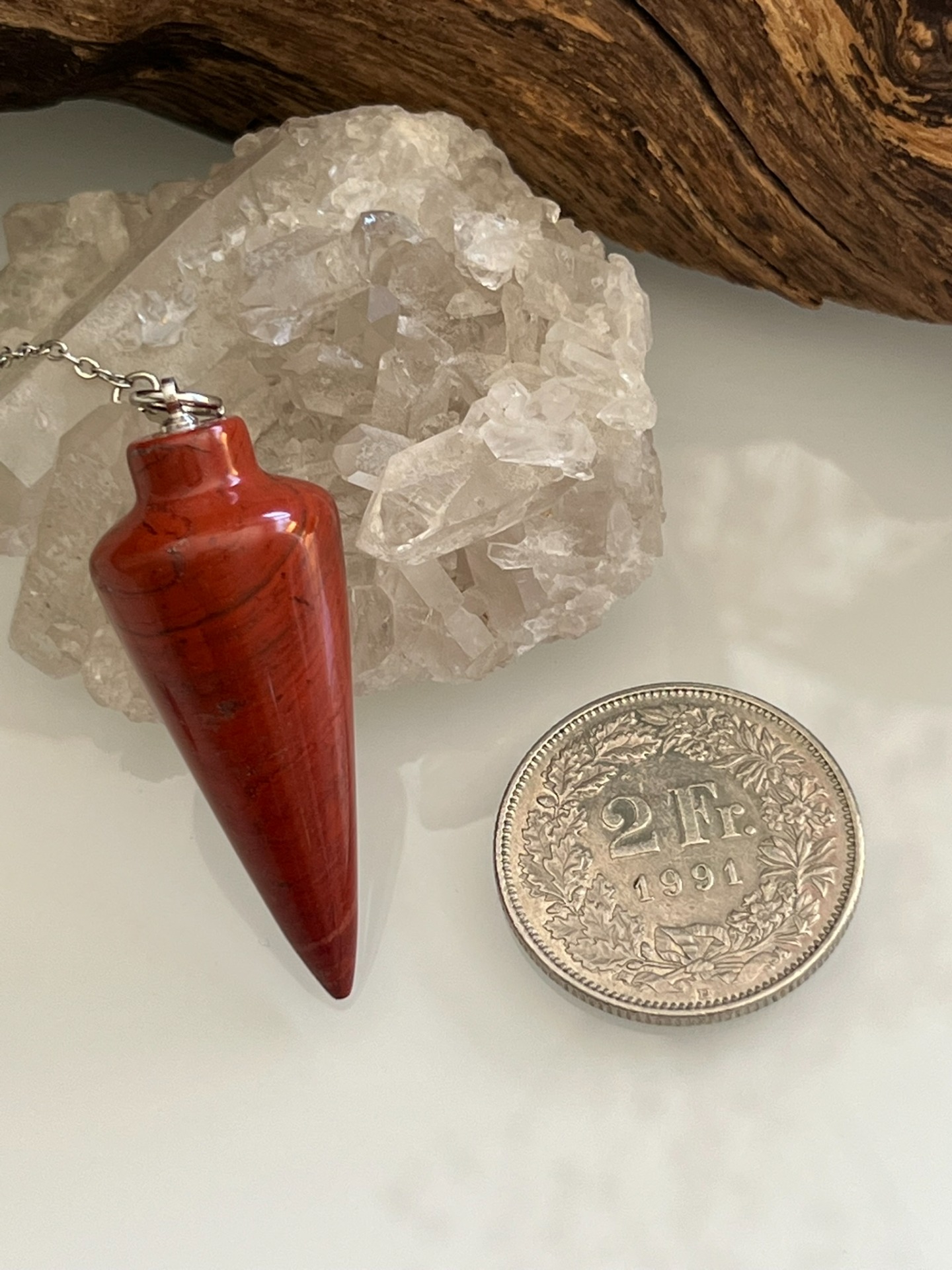Pendule facetté en pierre naturelle de Jaspe Rouge, accompagné de sa chaînette en métal argenté et d'une bille assortie.