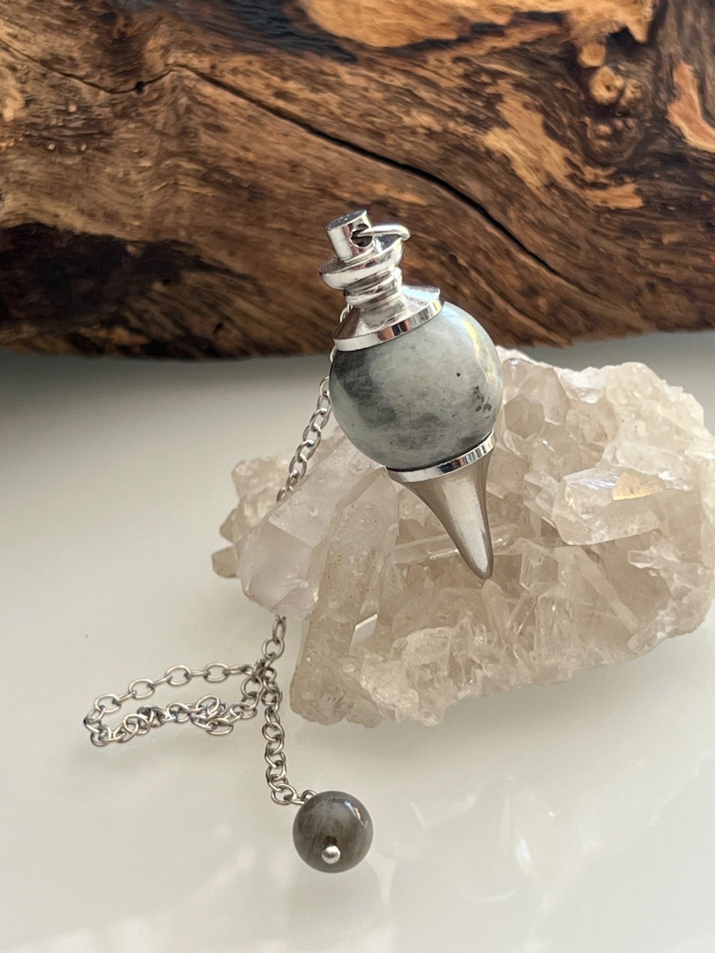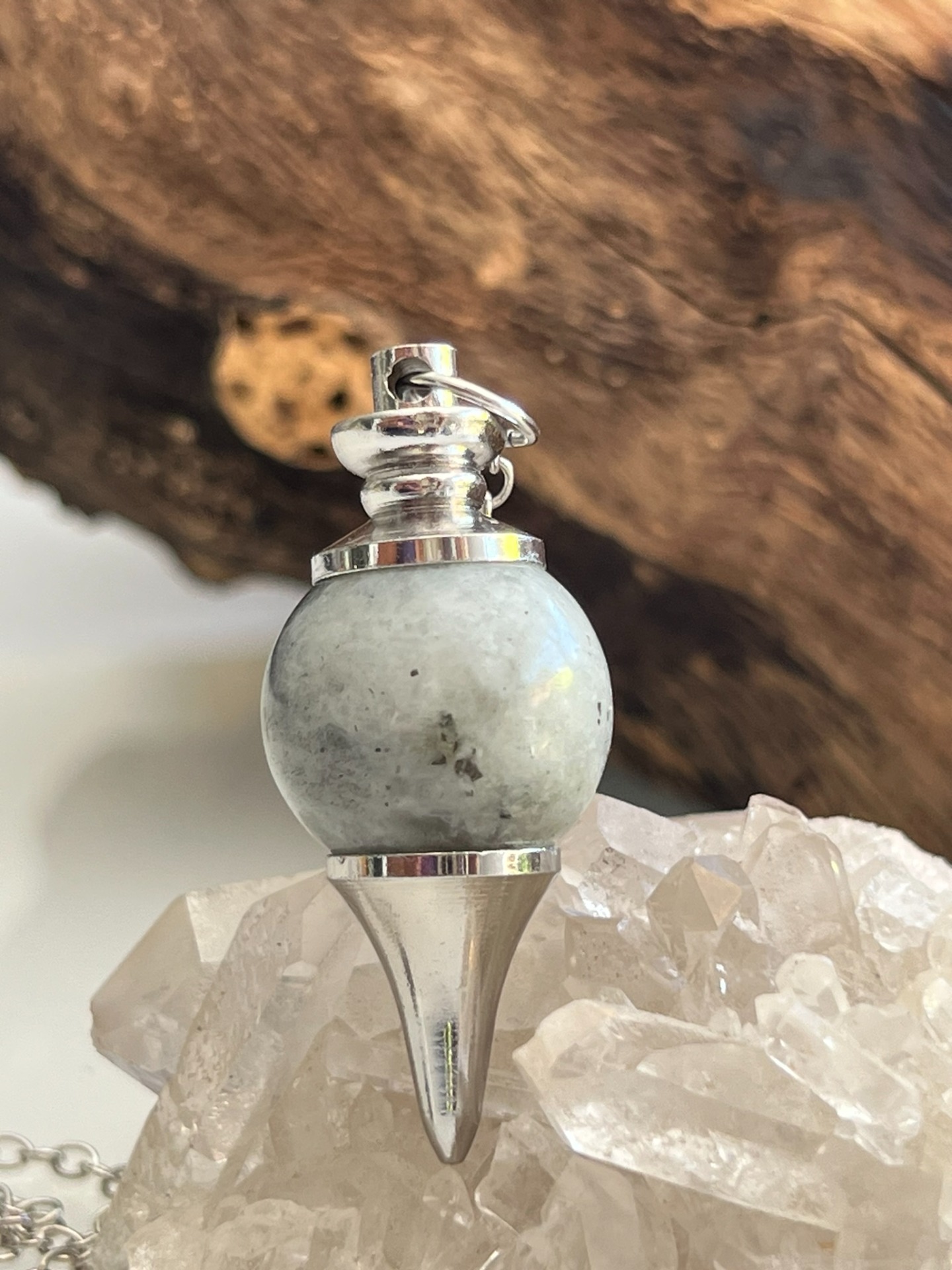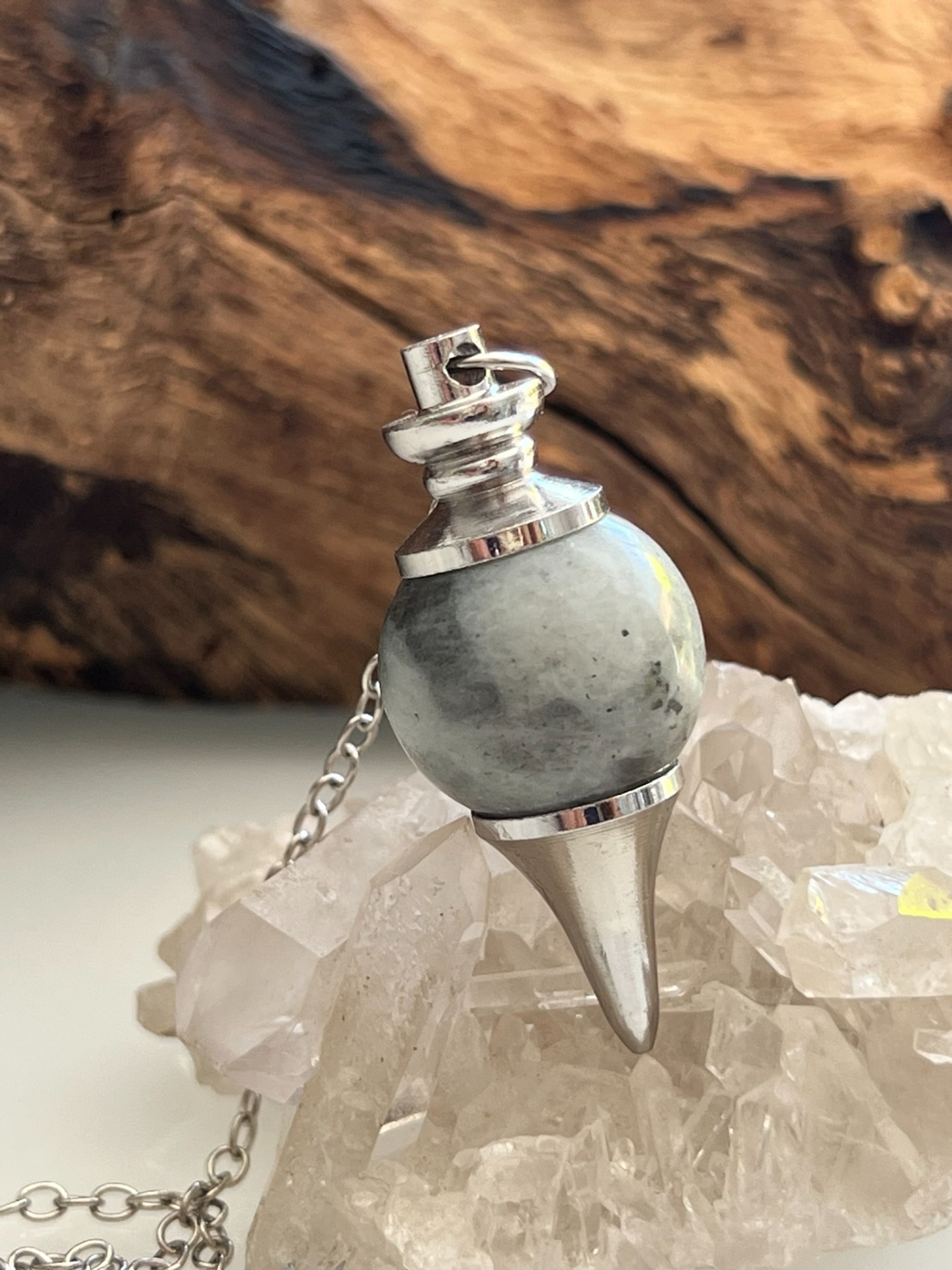 Pendule en pierre naturelle de Labradorite, accompagné de sa chaînette en métal argenté.
