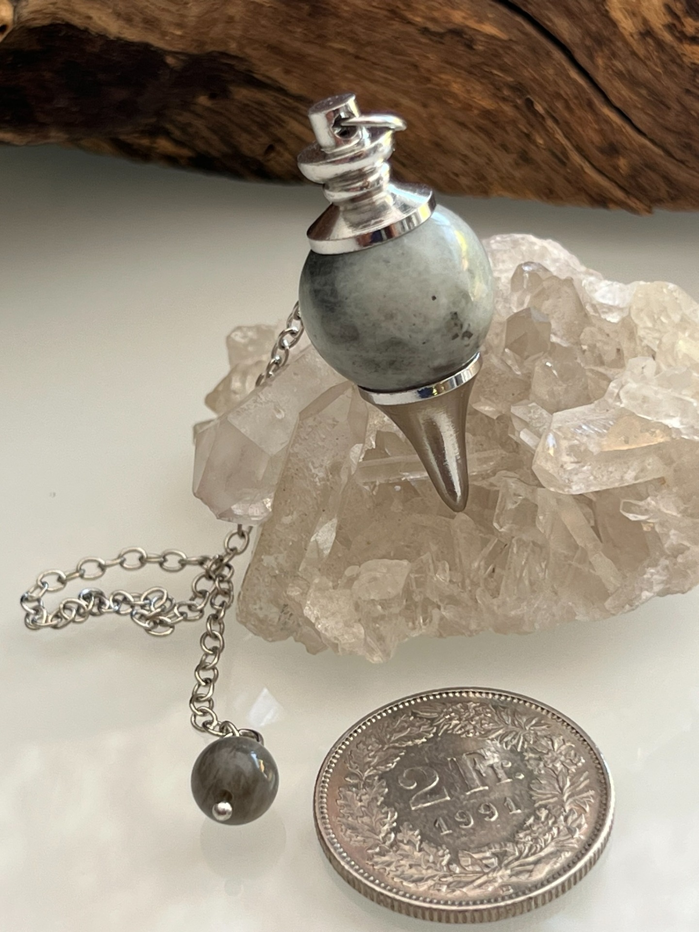 Chaînette en métal ≈ 20 cm • équilibre soigné • chaque pièce est purifiée et harmonisée à son arrivée • chaînette et boule d'extrémité remplacées et adaptées selon la vibration du pendule.