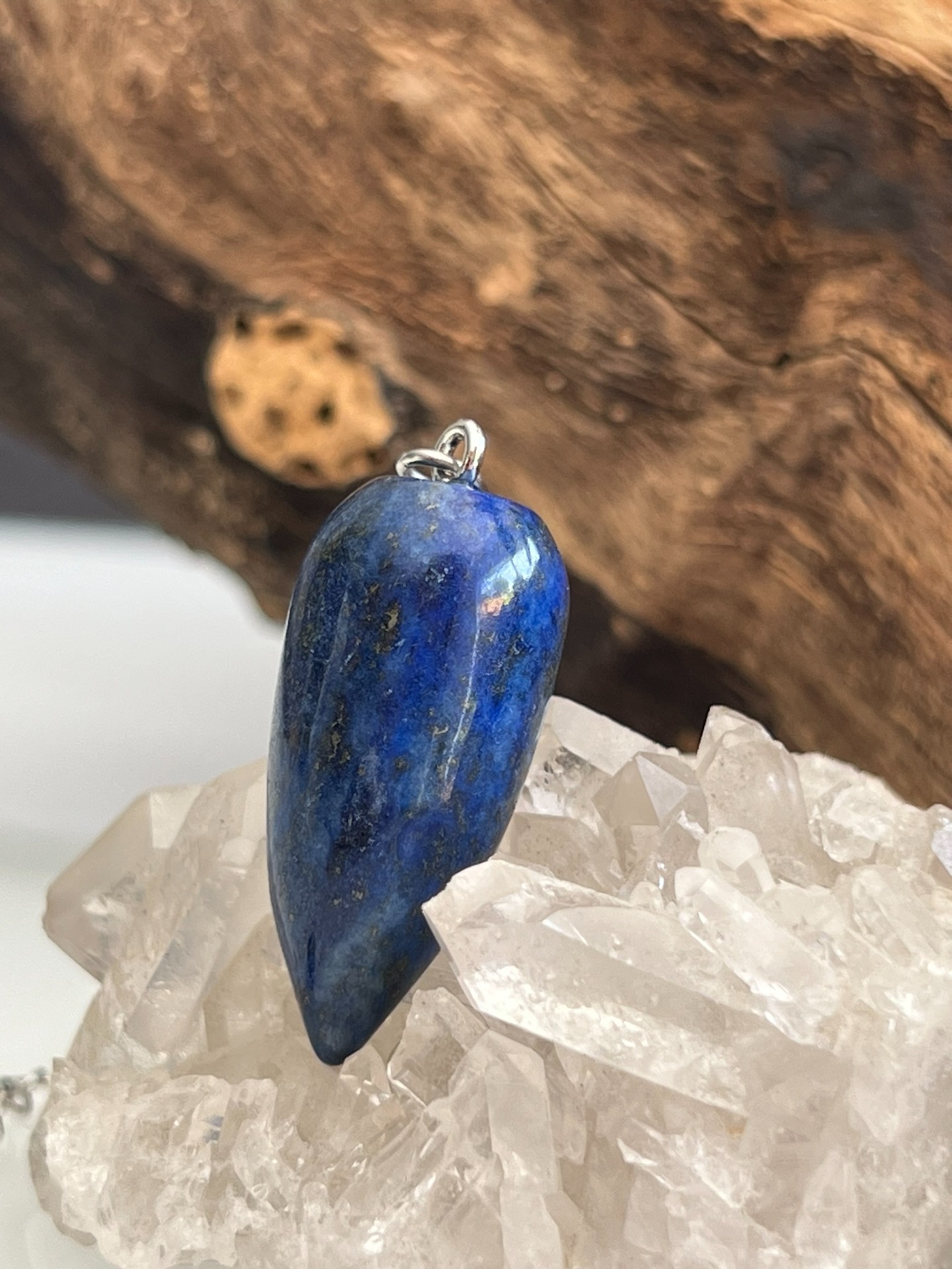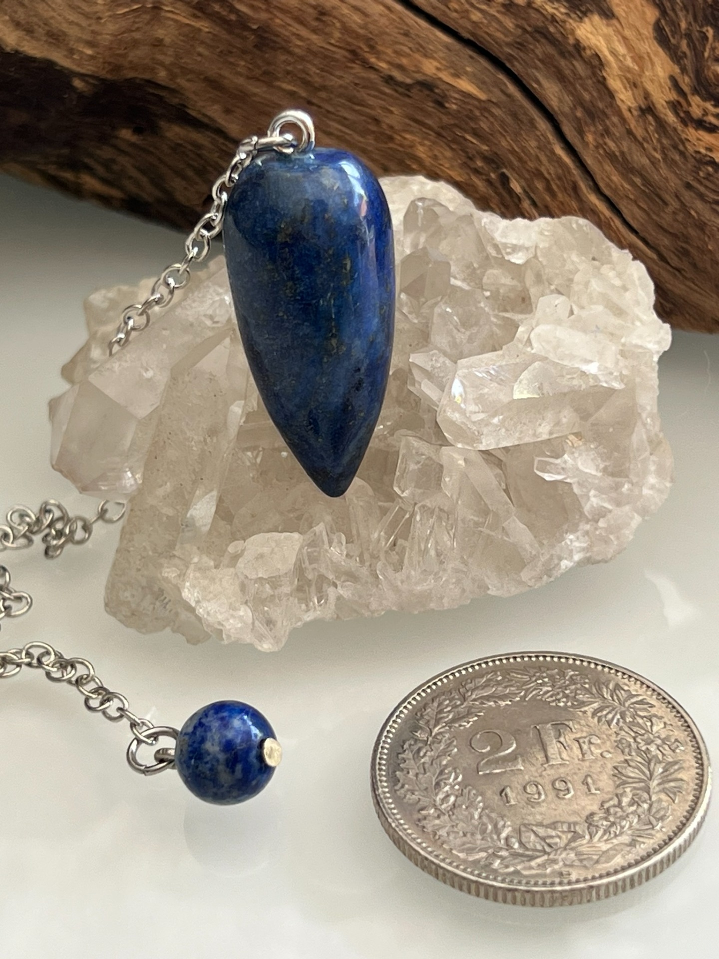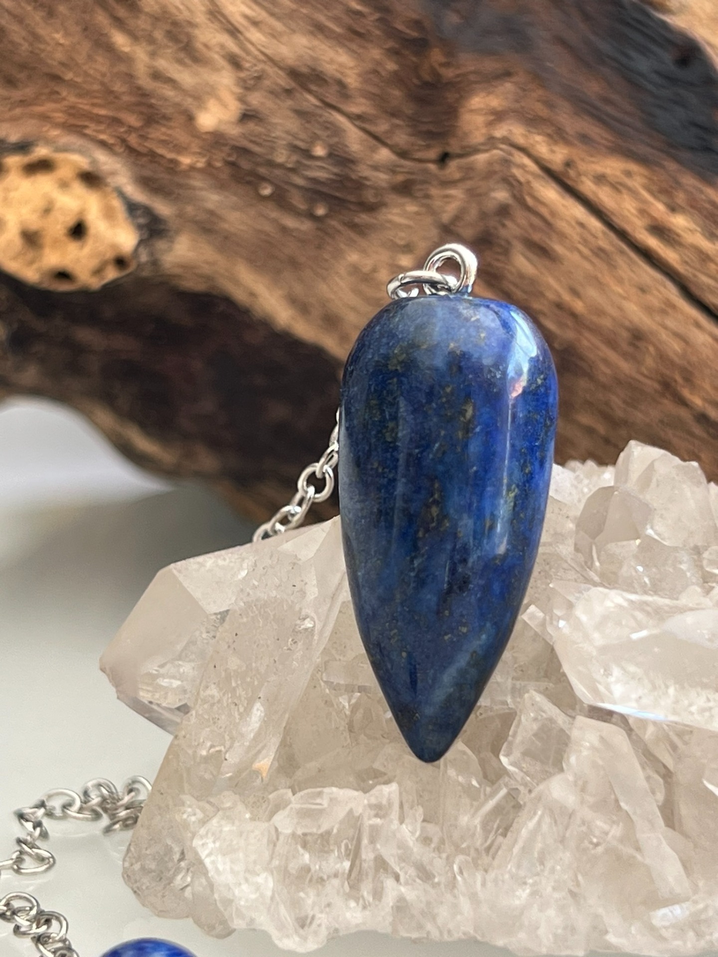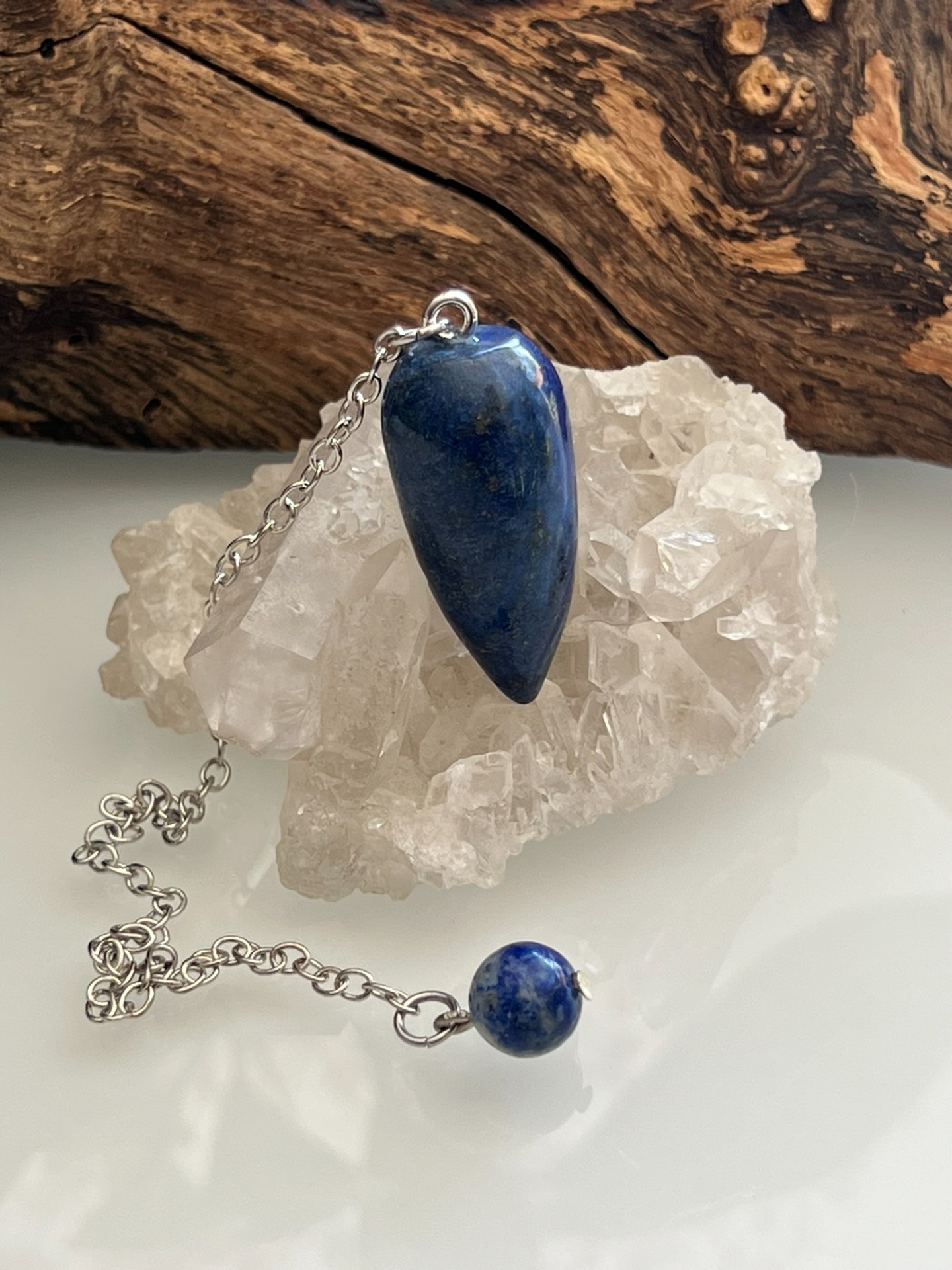 Le Lapis-Lazuli est une pierre de royauté et de connaissance, utilisée depuis l'Égypte ancienne pour favoriser la vision intérieure et la vérité. Elle ouvre l'esprit aux messages subtils, stimule les rêves et facilite le travail spirituel. En radiesthésie, ce pendule est un allié de choix pour les recherches liées à la sagesse, la vérité et la guérison énergétique.
