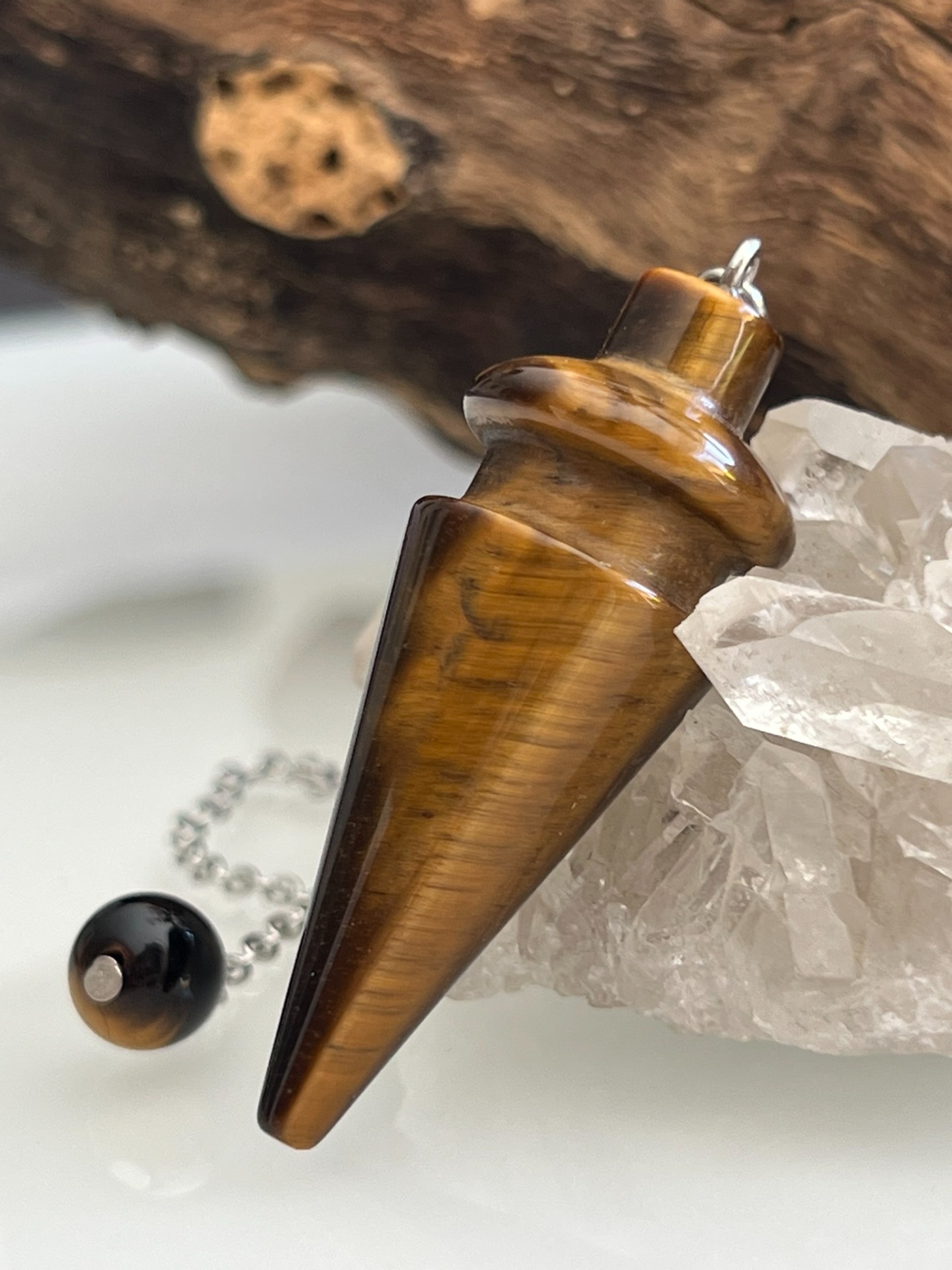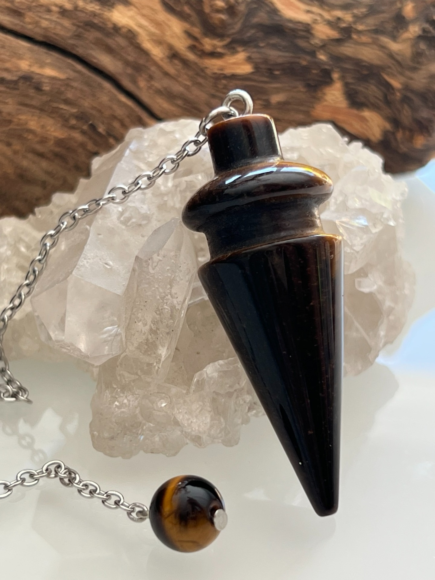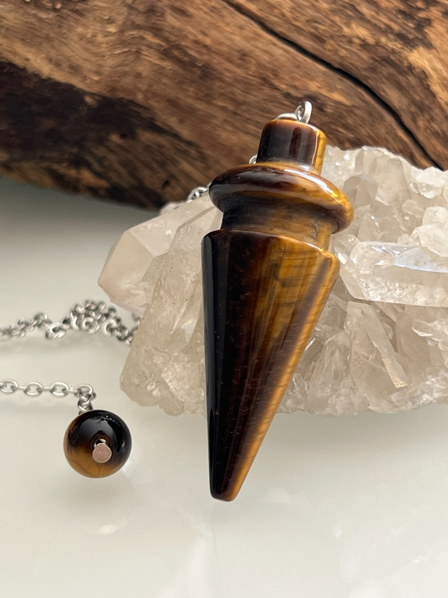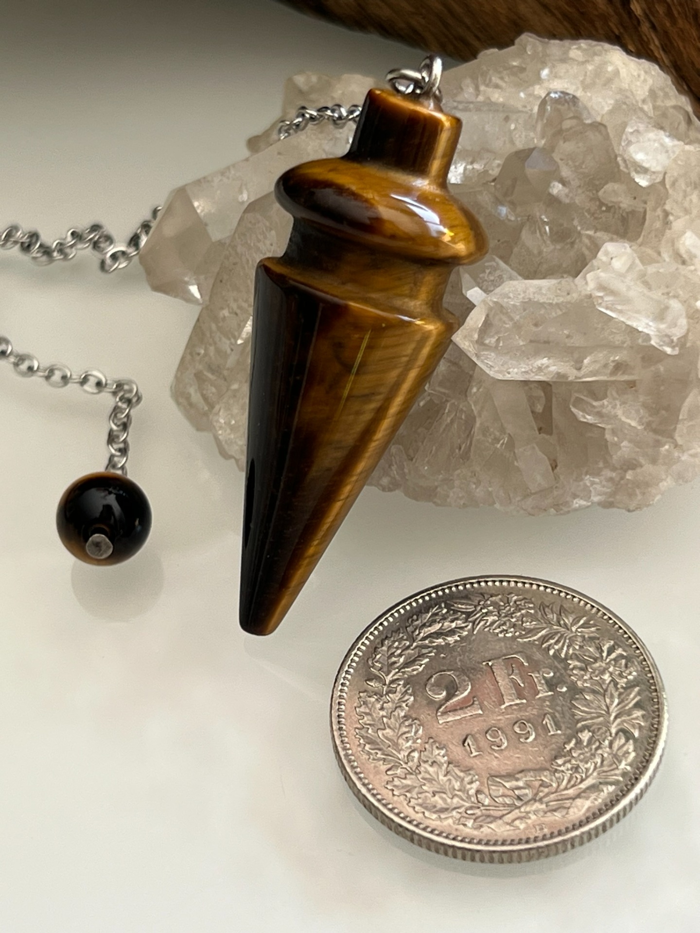 Pendule en pierre naturelle d'Œil de Tigre, accompagné de sa chaînette en métal argenté et d'une bille assortie.