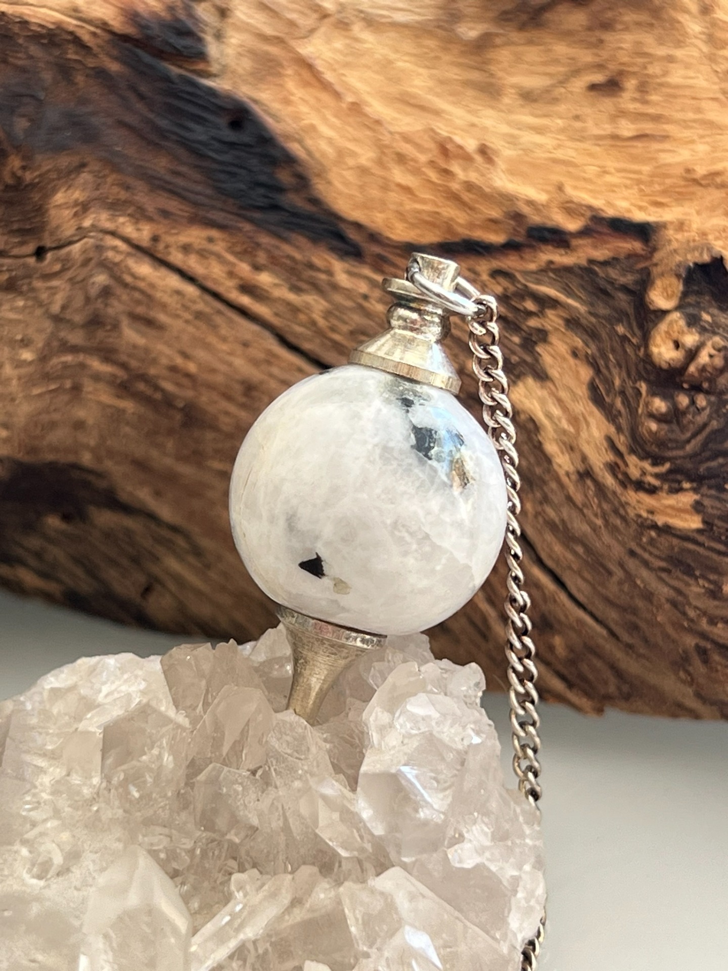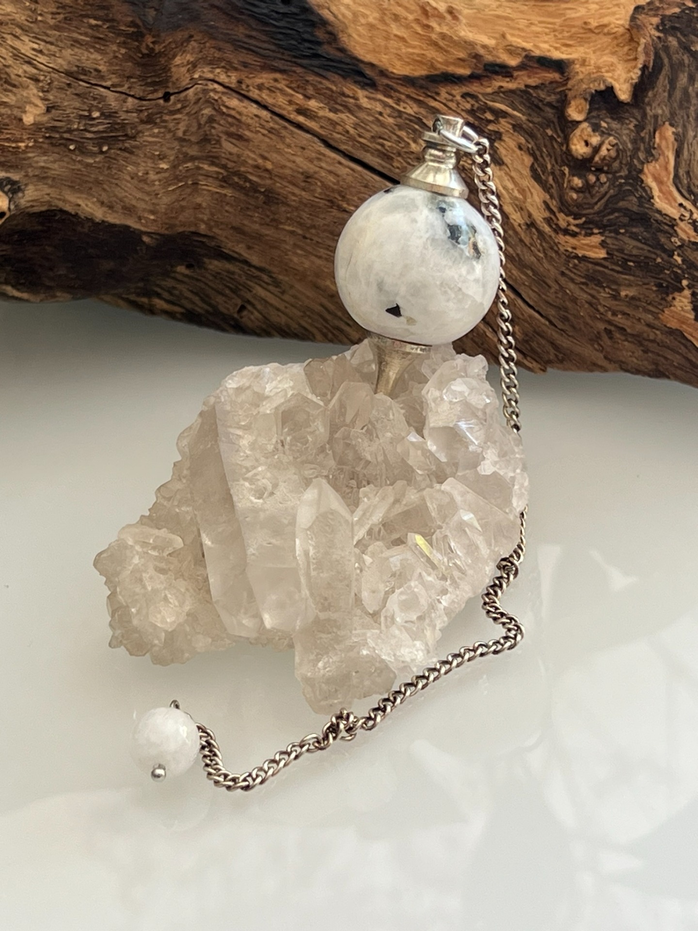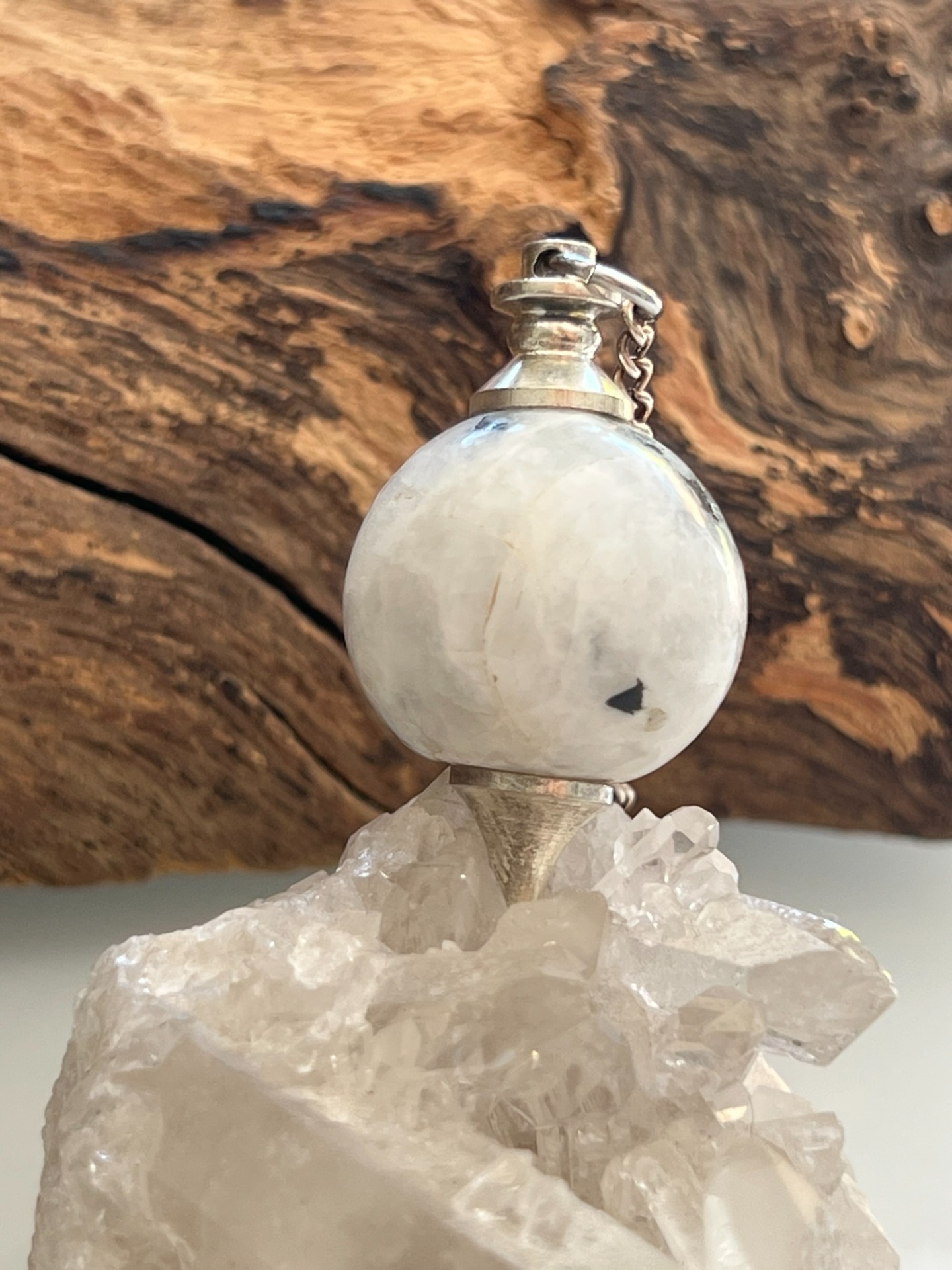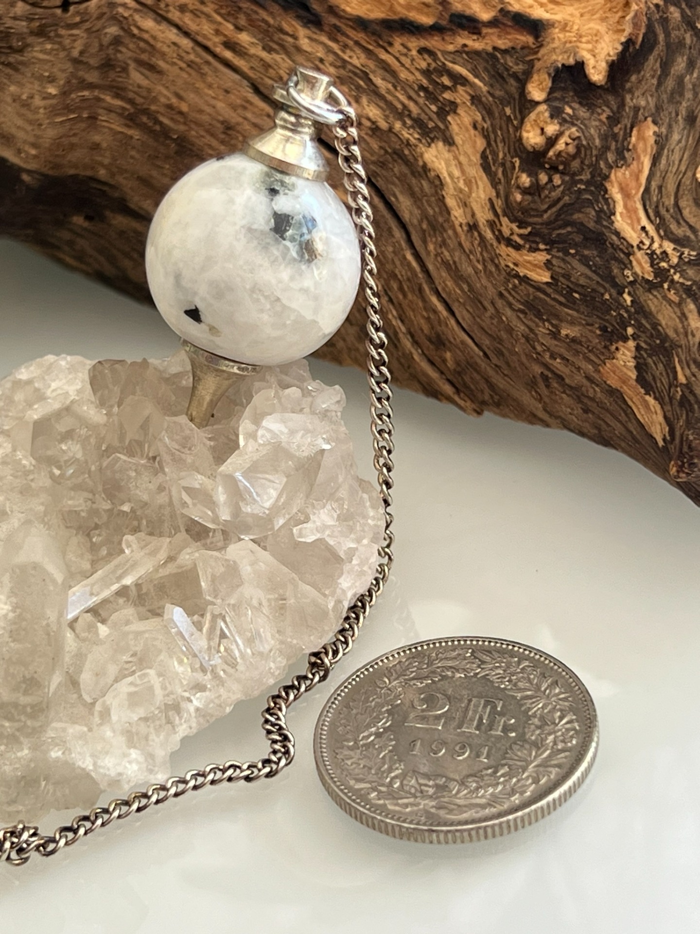 Pendule en pierre naturelle de Pierre de Lune, accompagné de sa chaînette en métal argenté.