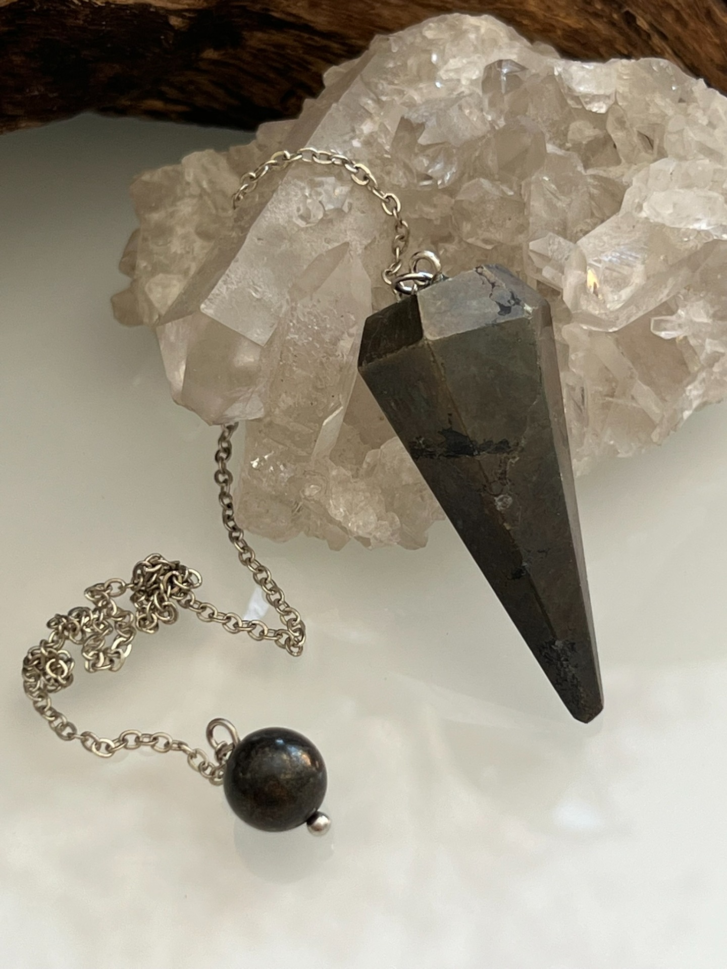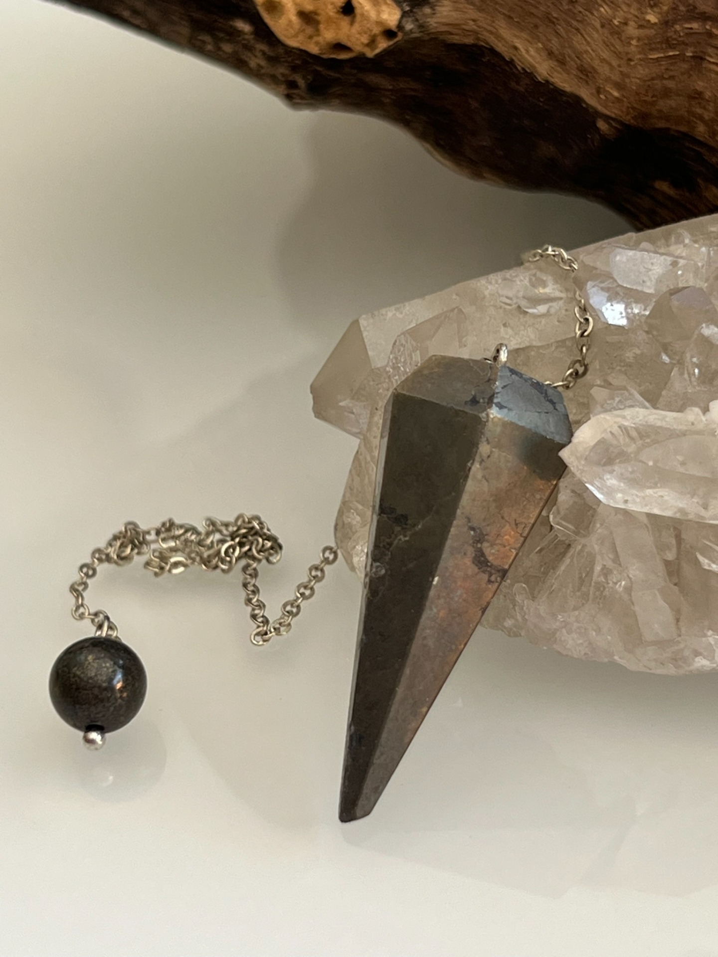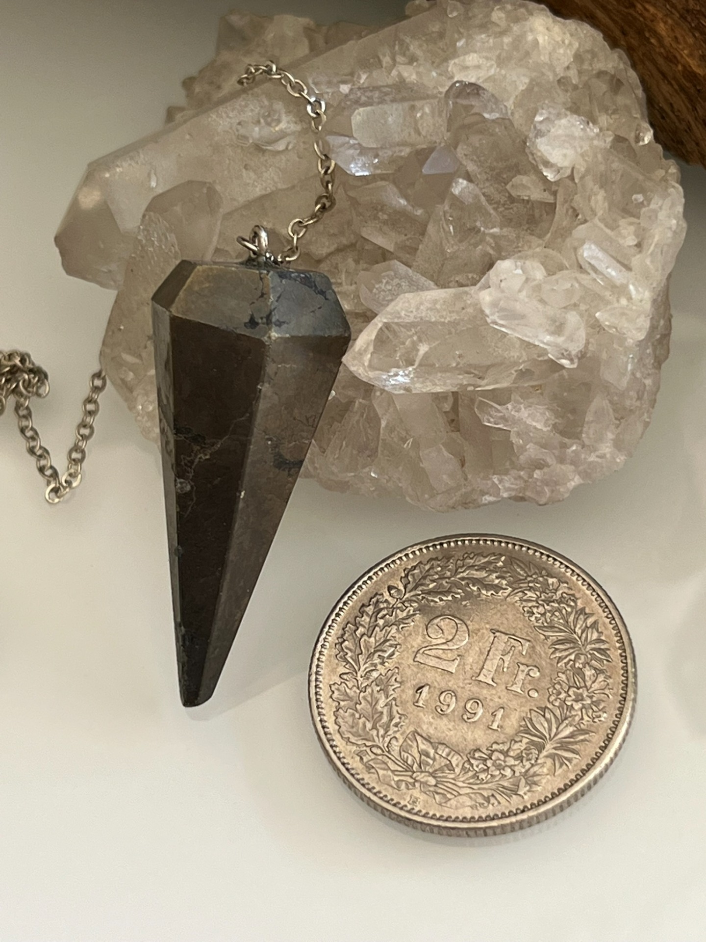 Pendule facetté en pierre naturelle de Pyrite, accompagné de sa chaînette en métal argenté et d'une bille assortie.