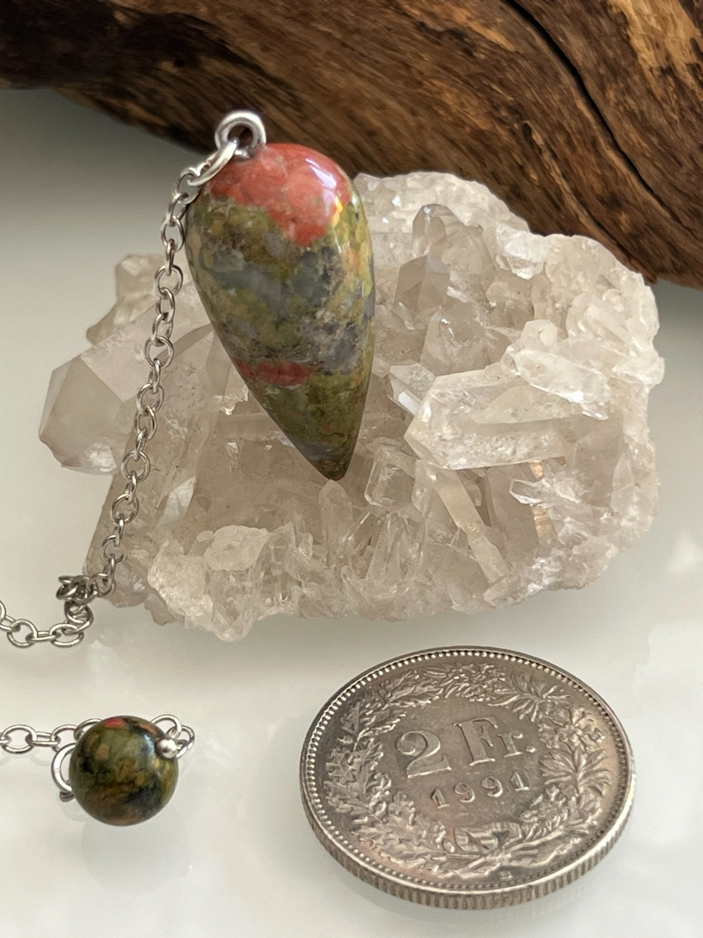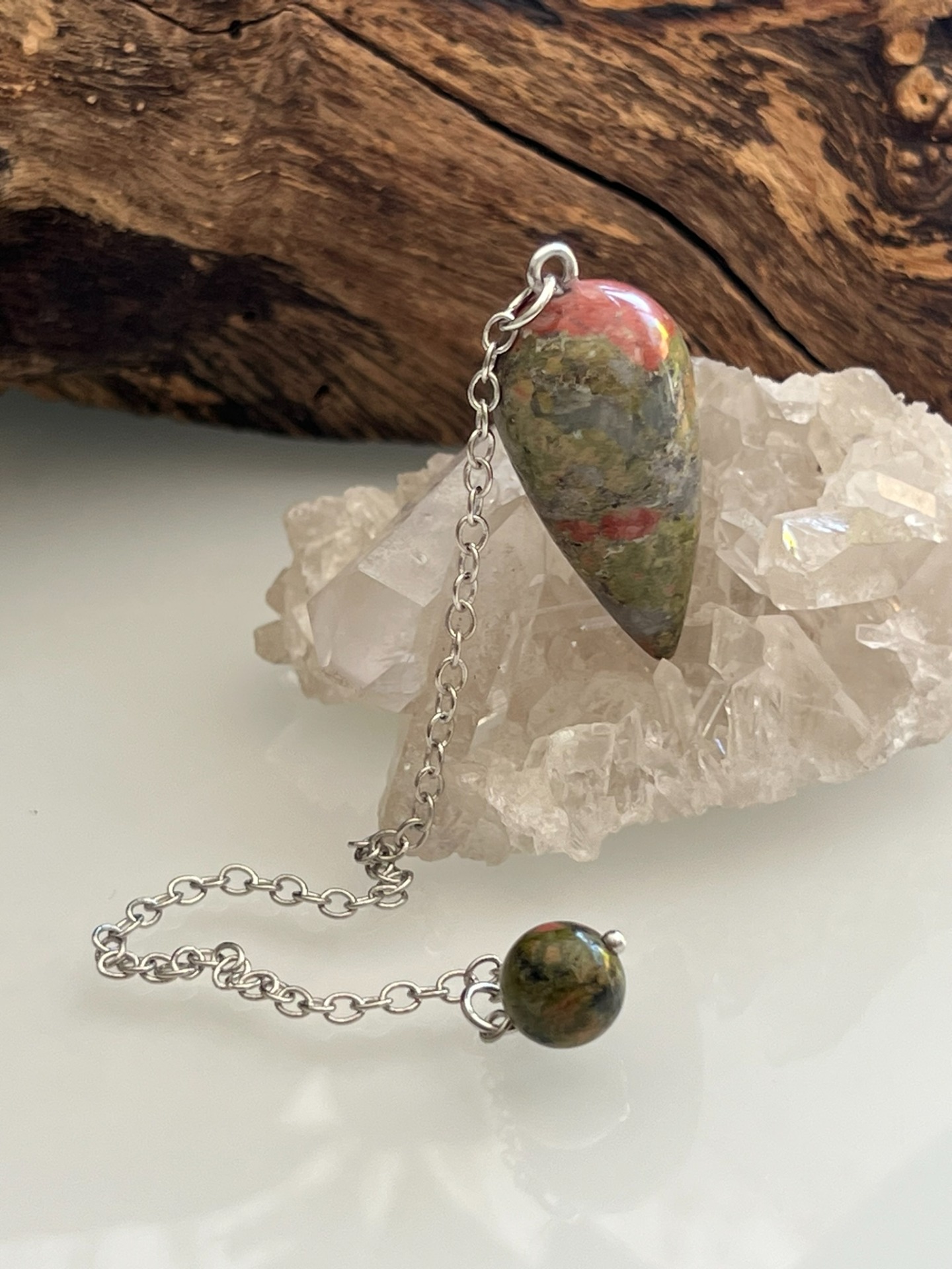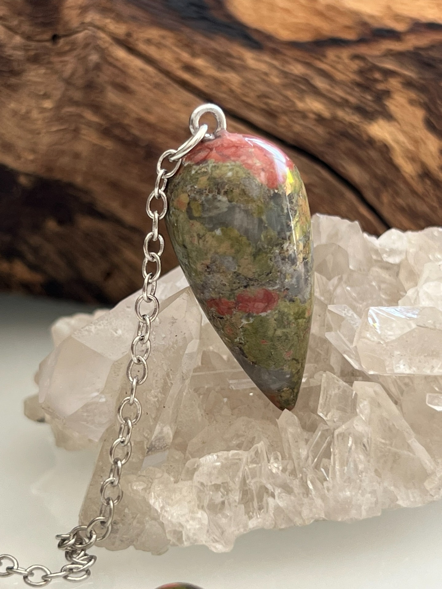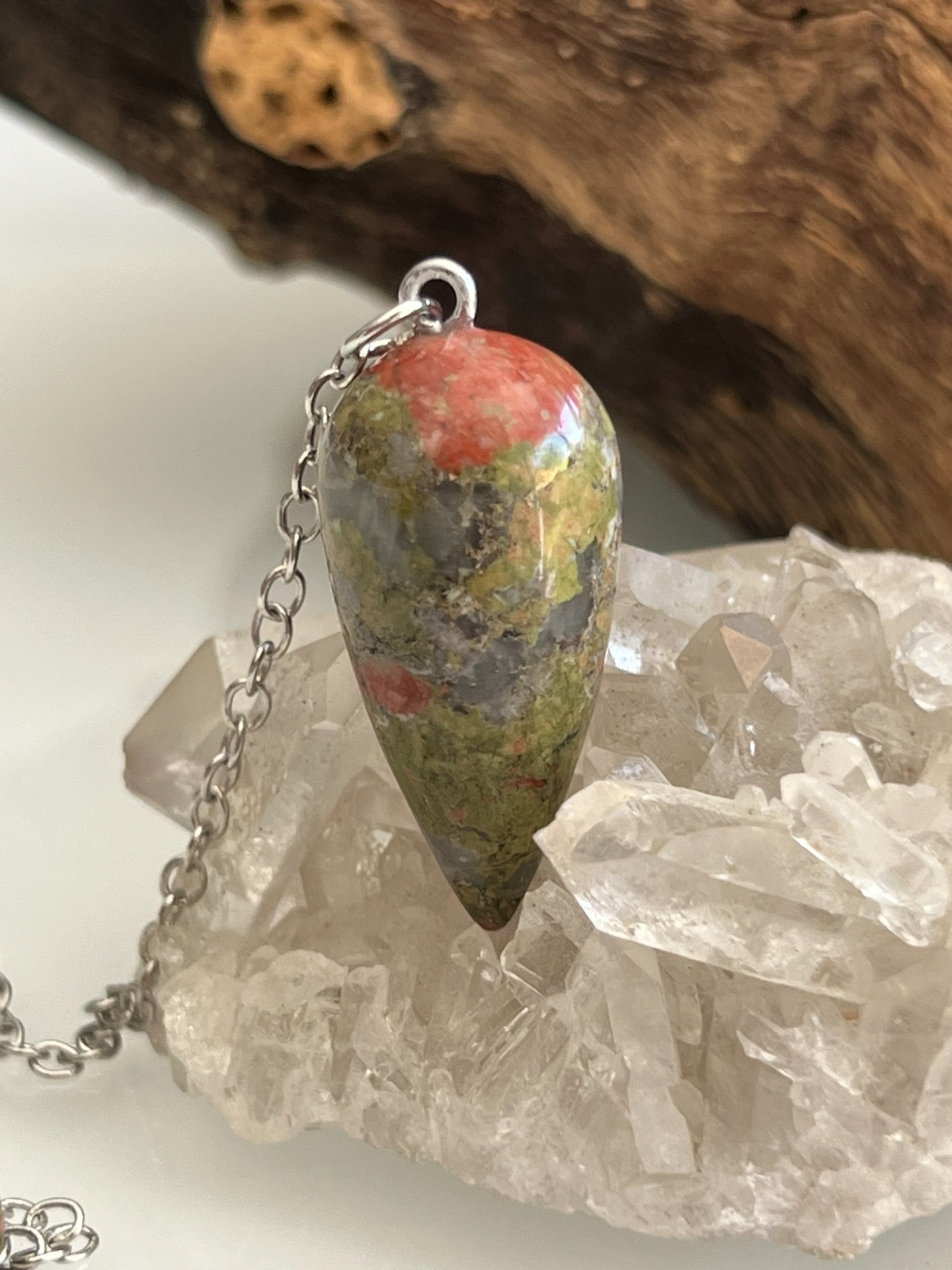 Pendule en pierre naturelle d'Unakite, accompagné de sa chaînette en métal argenté.