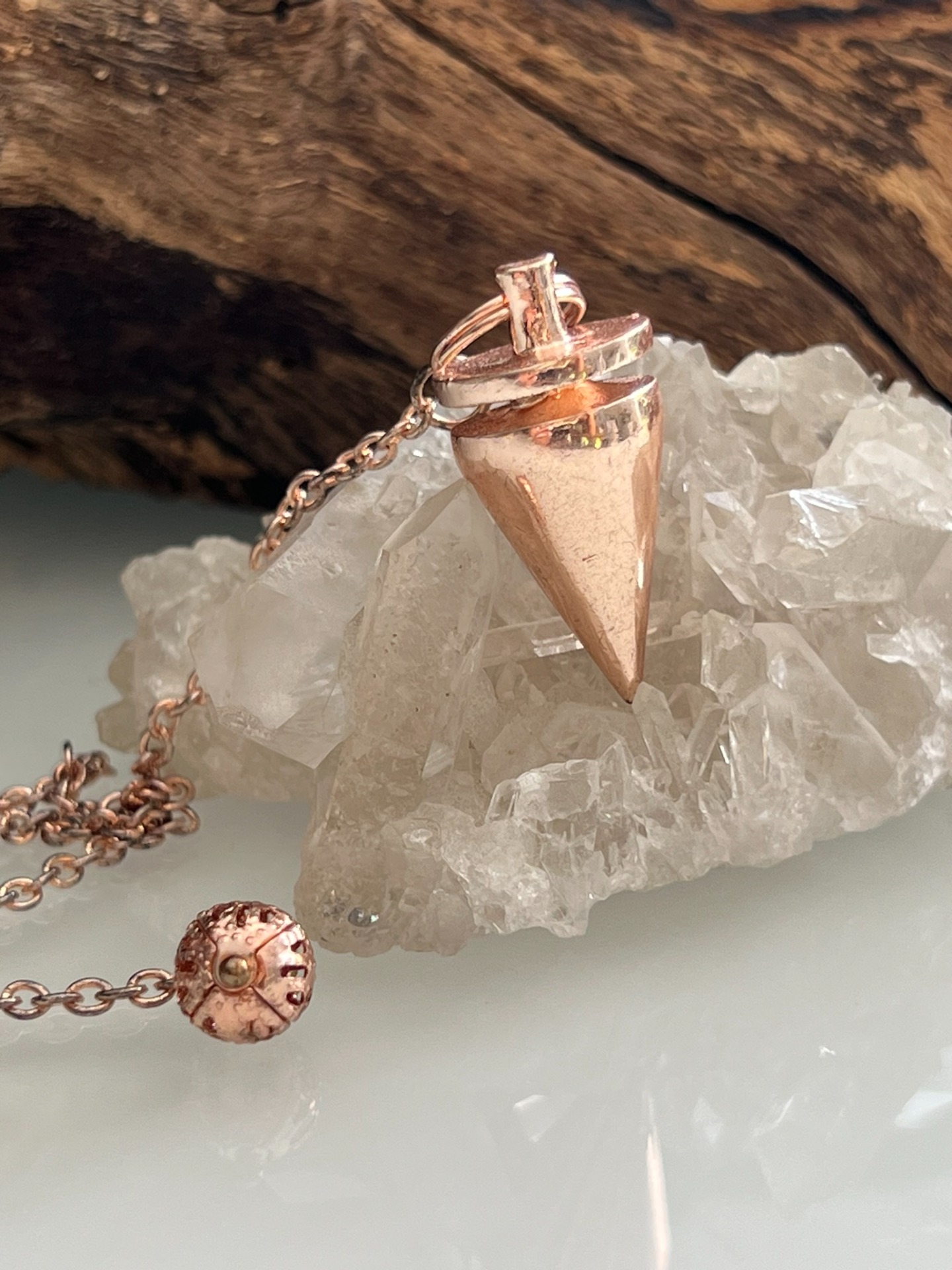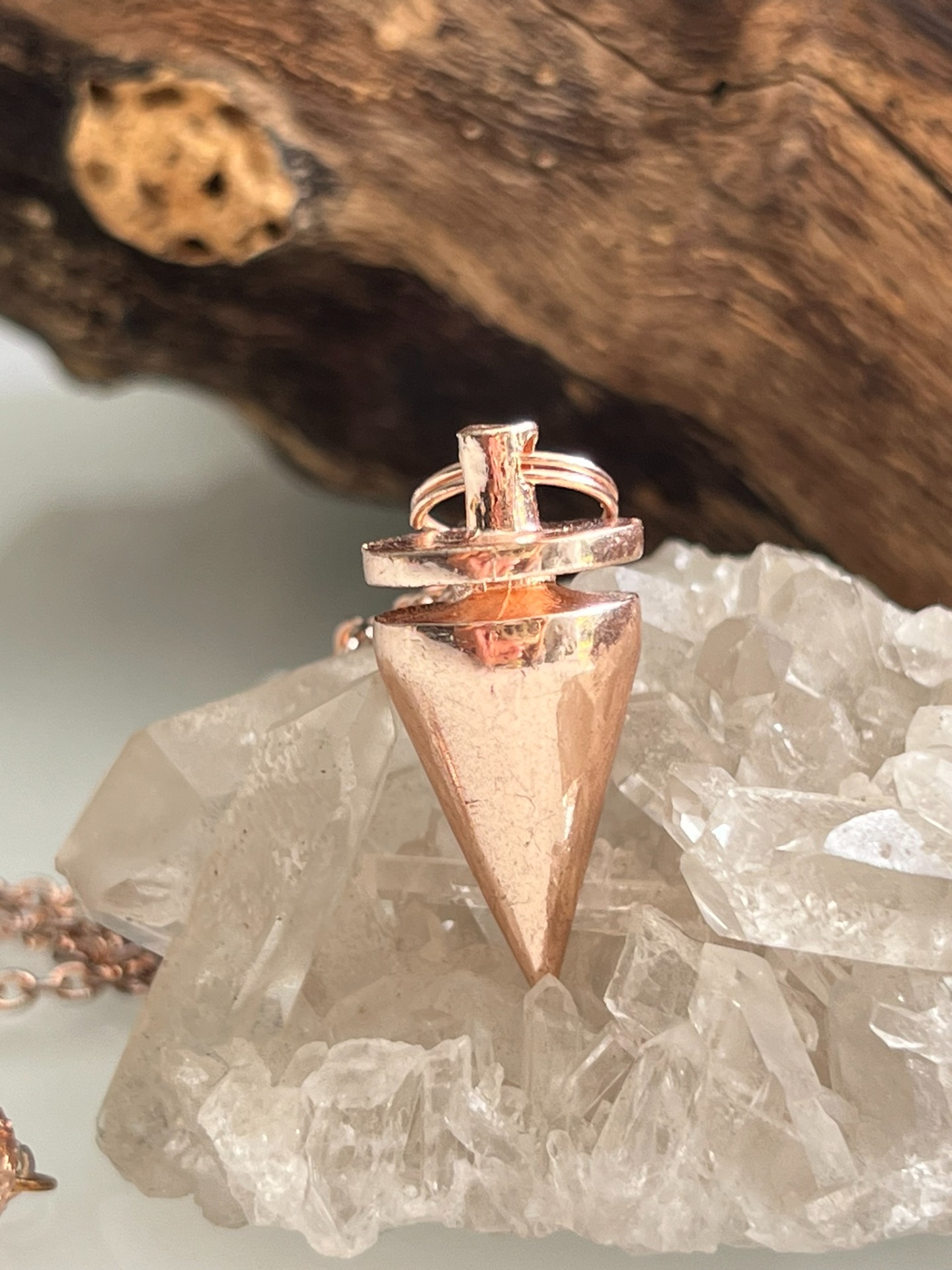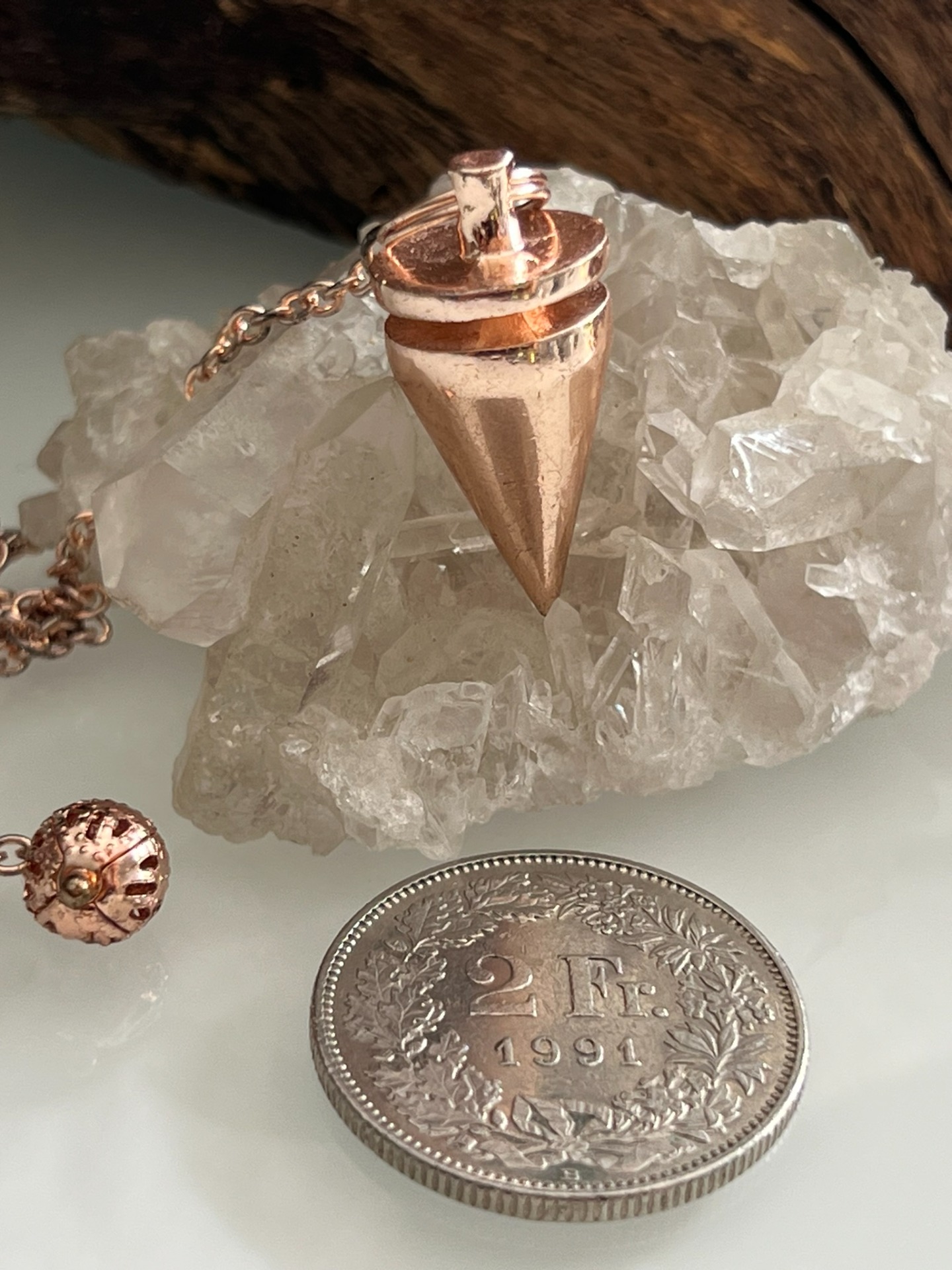 Ce pendule, à l'élégance cuivrée, offre une vibration vive et précise, idéale pour les recherches rapides et les questionnements clairs. Sa pointe accentue la concentration de l'énergie, facilitant des réponses nettes et directes.