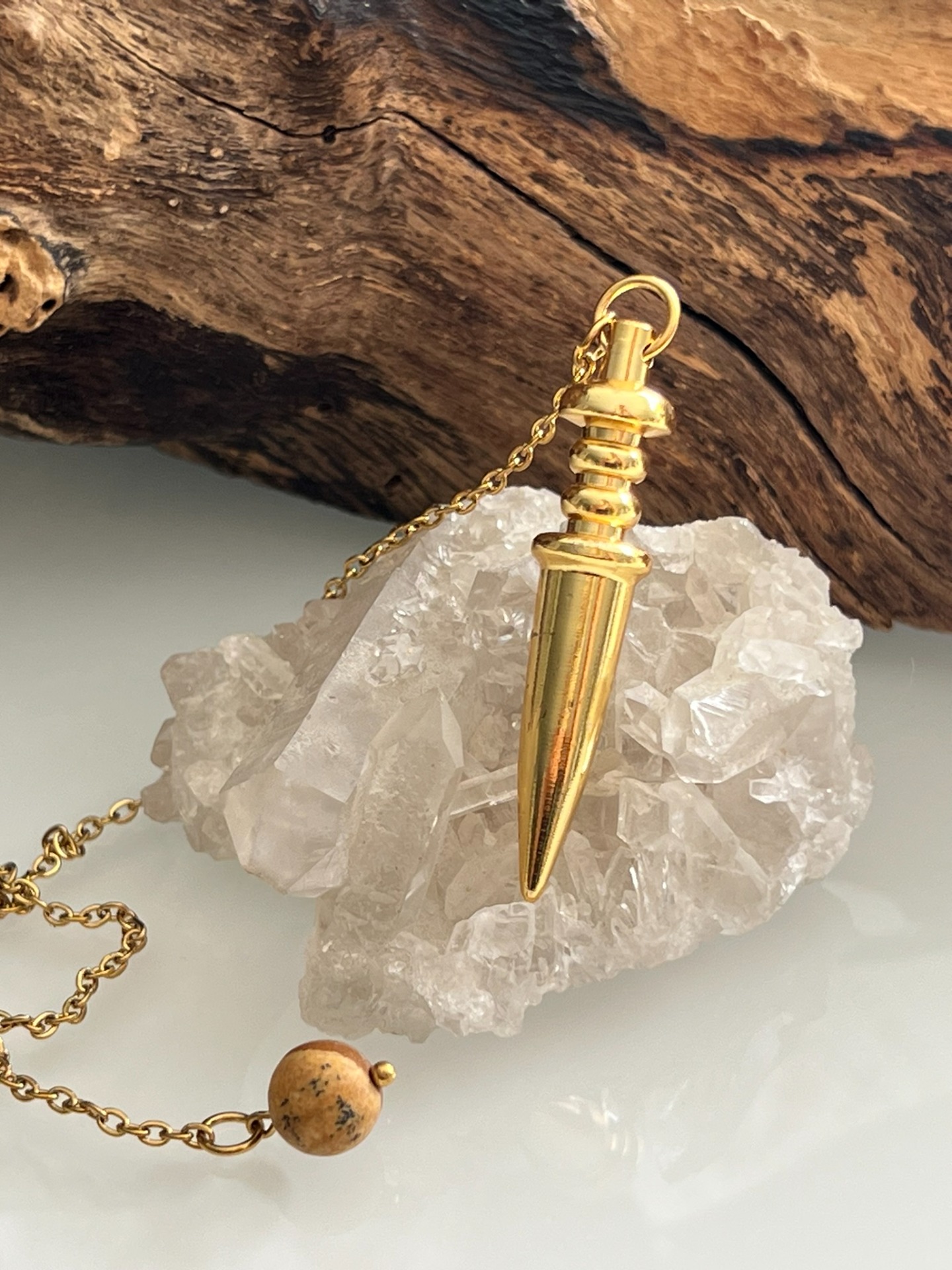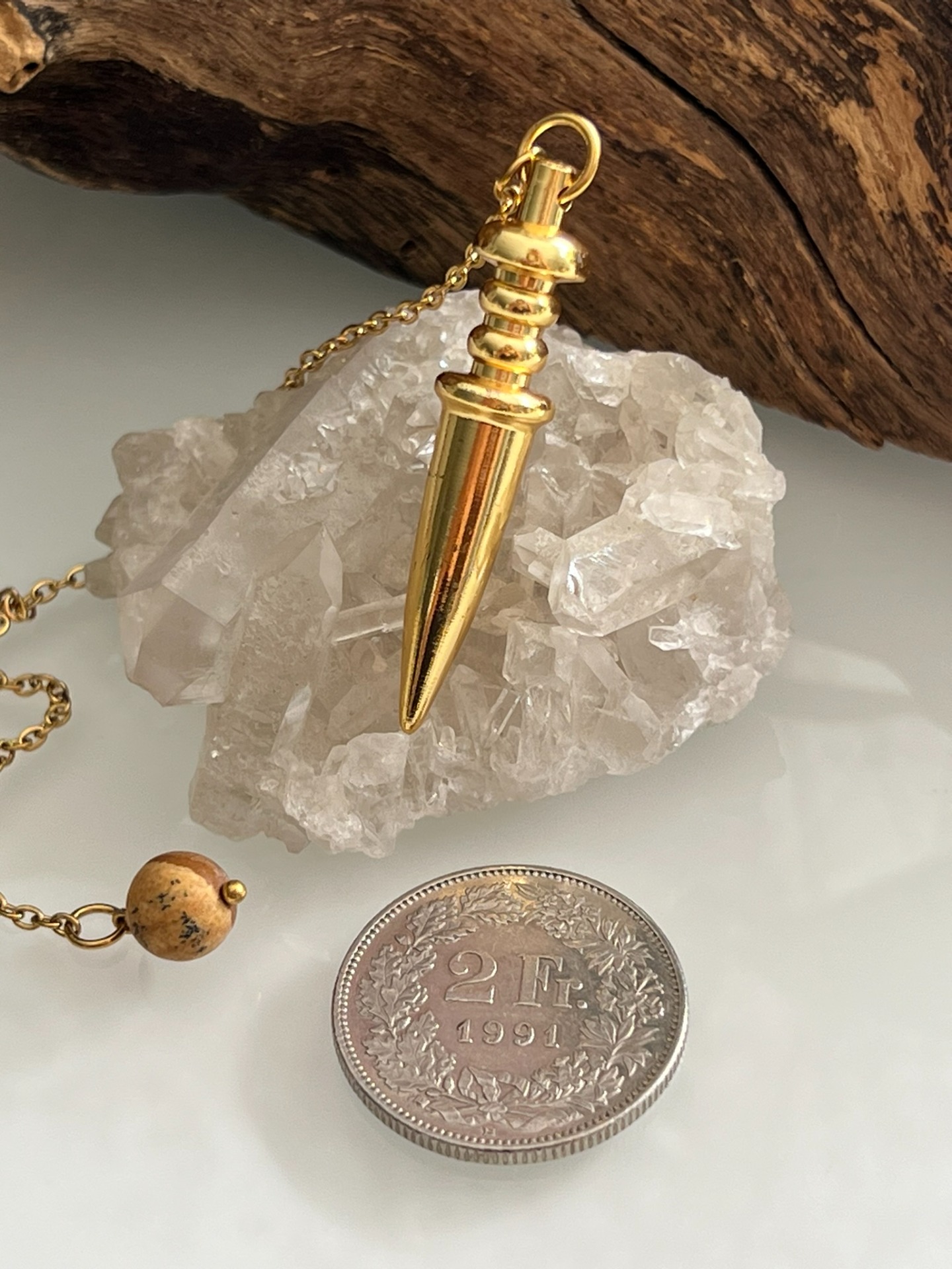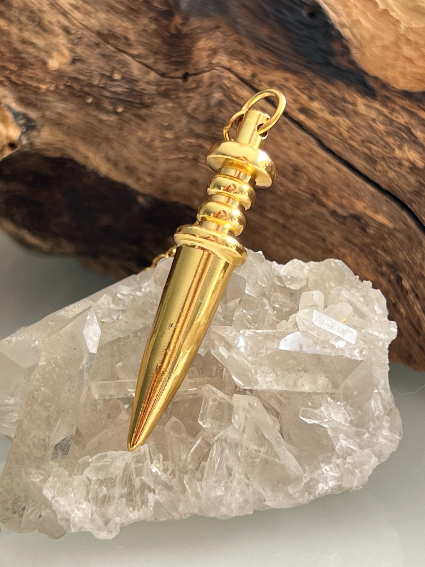 Métal doré de justesse et de stabilité énergétique — ce pendule se distingue par sa pointe allongée qui capte et transmet les vibrations avec rapidité. Il est idéal pour obtenir des réponses nettes et précises lors des séances de radiesthésie, tout en conservant une belle fluidité dans le mouvement.