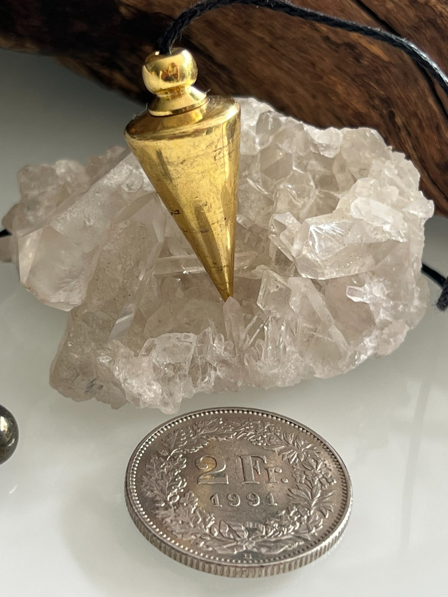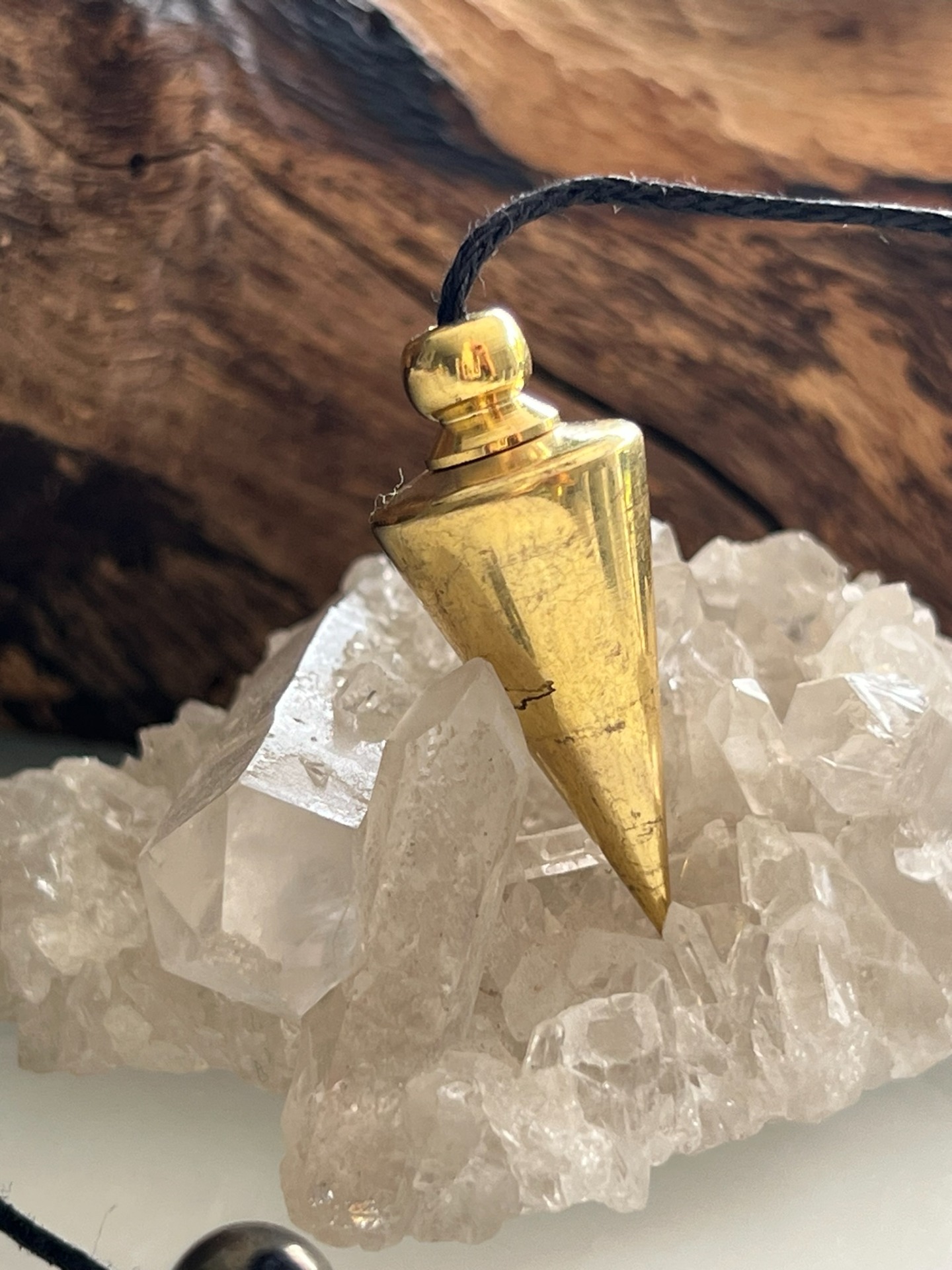 Le métal doré diffuse une vibration solaire et équilibrante, tandis que le coton apporte une touche plus douce et naturelle à l'ensemble, facilitant l'usage quotidien. C'est un pendule polyvalent, idéal aussi bien pour les recherches que pour les pratiques énergétiques où l'on recherche clarté, stabilité et fluidité.
