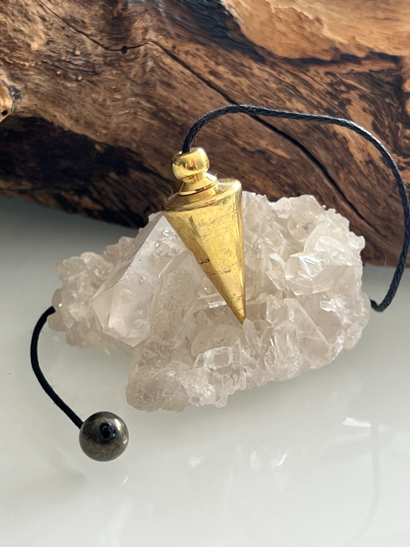 Chaînette en coton ≈ 20 cm • équilibre soigné • chaque pièce est purifiée et harmonisée à son arrivée • chaînette et boule d'extrémité remplacées et adaptées selon la vibration du pendule.