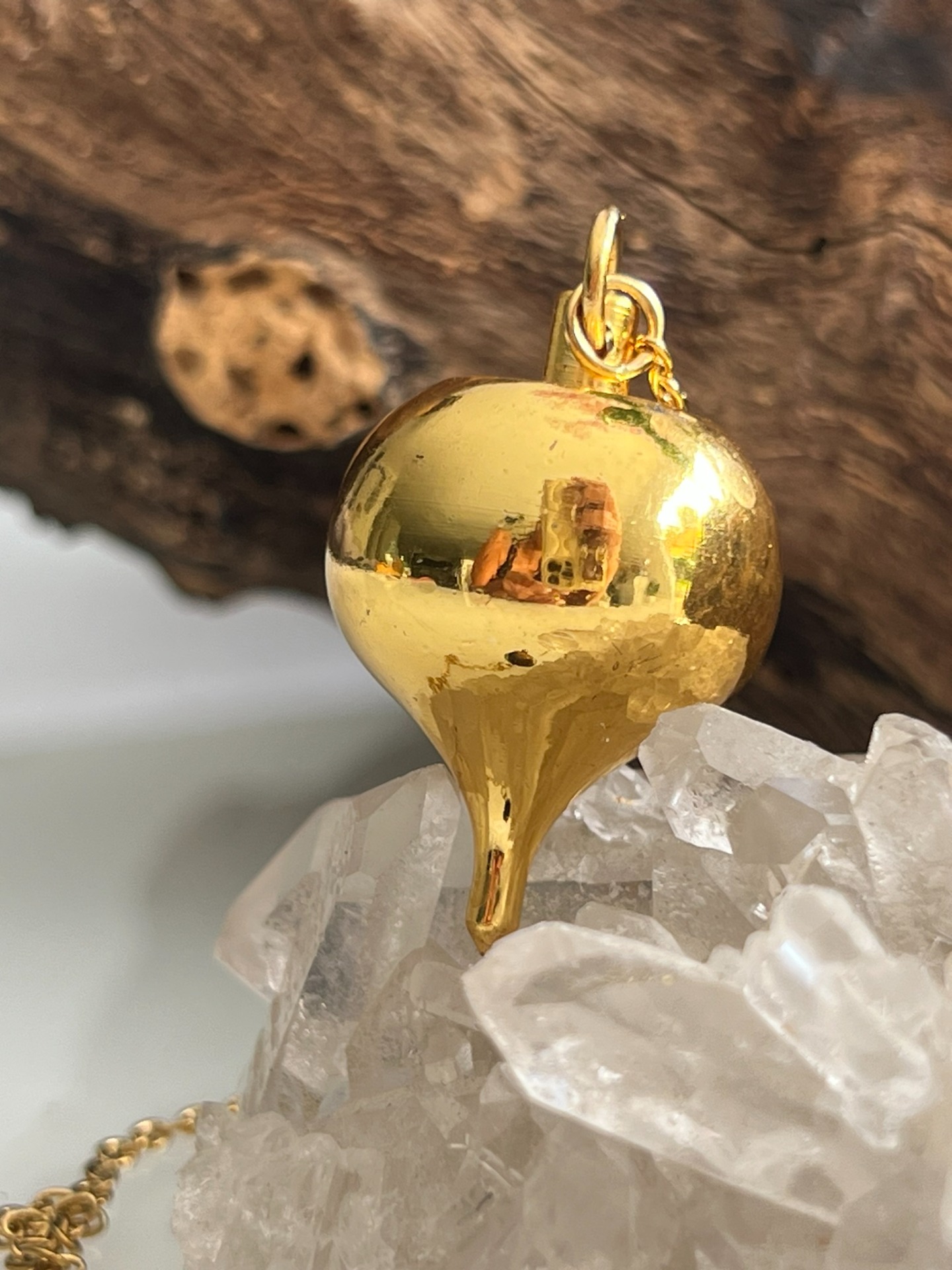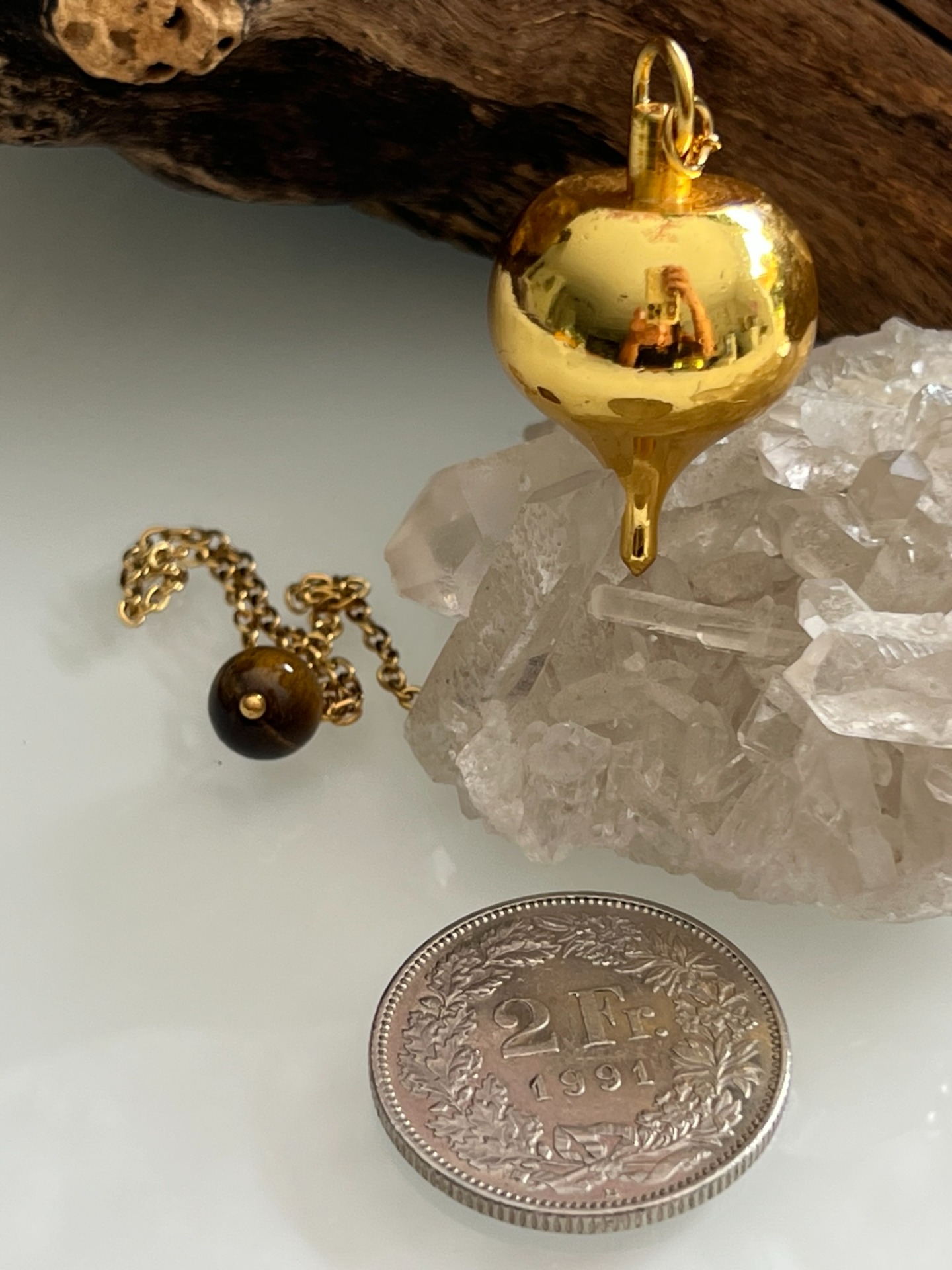 Chaînette en coton ≈ 20 cm • équilibre soigné • chaque pièce est purifiée et harmonisée à son arrivée • chaînette et boule d'extrémité remplacées et adaptées selon la vibration du pendule.