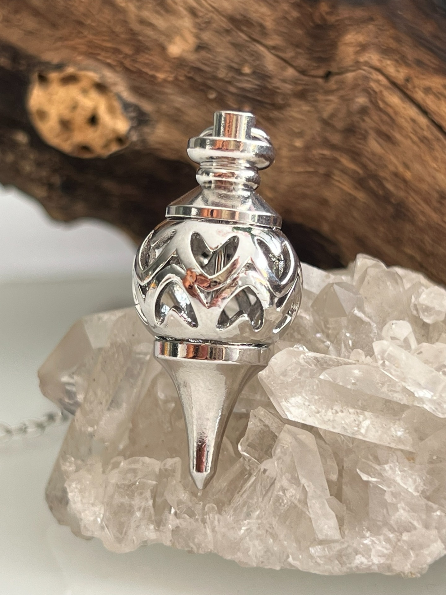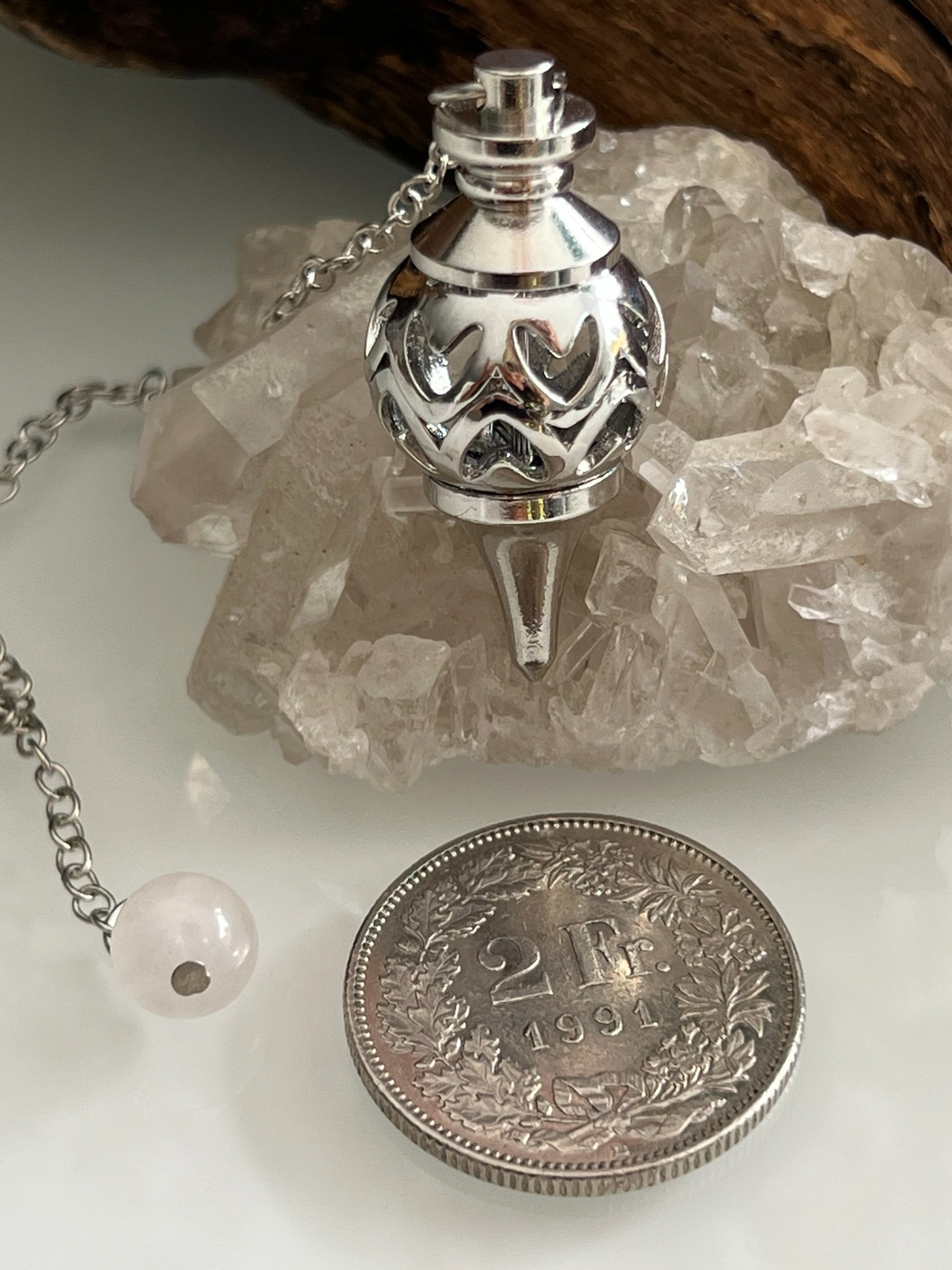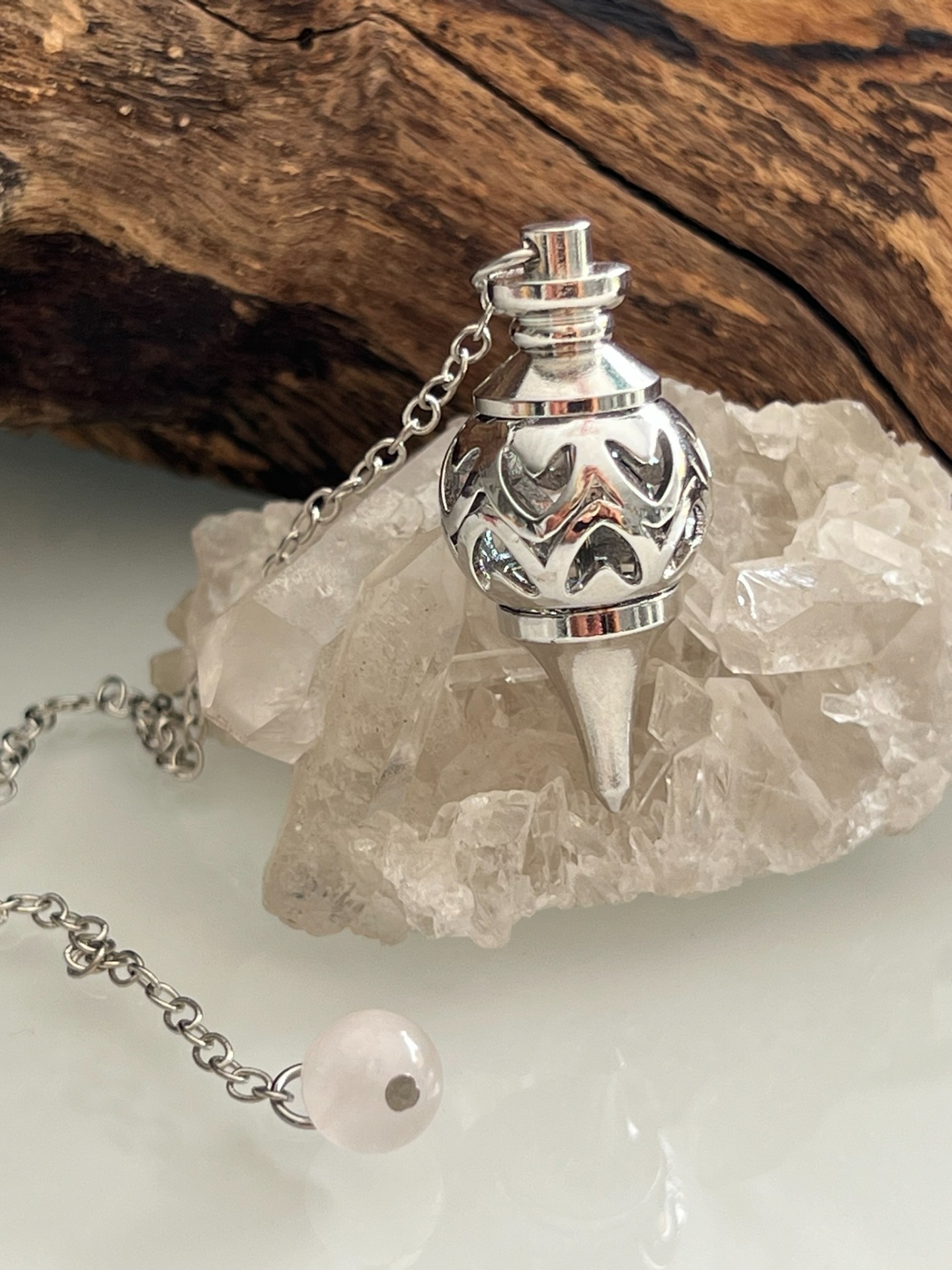 Métal de neutralité et de clarté — l'argenté équilibre et reflète les énergies. Sa forme ajourée diffuse une vibration subtile et fluide, idéale pour les recherches délicates et les pratiques énergétiques douces. La chaîne est terminée par une boule en quartz rose, renforçant l'harmonie du cœur et l'ouverture affective.