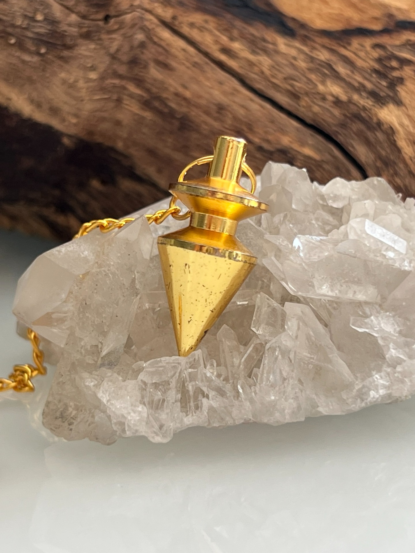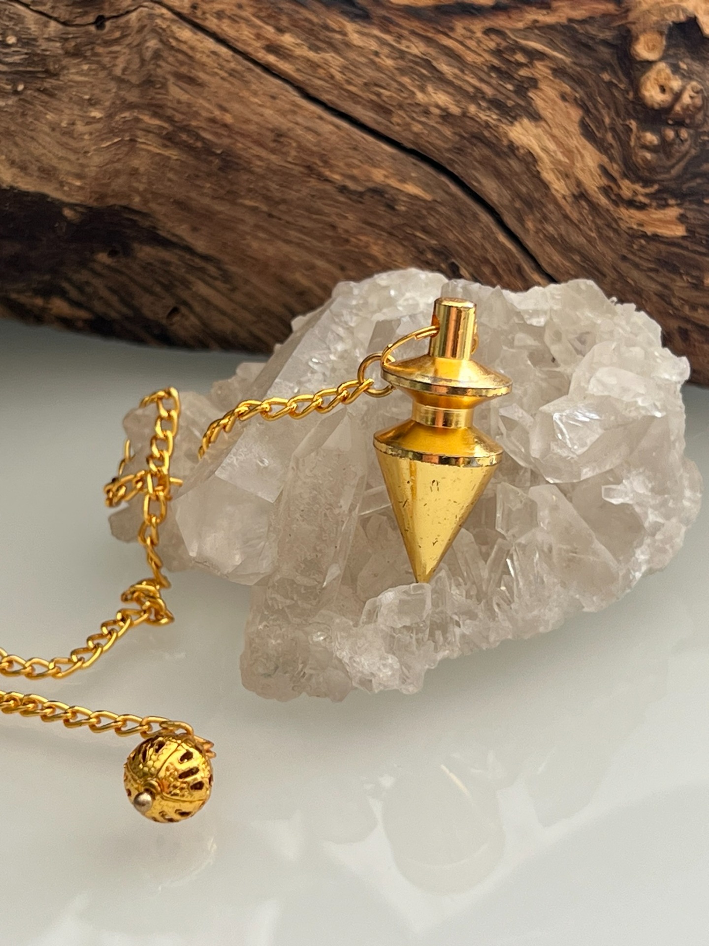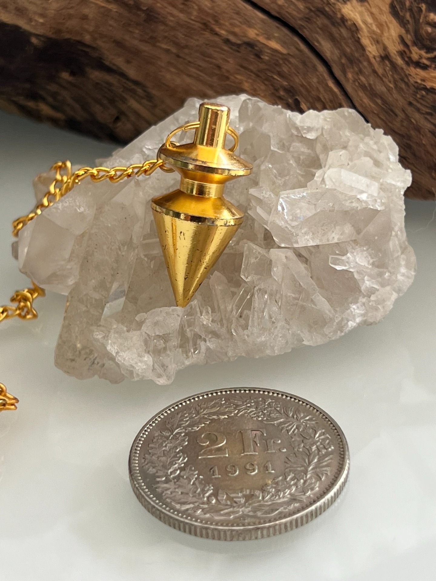 Métal de clarté et d'équilibre — le laiton favorise la fluidité des énergies et la précision des réponses. La forme conique, amplifiée par son disque central, apporte une vibration stable et régulière, idéale pour les recherches précises et l'exploration en radiesthésie.
