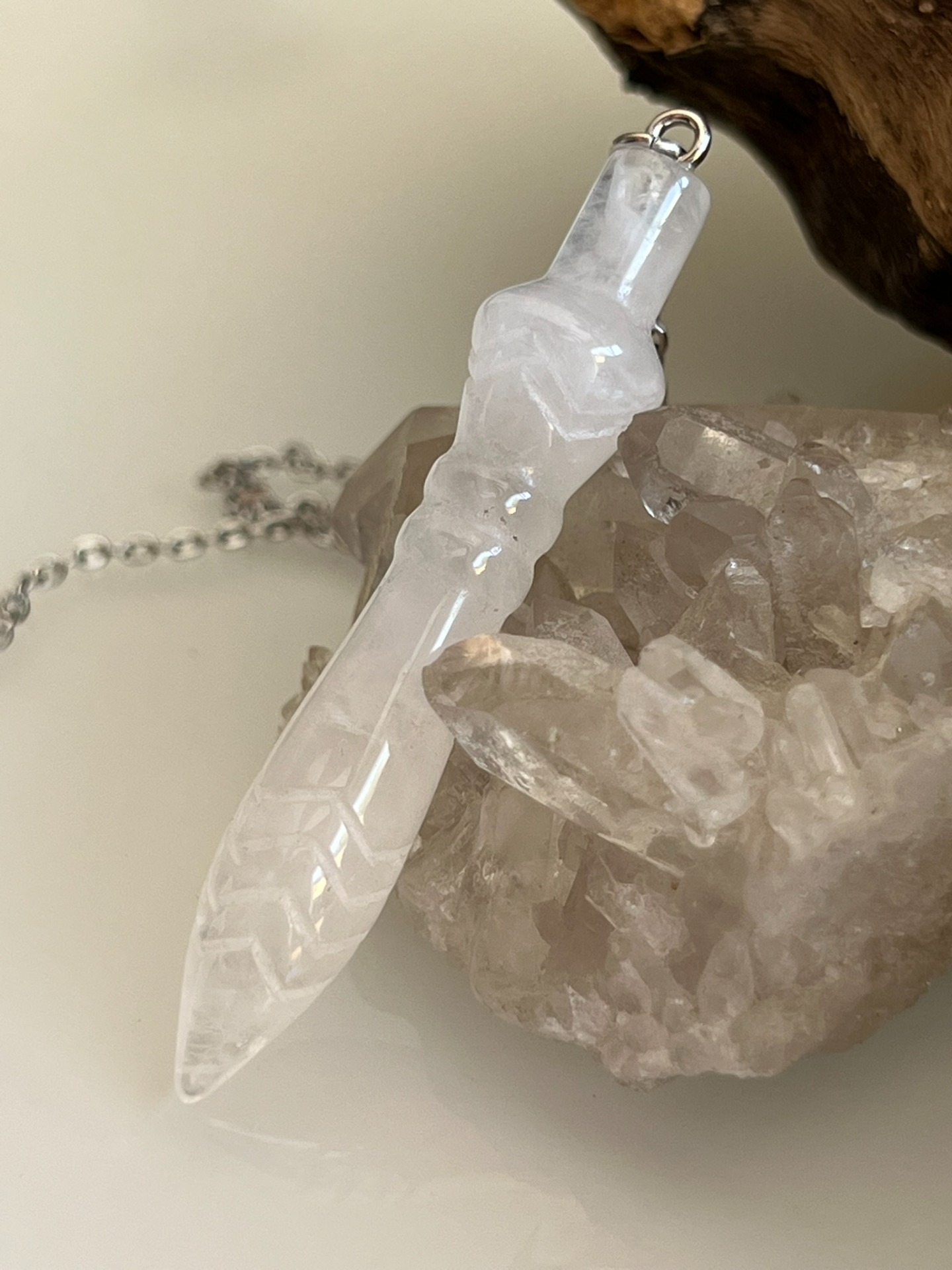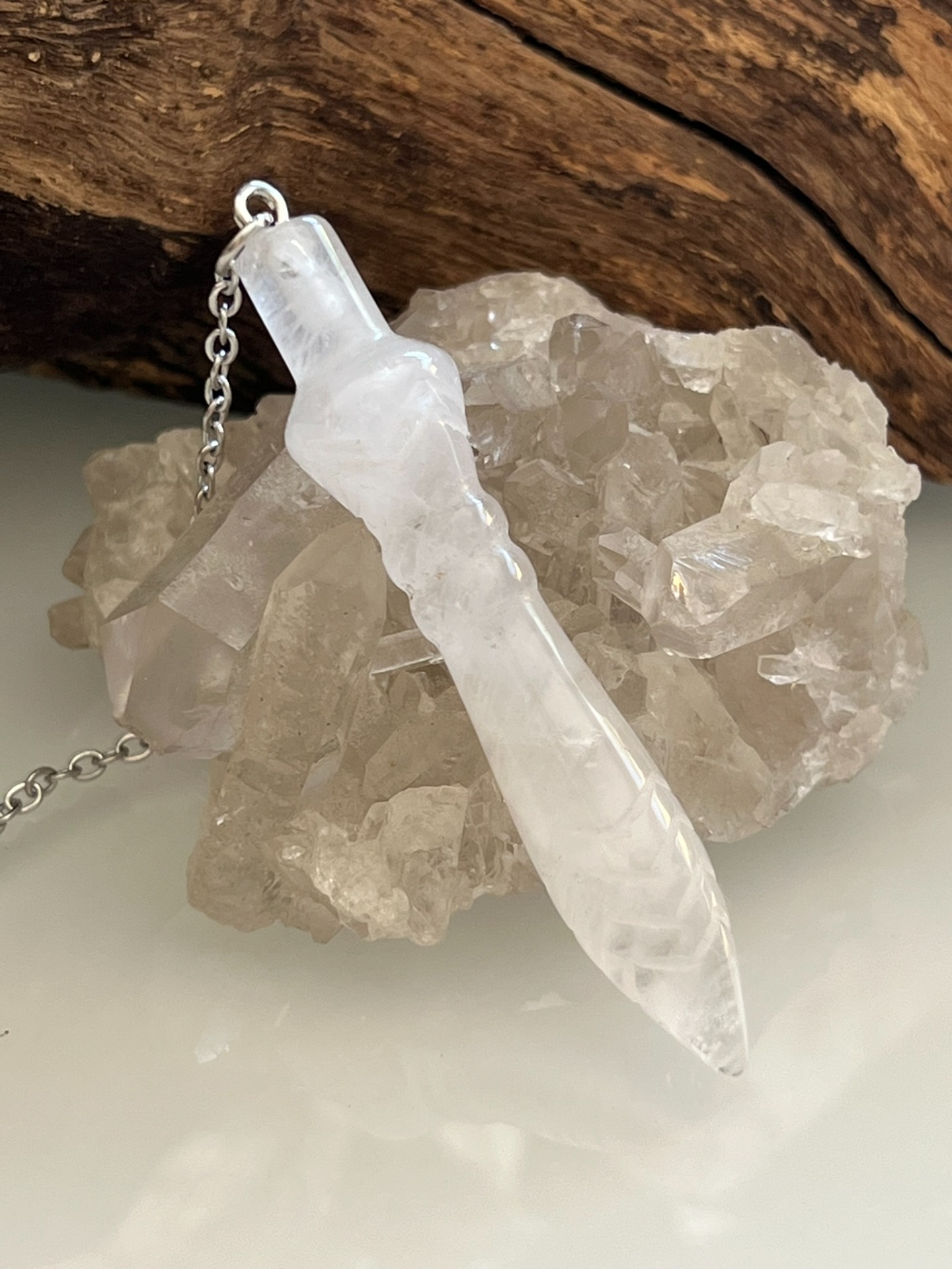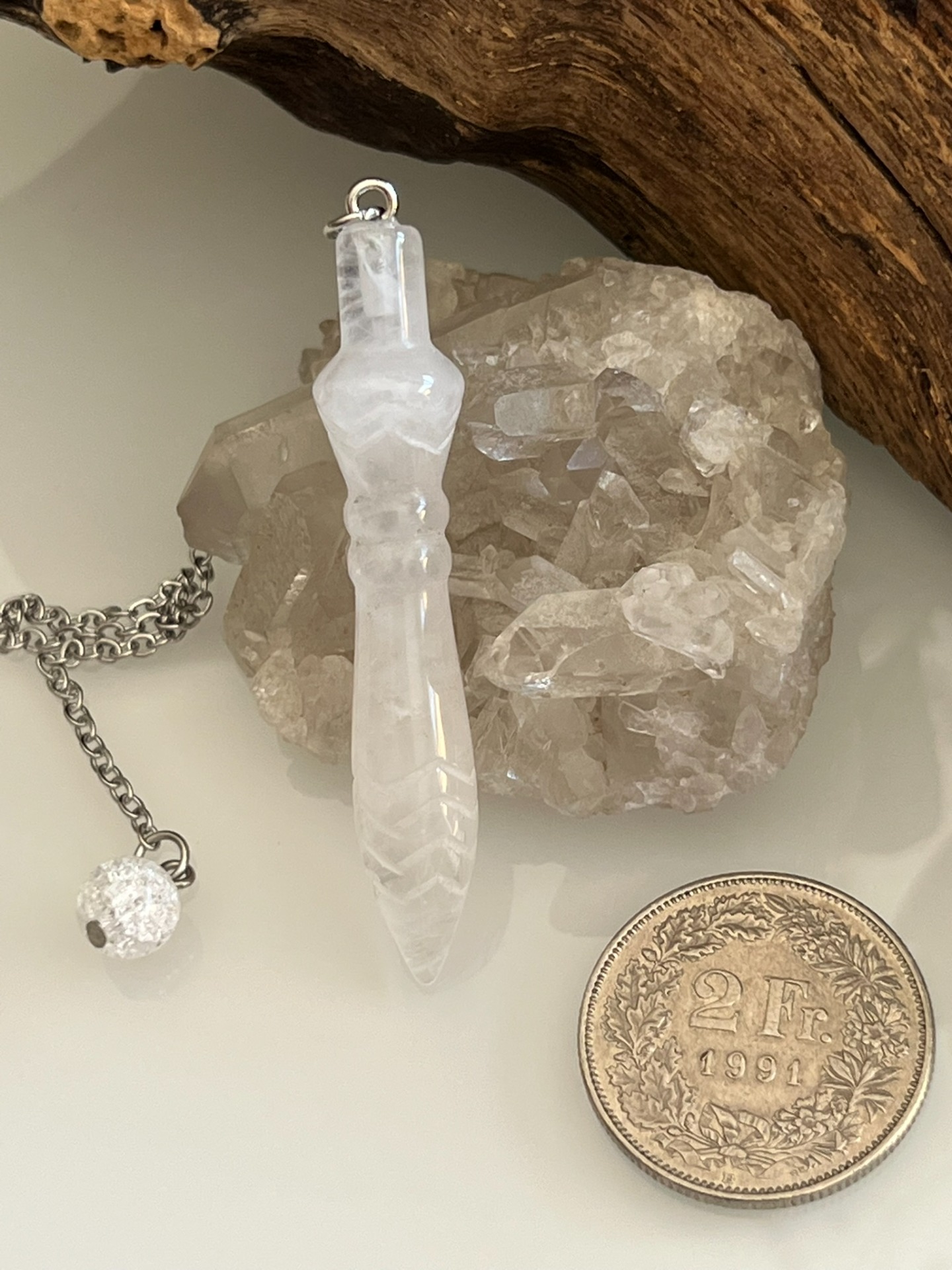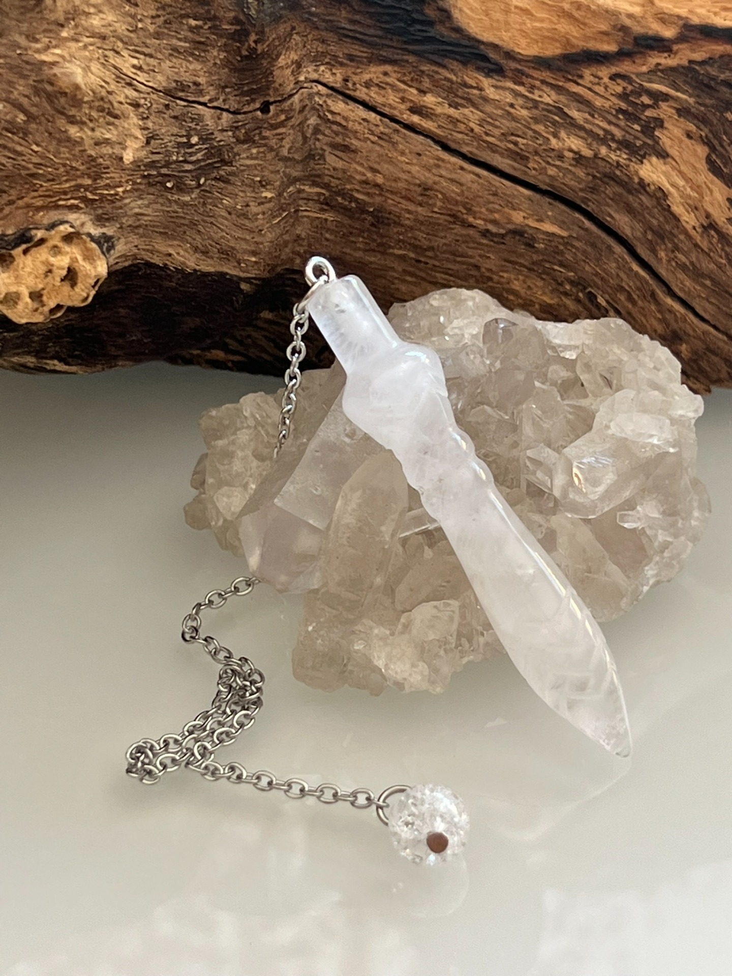 Pendule sculpté en pierre naturelle de Cristal de Roche, modèle Thot, accompagné de sa chaînette en métal argenté et d'une bille assortie.
