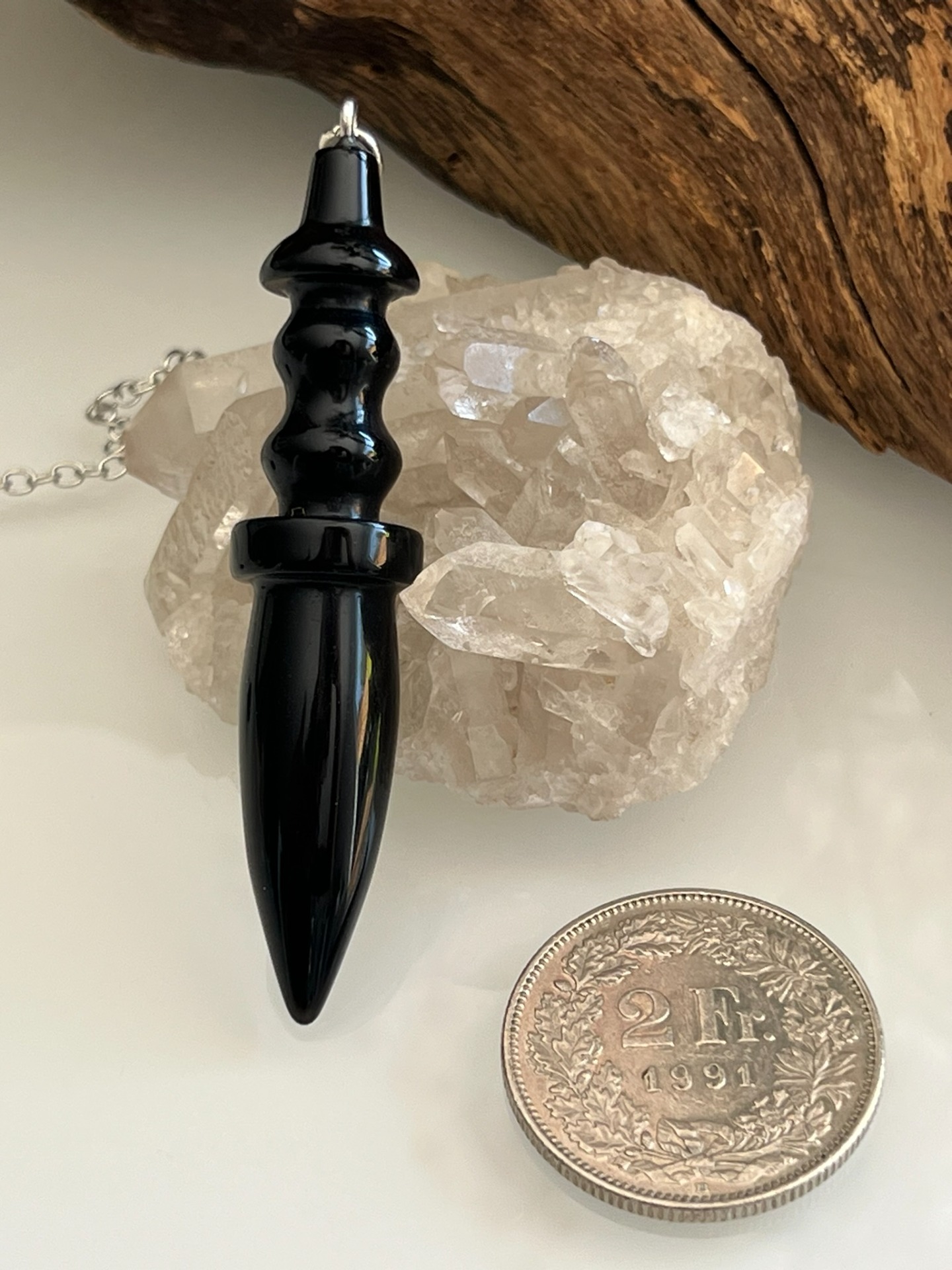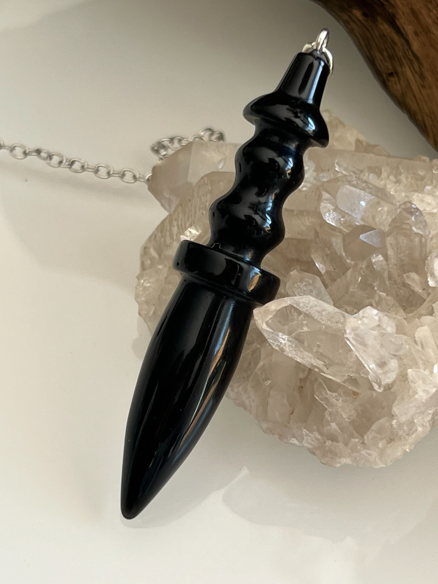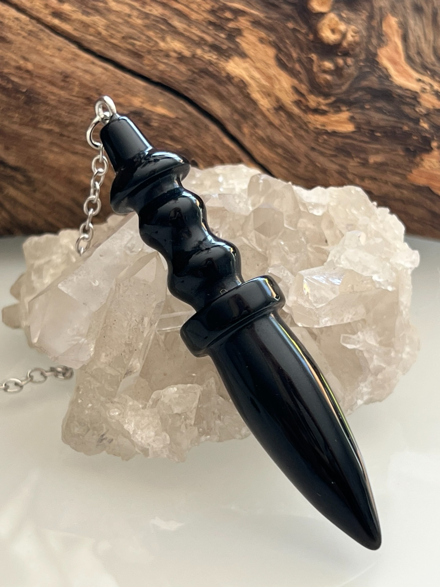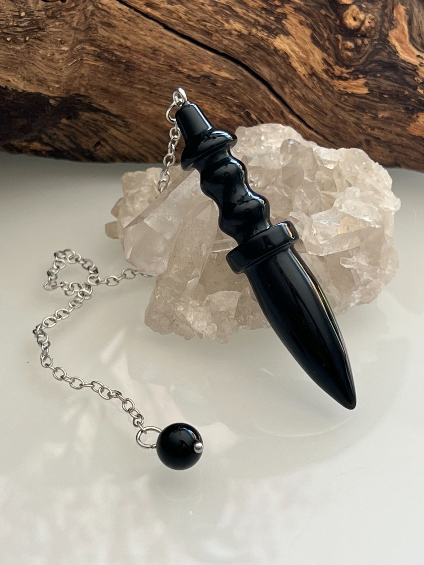 En radiesthésie, ce pendule de forme Thot amplifie la puissance vibratoire de l'Obsidienne : il donne des réponses précises et tranchantes, tout en renforçant l'intuition. Il est idéal pour les recherches spirituelles, la protection énergétique et le travail d'introspection.