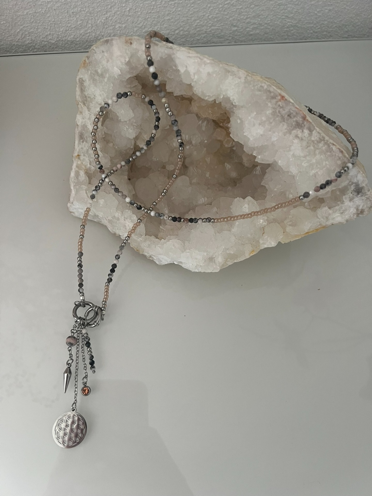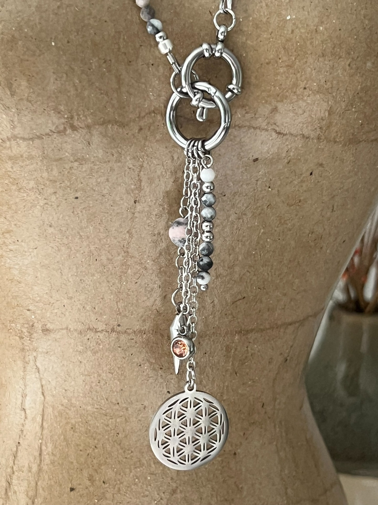 Le pendentif Fleur de Vie, symbole d’harmonie universelle, s’accompagne de fines chaînes argentées et de perles en verre teinté aux reflets nacrés, apportant équilibre et éclat.