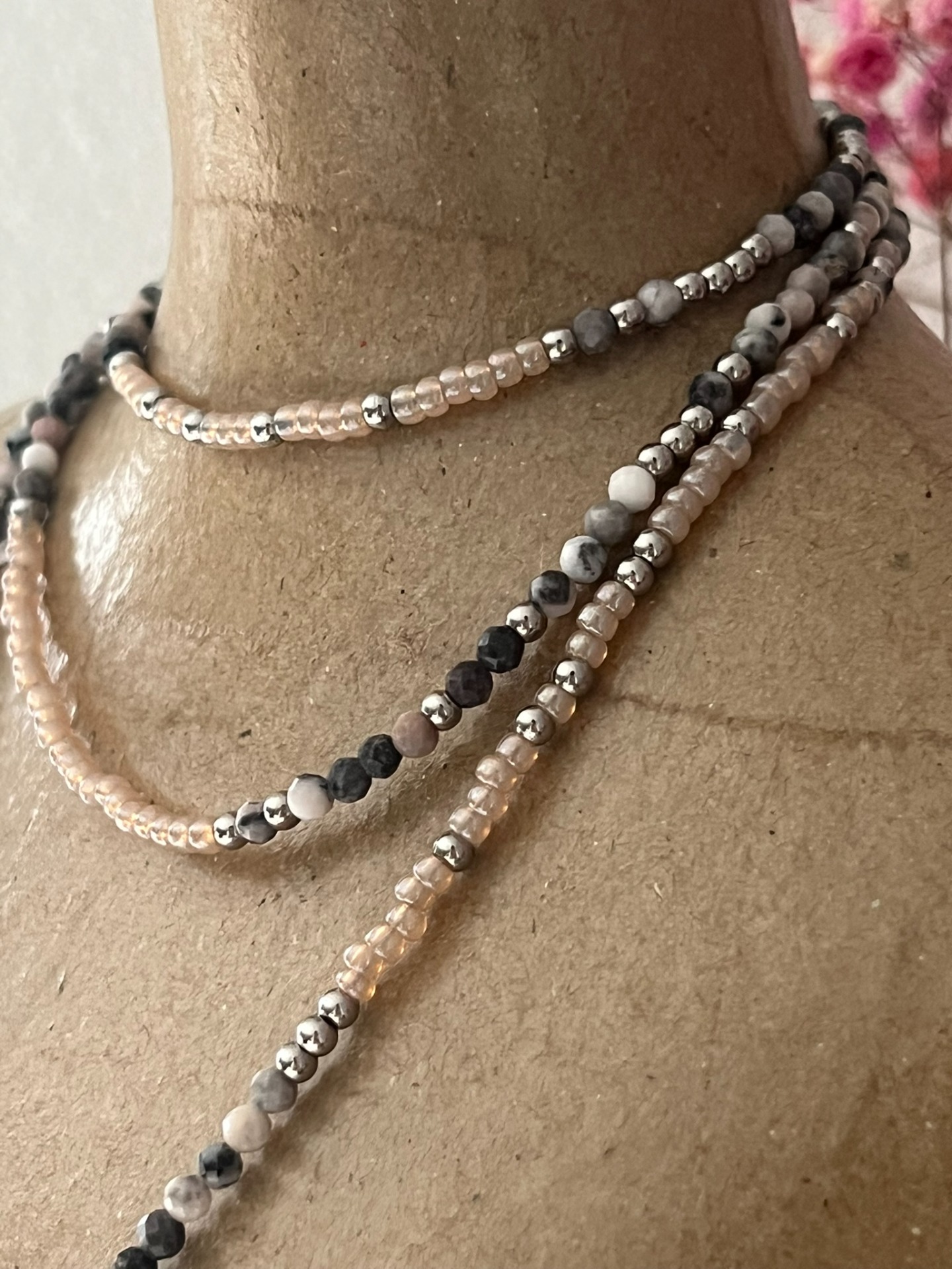 Matériaux : Jaspe Zèbre 3 mm, acier inoxydable argenté, perles en verre teinté, fil d’acier