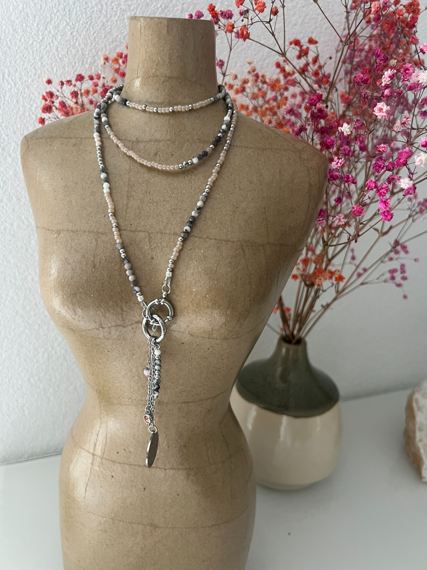 Ce sautoir lumineux associe la force contrastée du Jaspe Zèbre, pierre d’équilibre et de courage, à la brillance intemporelle de l’acier inoxydable argenté.