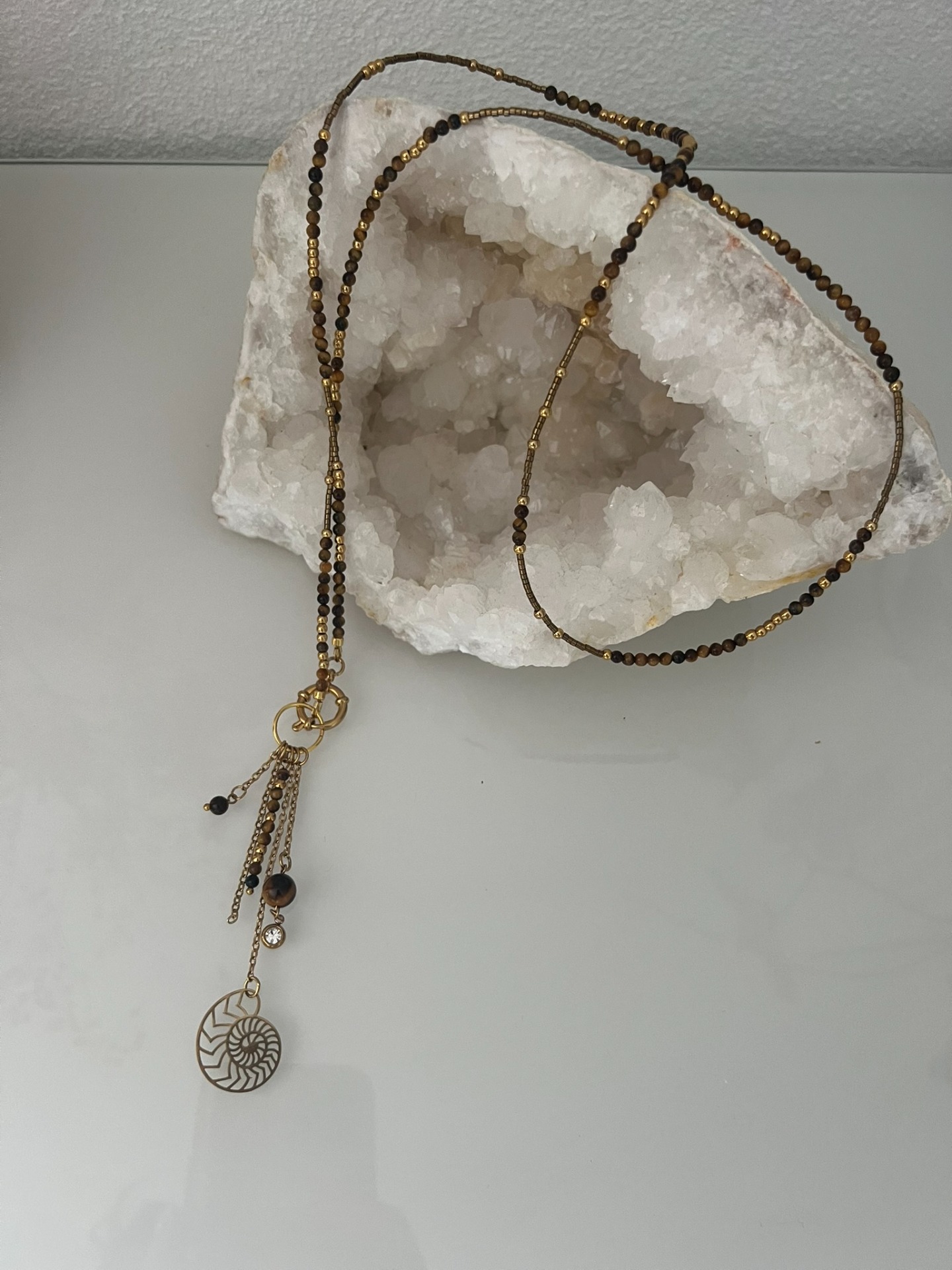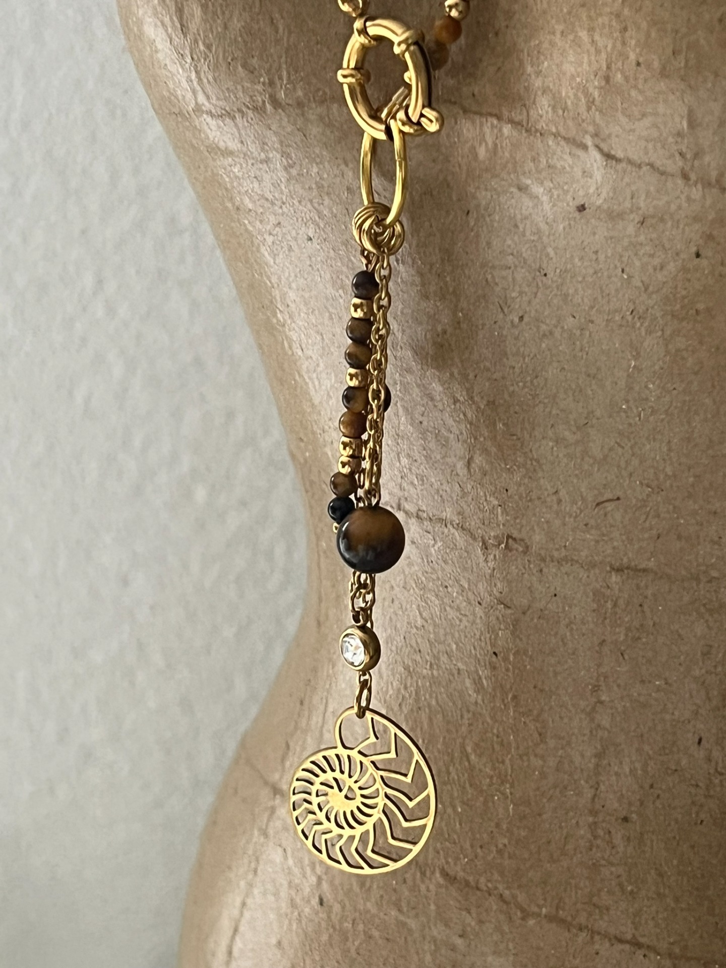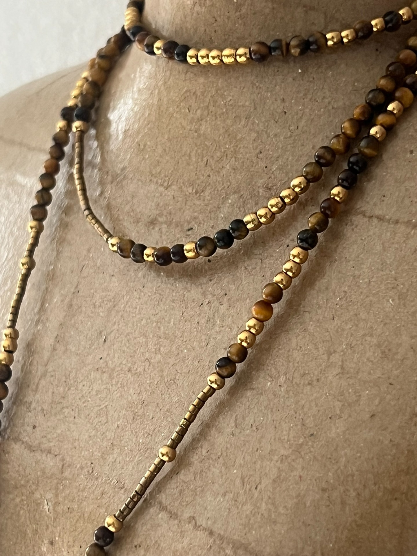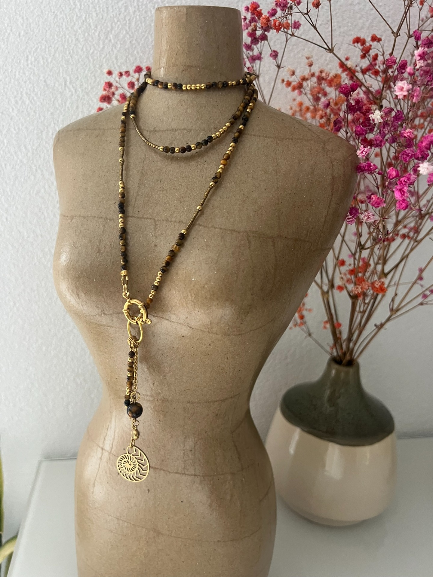 Ce sautoir rayonnant associe la puissance chaleureuse de l'Œil de Tigre (perles lisses de 3 mm) à la brillance intemporelle de l'acier inoxydable doré.