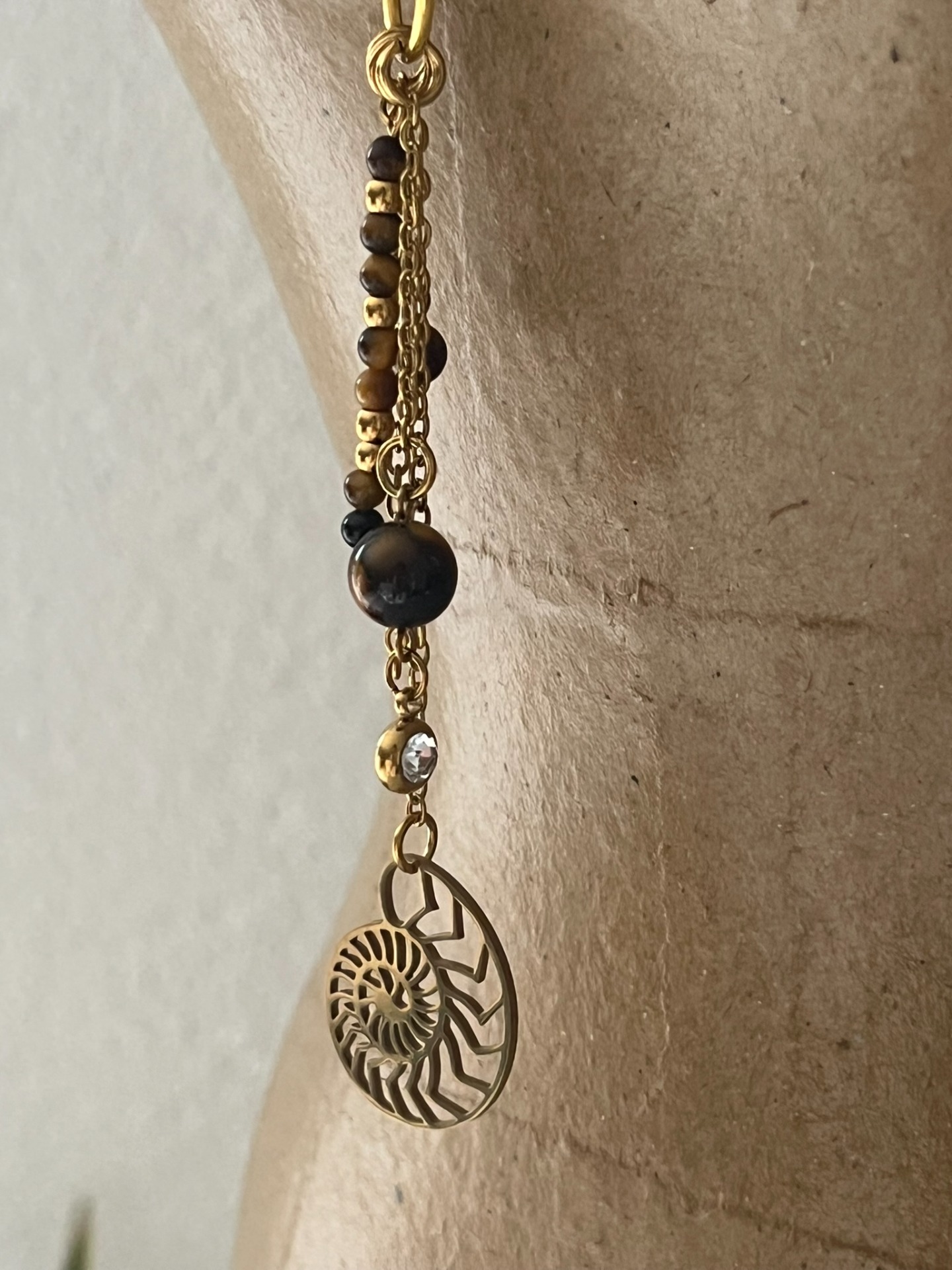 Matériaux : Œil de Tigre 3 mm, acier inoxydable doré, perles en verre teinté, fil d'acier