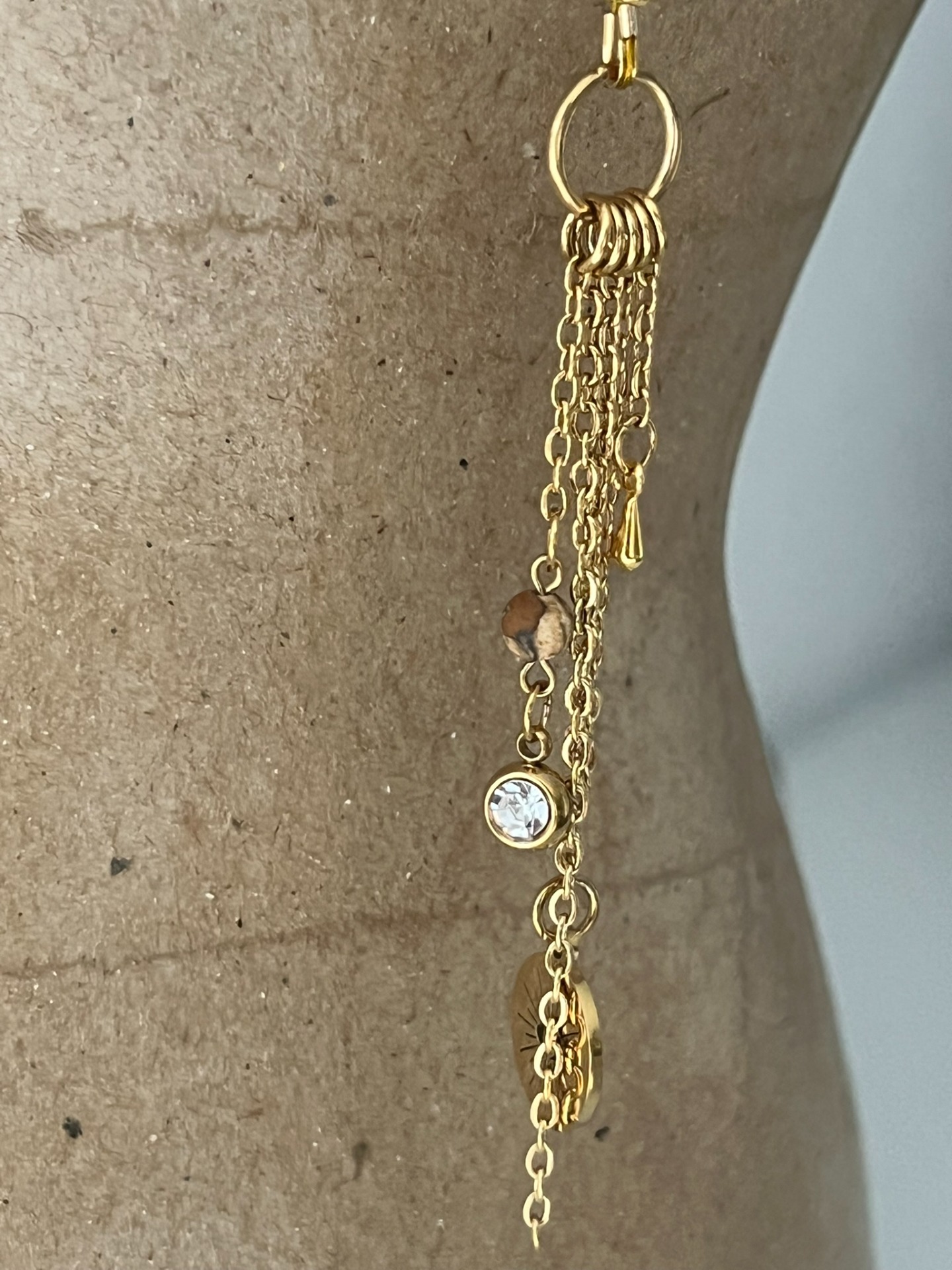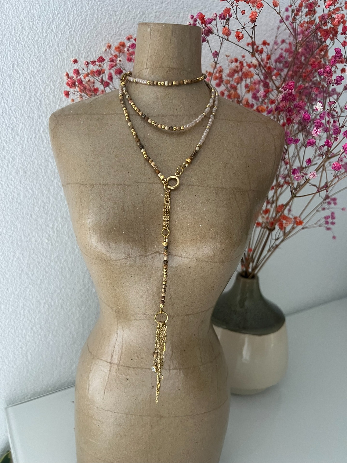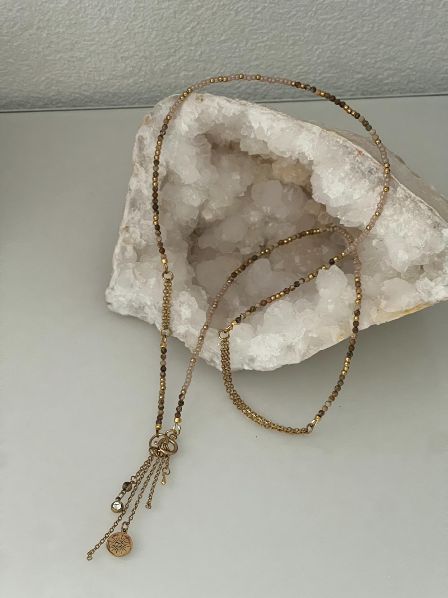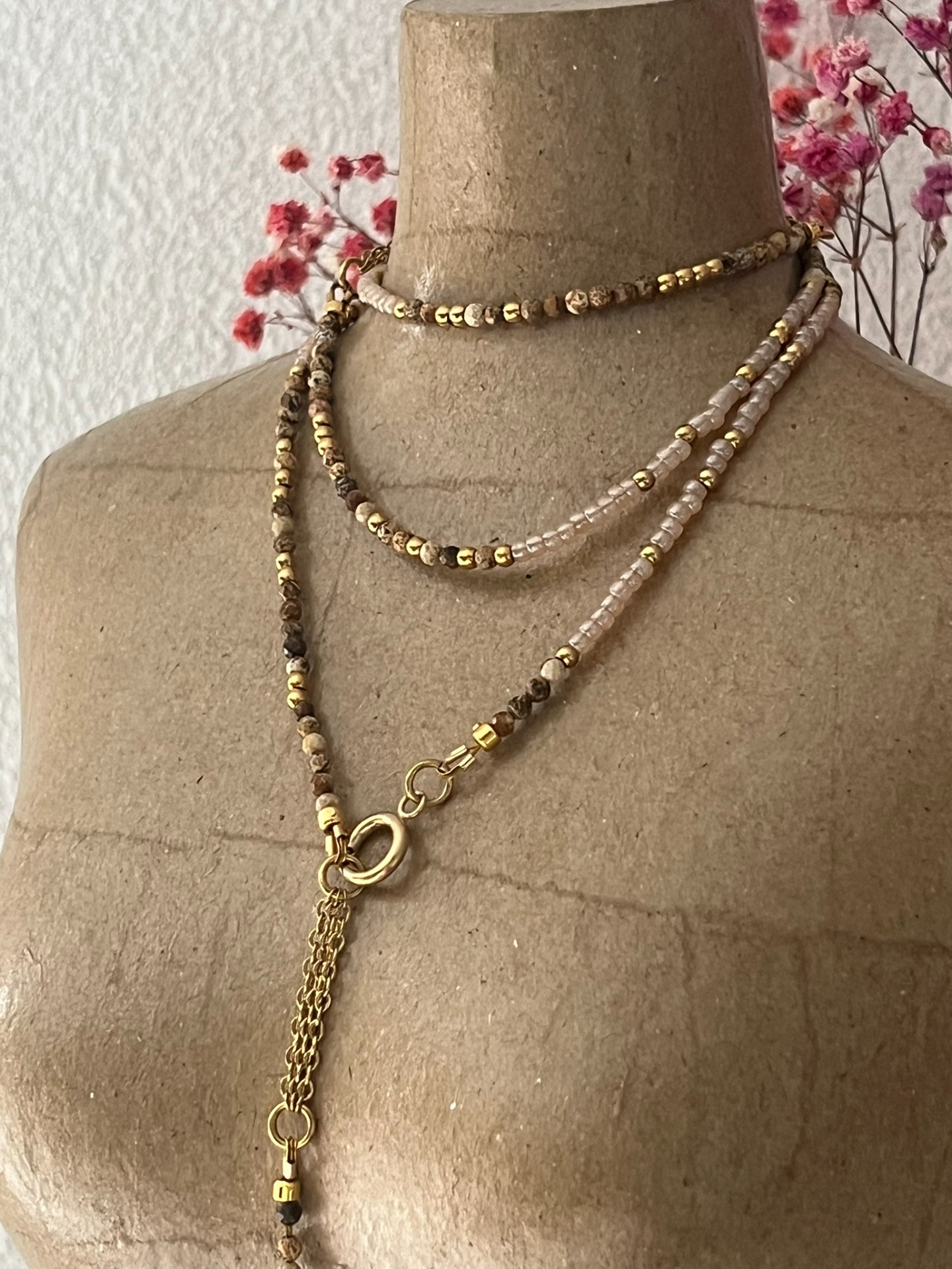 Ce sautoir empreint de douceur naturelle met en lumière la beauté du Jaspe Paysage, pierre aux nuances sable et terre, associée à l'éclat chaud de l'acier inoxydable doré.