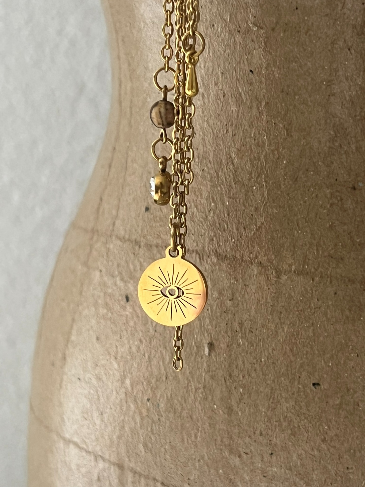 Son pendentif Œil protecteur et ses fines chaînes dorées évoquent la sécurité intérieure, la sagesse et la connexion à la Terre.